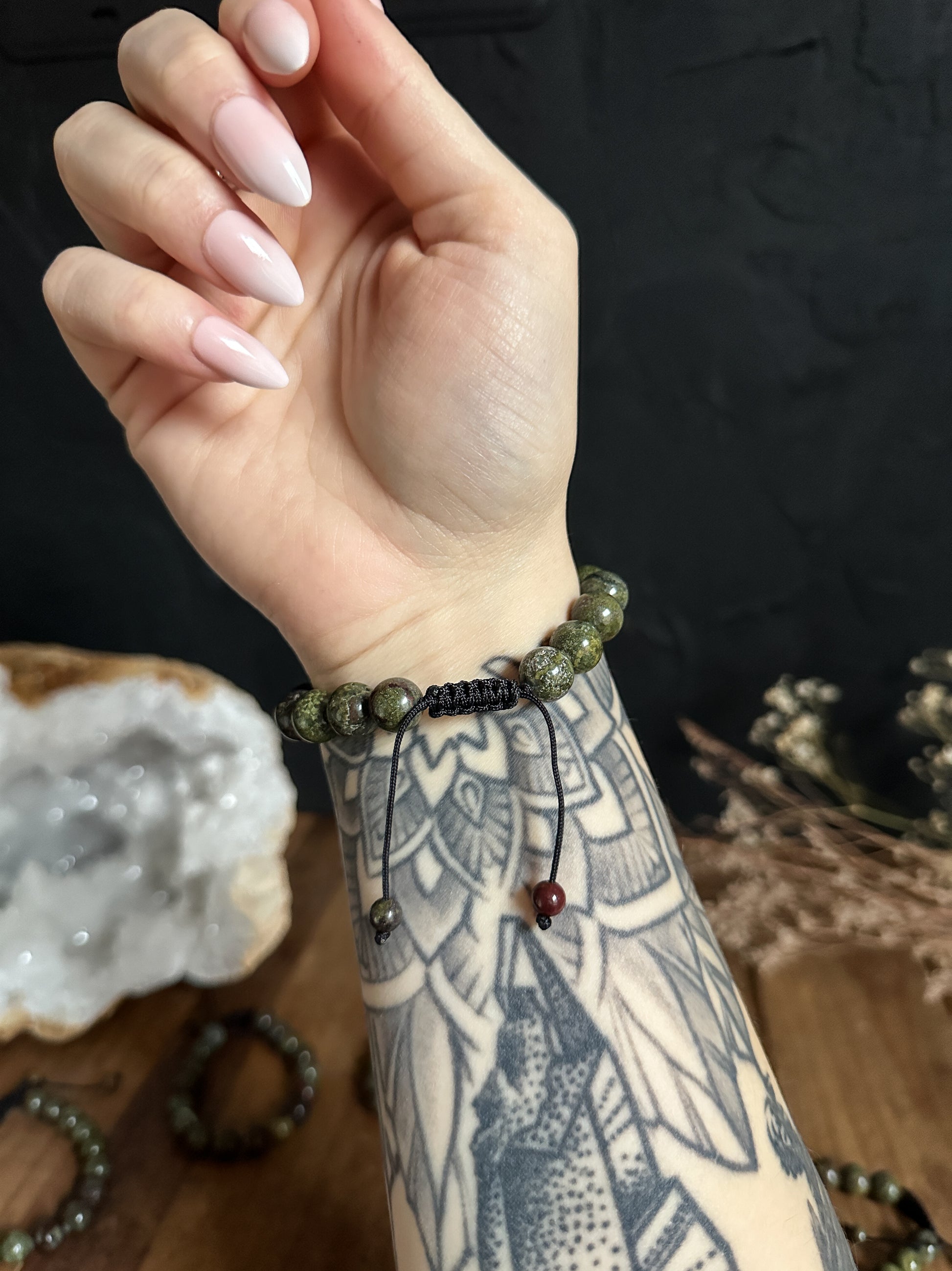 Healing Properties: Dragon's Blood, with its rich green and red hues, aligns with the root and heart chakras. Recognized for its distinctive appearance resembling the mythical dragon's blood, this crystal is believed to enhance strength, courage, and love. It is associated with promoting grounding energy, emotional healing, and the release of past traumas. Dragon Blood Jasper, also known as Dragon Stone, stimulates creativity, attracts money and love, and helps you to achieve your goals. With its green and red colouring, it connects directly to the Heart Chakra, helping you to hear your heart, and encouraging love, compassion, and forgiveness Dragon's Blood is thought to assist in connecting with the earth's energy, fostering inner strength, and supporting a harmonious balance between courage and compassion.