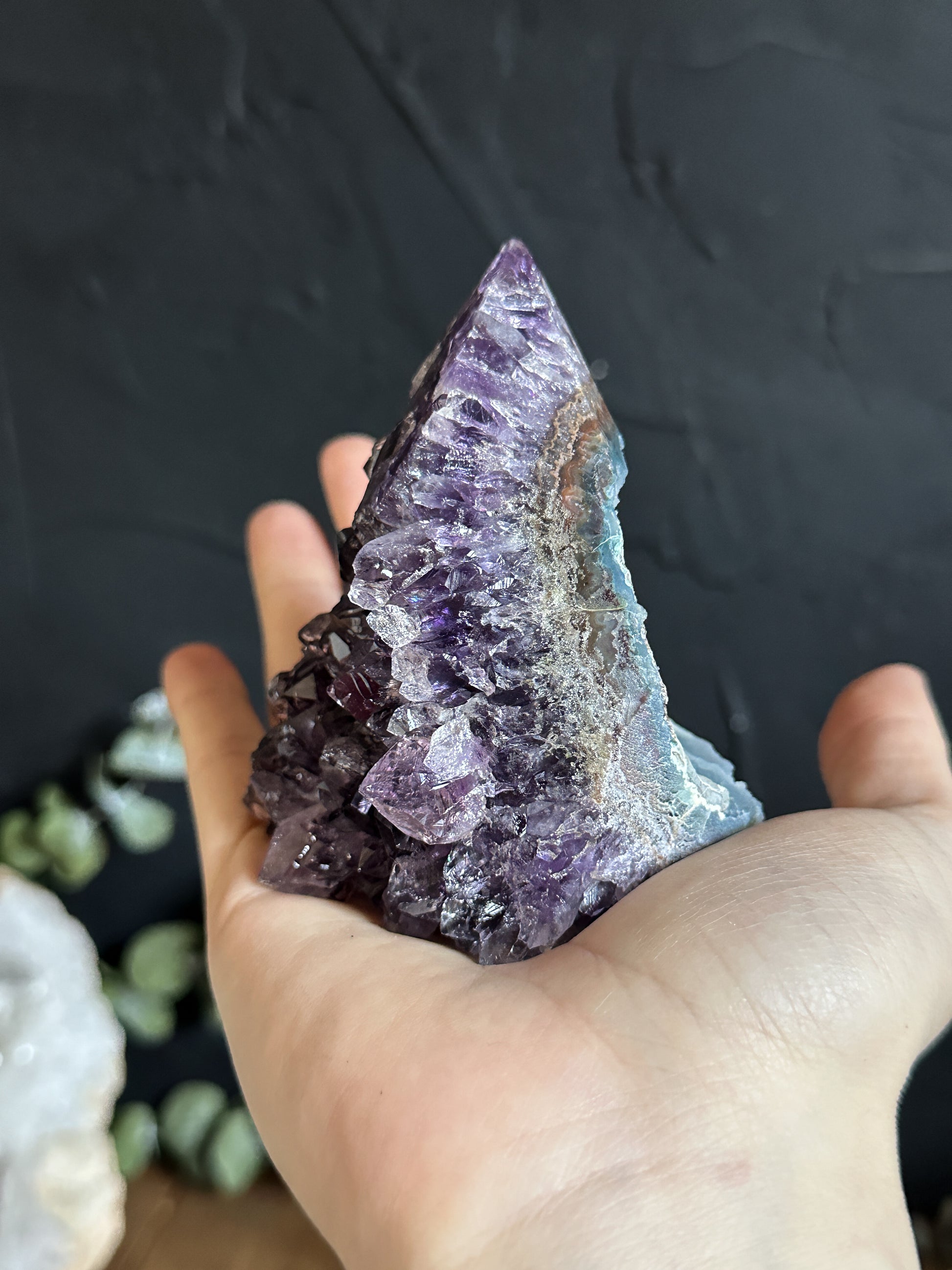 Look at how incredible this Geode is ! The face features wonderful deep purple points and the back side features rough Blue Agate!Measuring: 3.5" x 2.70" x 3"