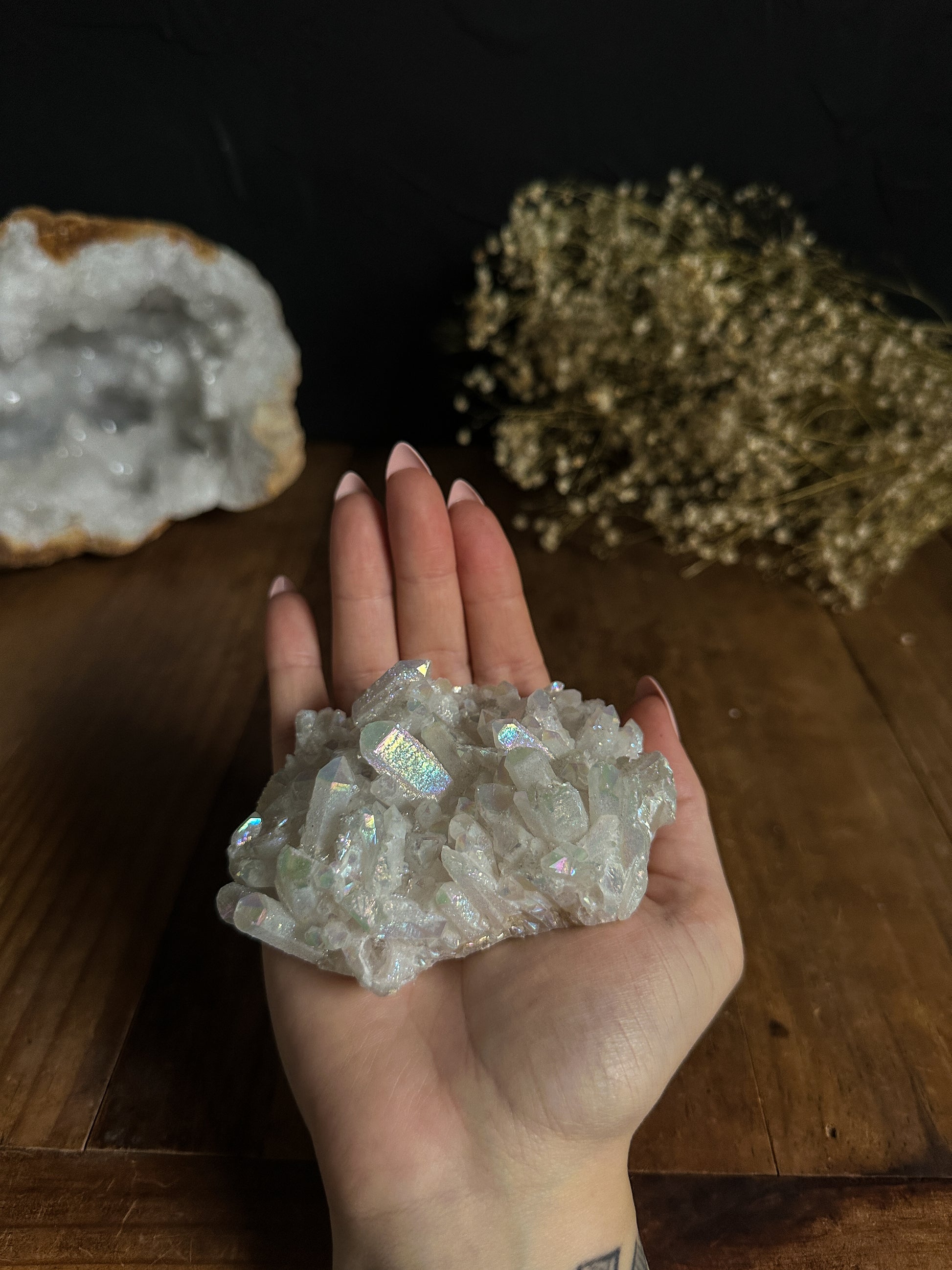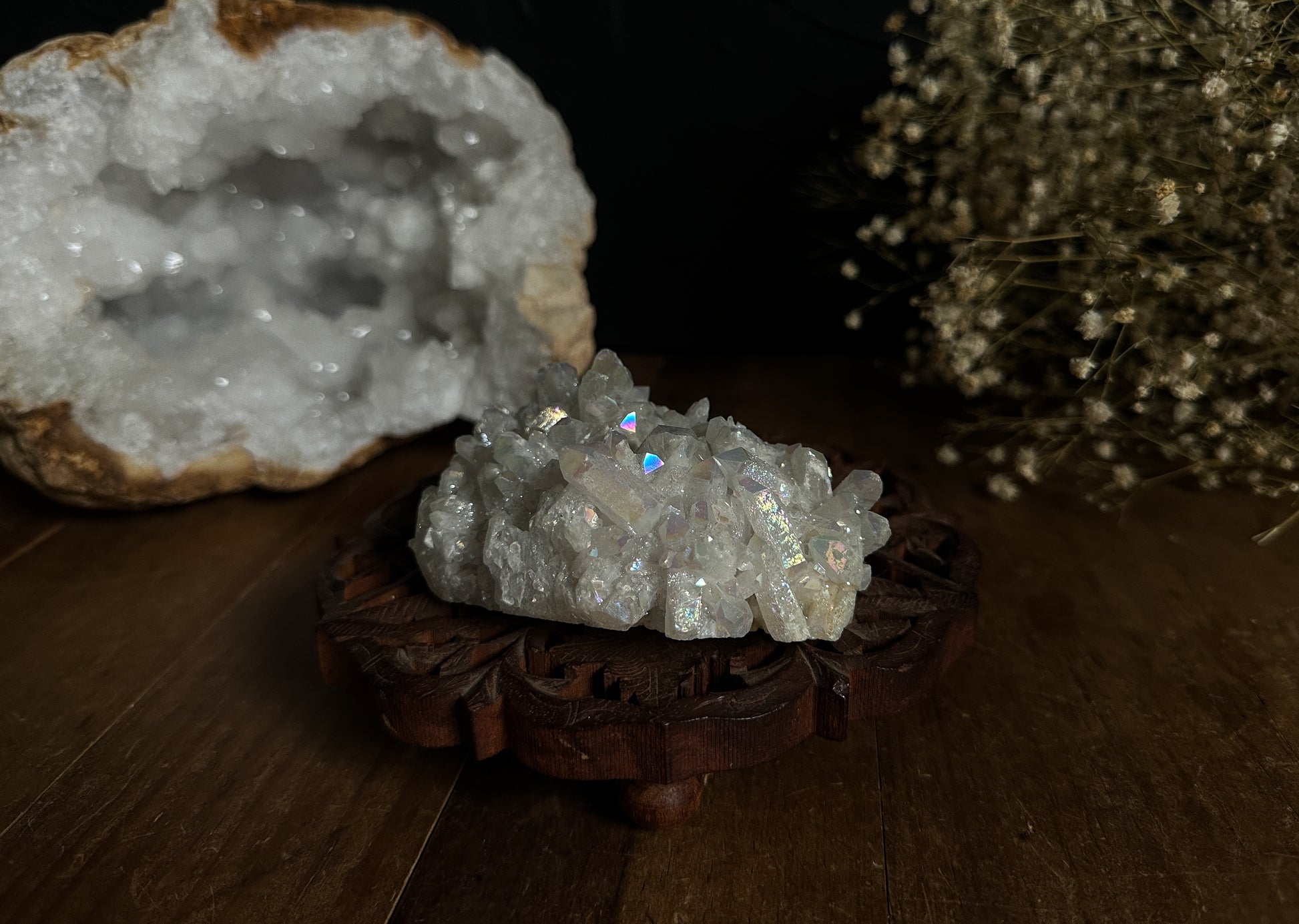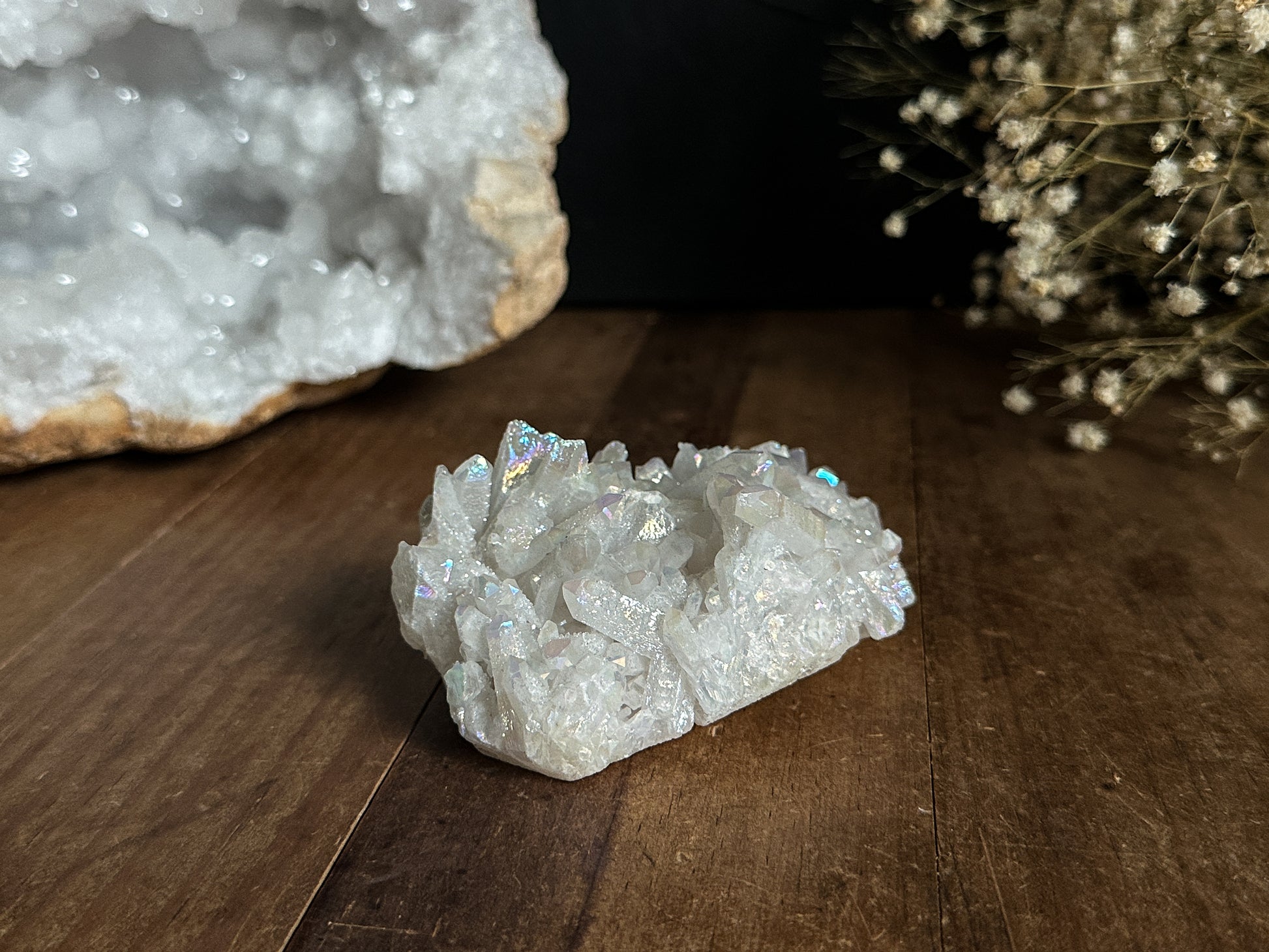 Affirmation: "I am connected to divine energies and in harmonious balance. Angel Aura Quartz's ethereal energy surrounds me, promoting intuition, peace, and a harmonious alignment with my higher self."