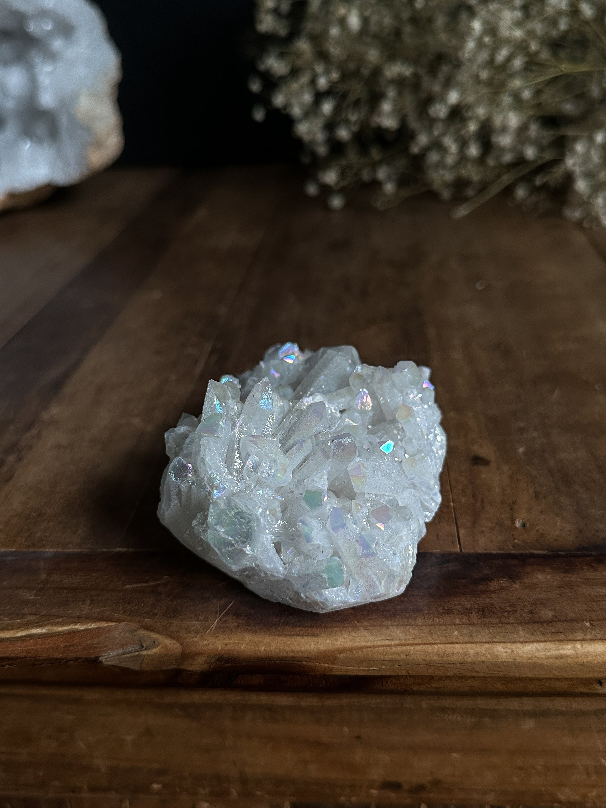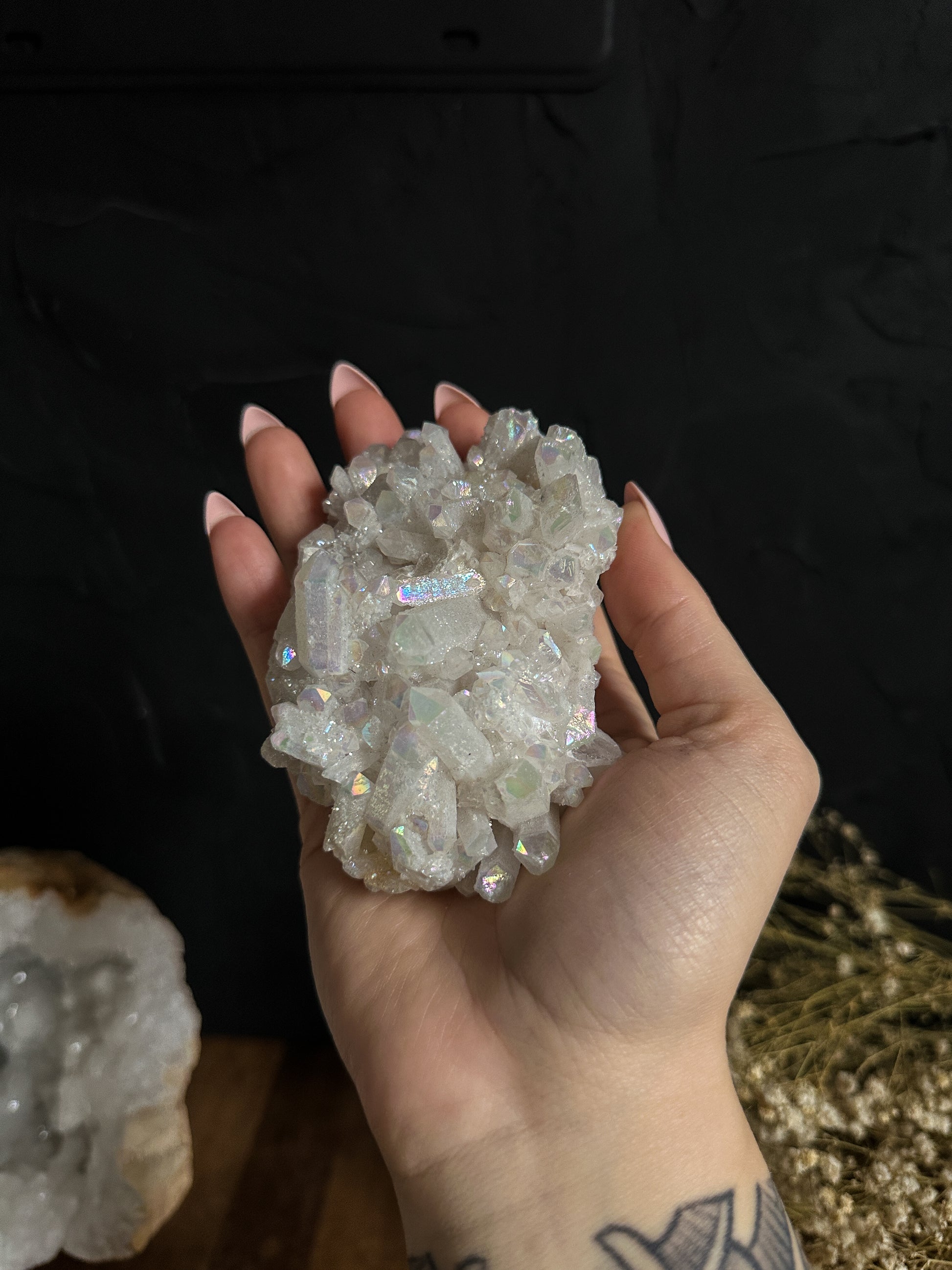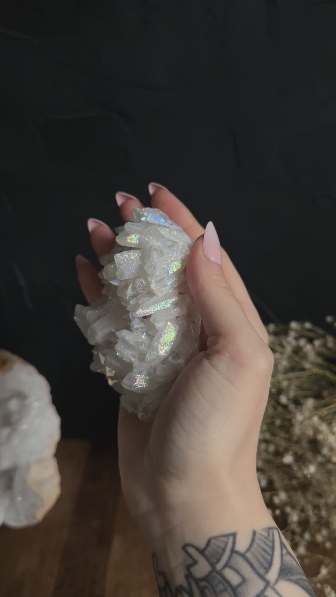 Affirmation: "I am connected to divine energies and in harmonious balance. Angel Aura Quartz's ethereal energy surrounds me, promoting intuition, peace, and a harmonious alignment with my higher self."