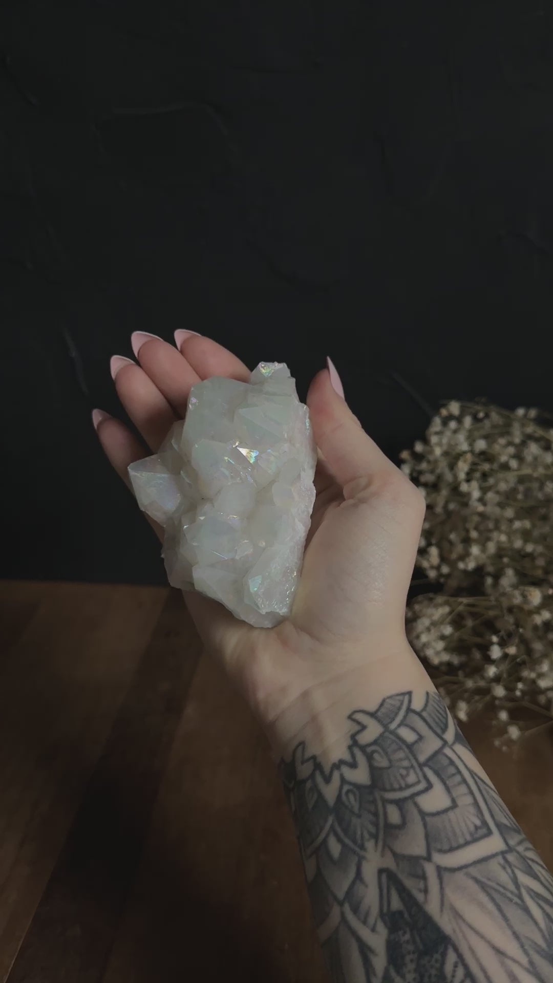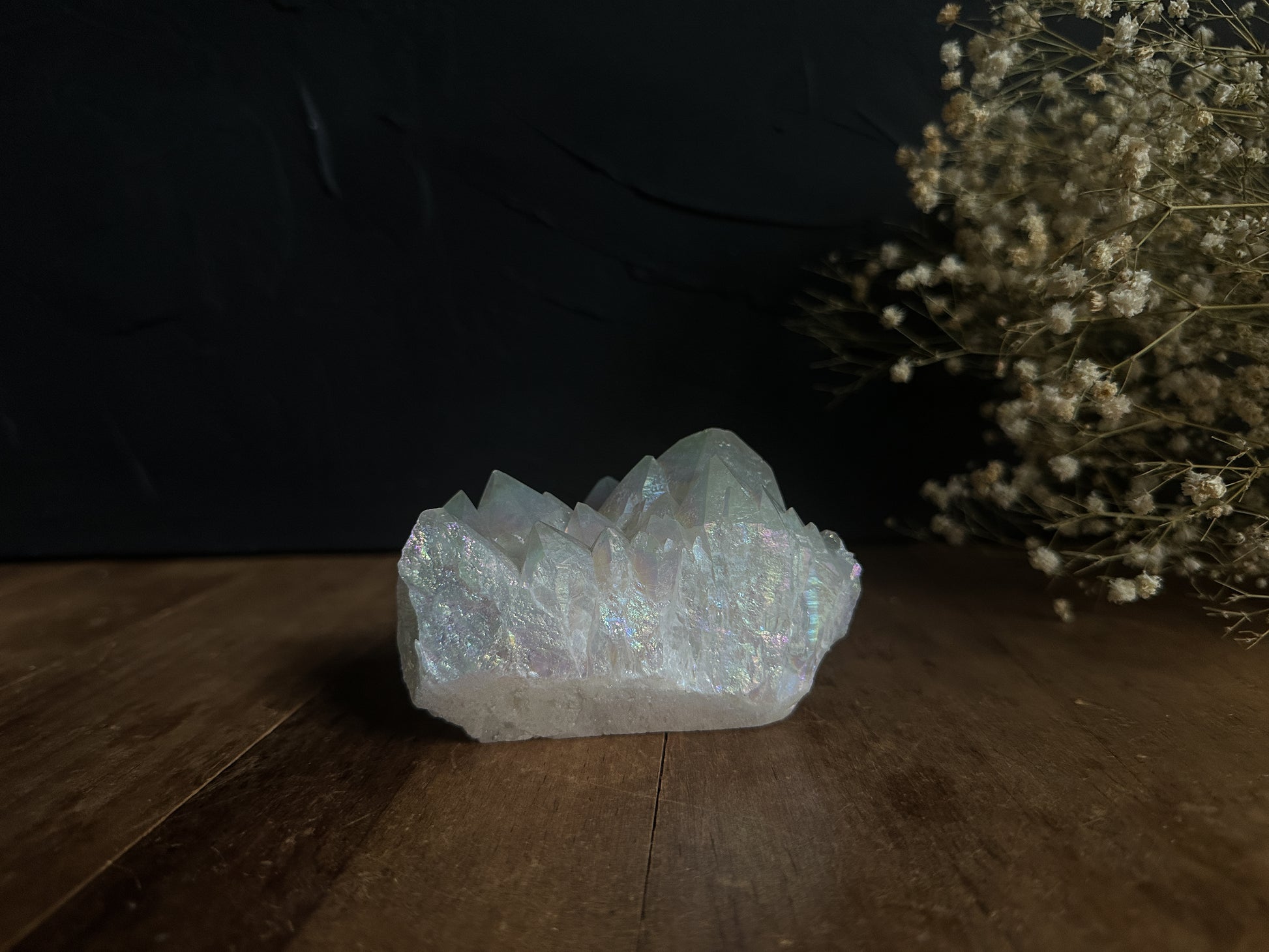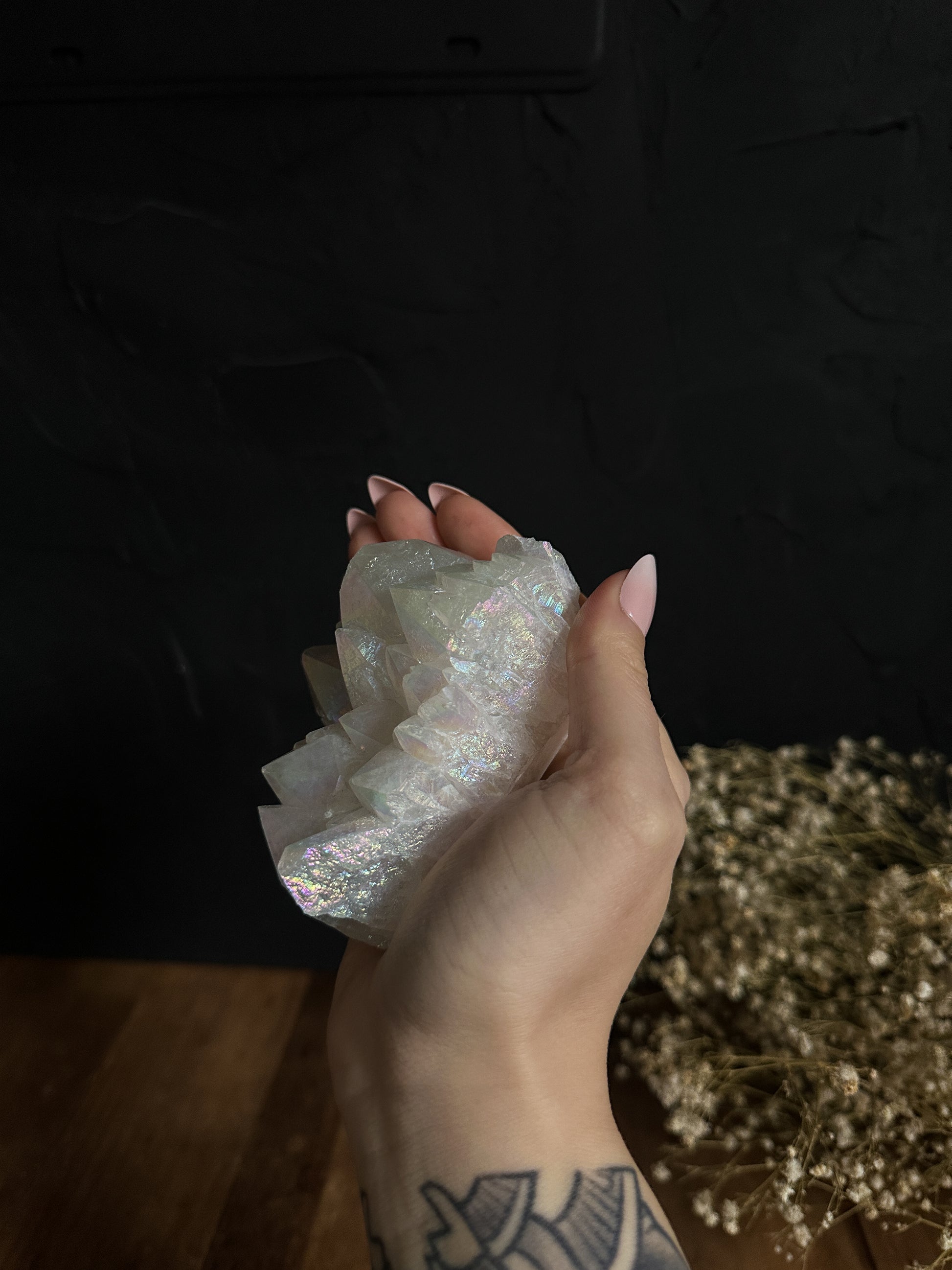 Affirmation: "I am connected to divine energies and in harmonious balance. Angel Aura Quartz's ethereal energy surrounds me, promoting intuition, peace, and a harmonious alignment with my higher self."