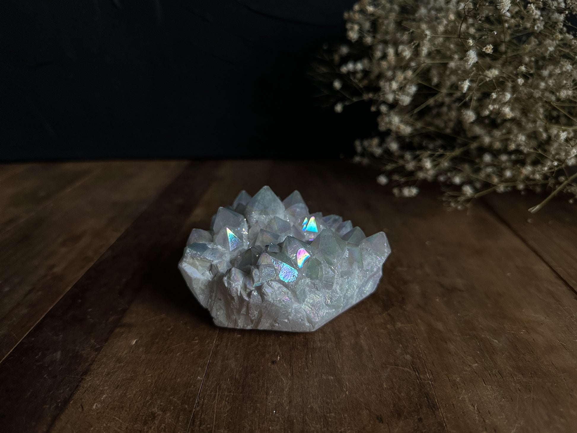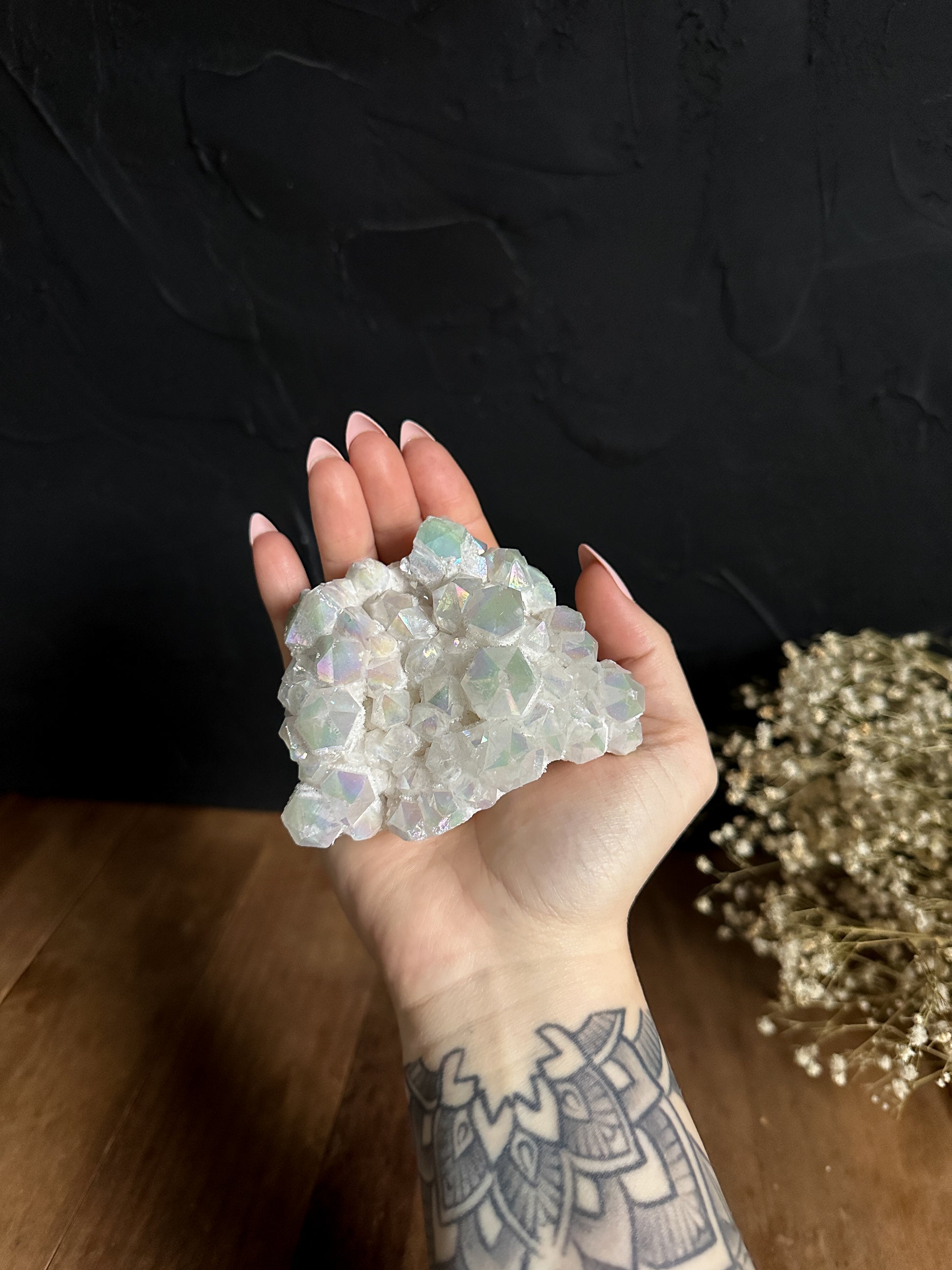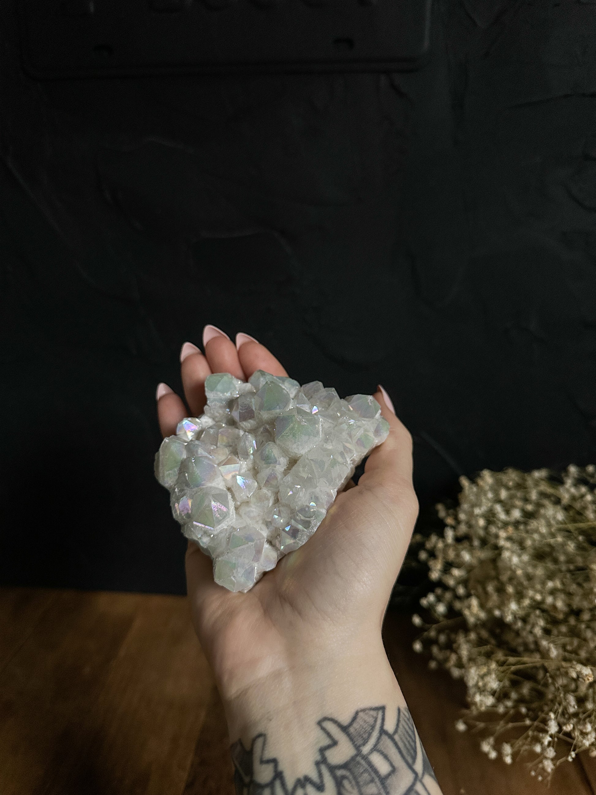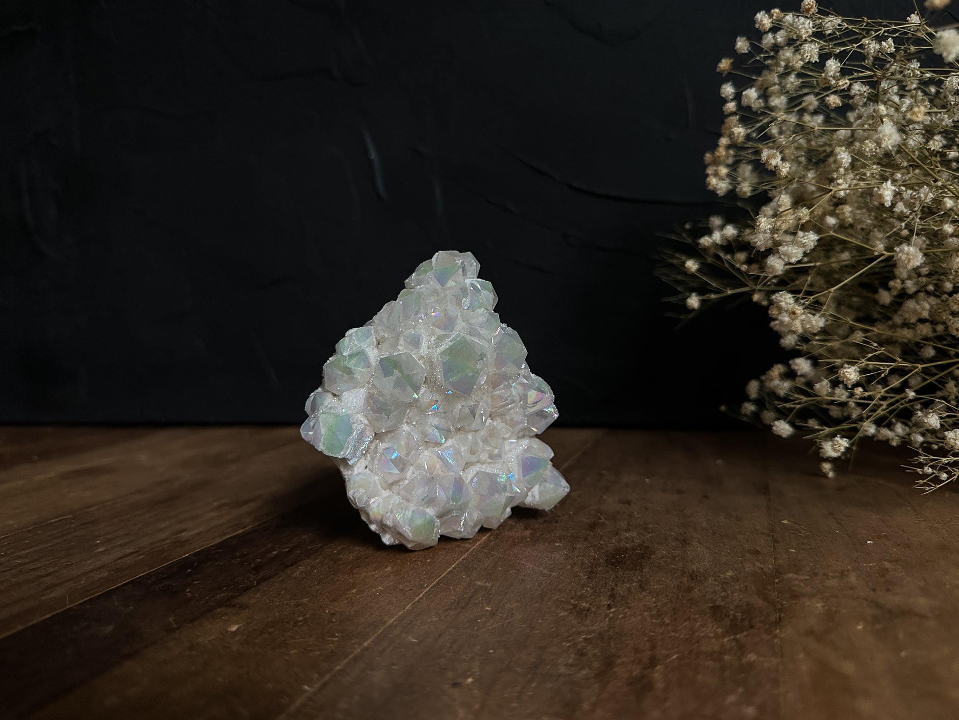 Affirmation: "I am connected to divine energies and in harmonious balance. Angel Aura Quartz's ethereal energy surrounds me, promoting intuition, peace, and a harmonious alignment with my higher self."