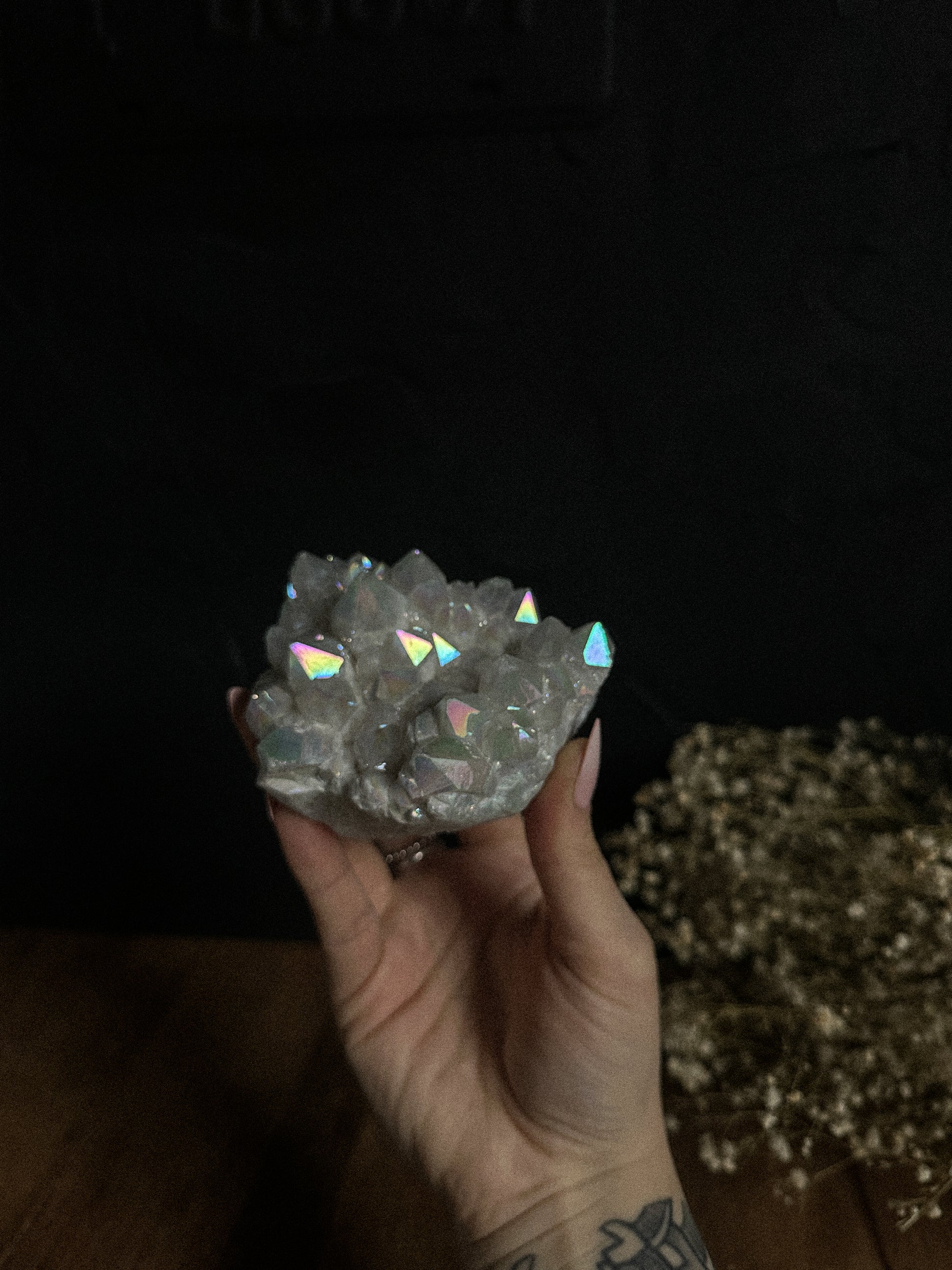 Angel Aura Quartz is created by heating a piece of Quartz in a chamber, once heated to a certain temperature Platinum and Silver (sometimes other metals as well) vapour is added. The Platinum and Silver fuse to the hot crystal which creates a silvery rainbow iridescence shimmer.
