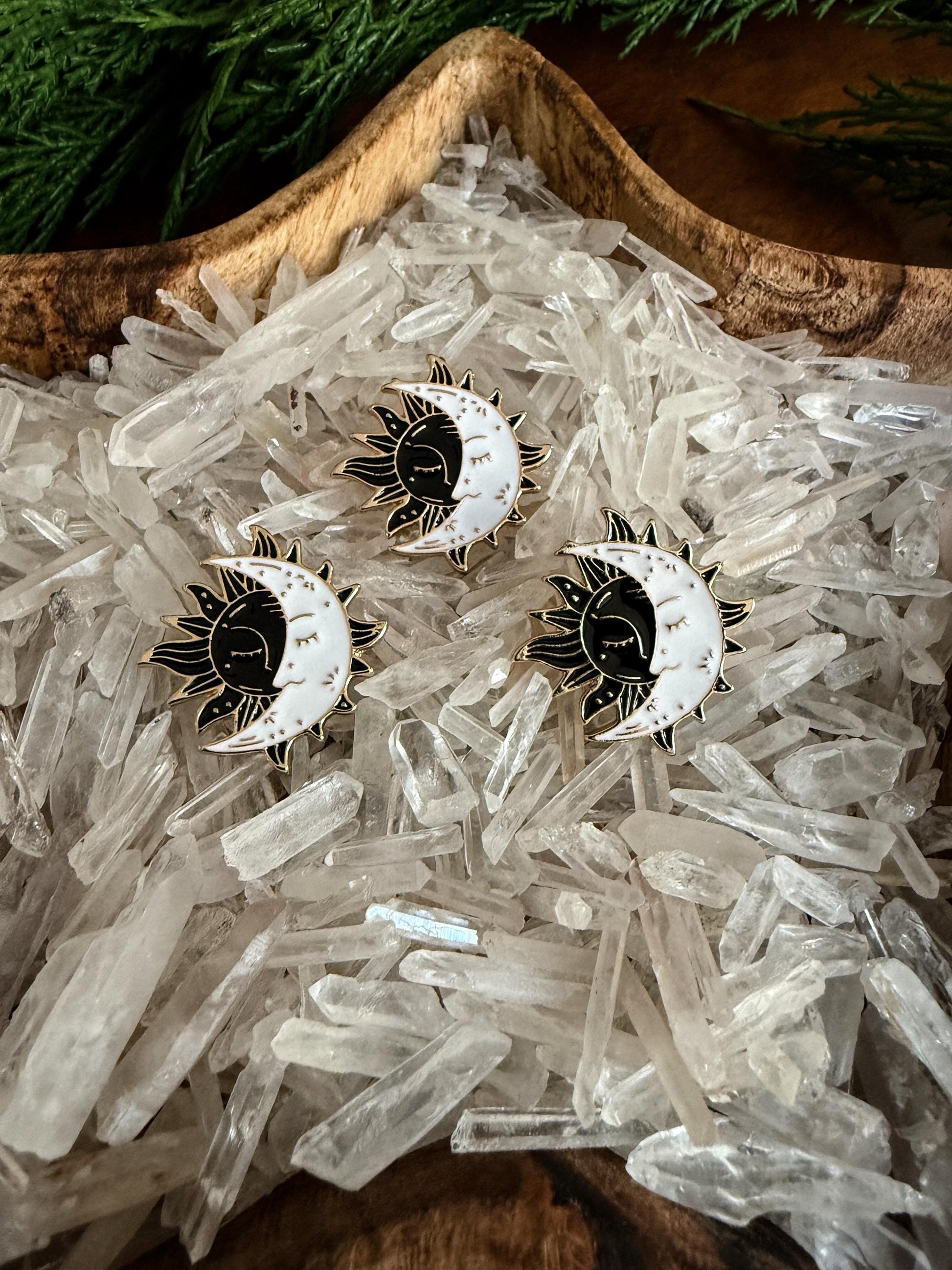 Embrace the magic of day and night with this stunning Black Sun and White Moon Enamel Pin. Designed for celestial enthusiasts and witchy souls, this beautifully crafted pin combines the timeless symbolism of the Sun and Moon into a single, mesmerizing accessory.