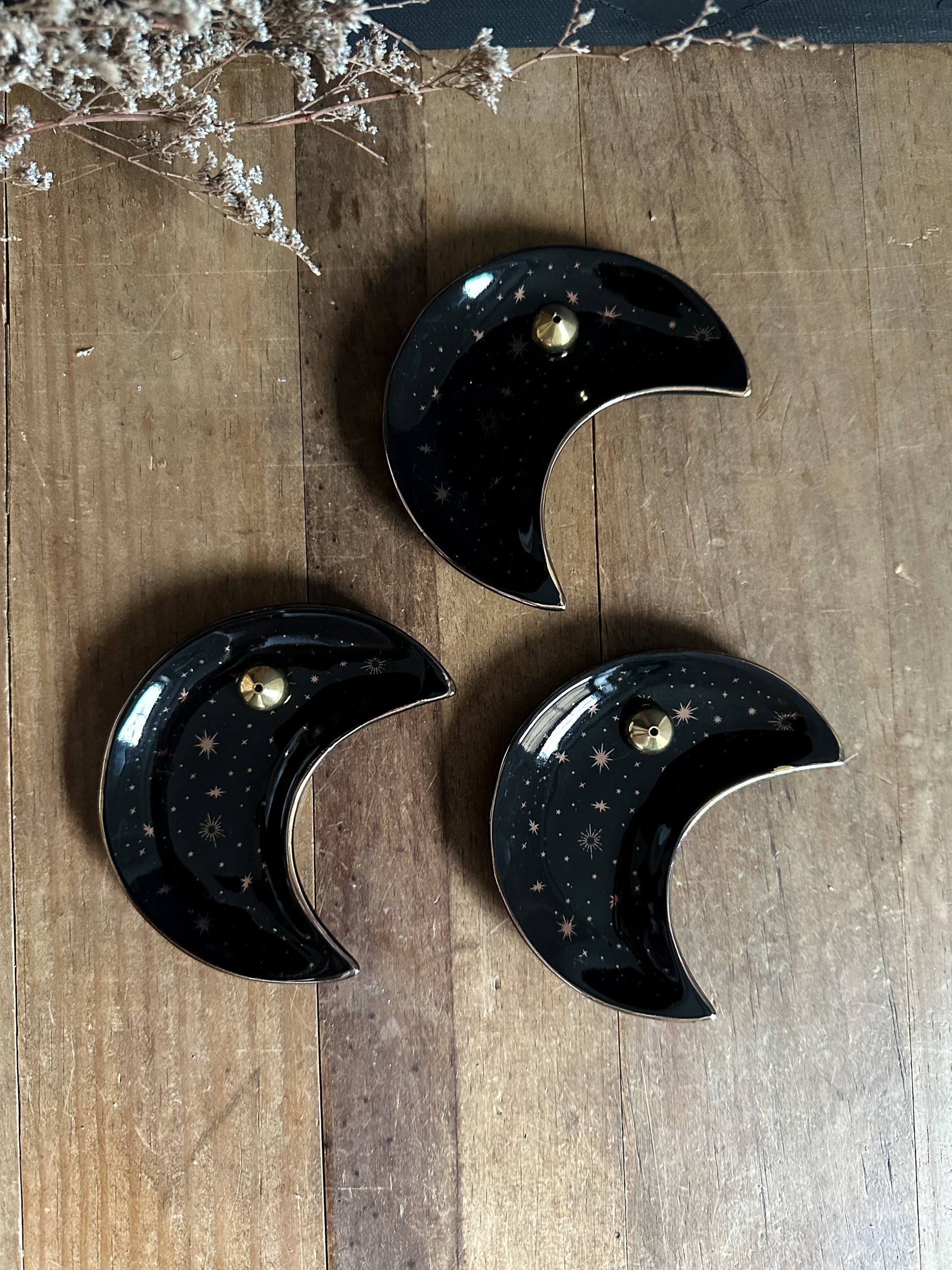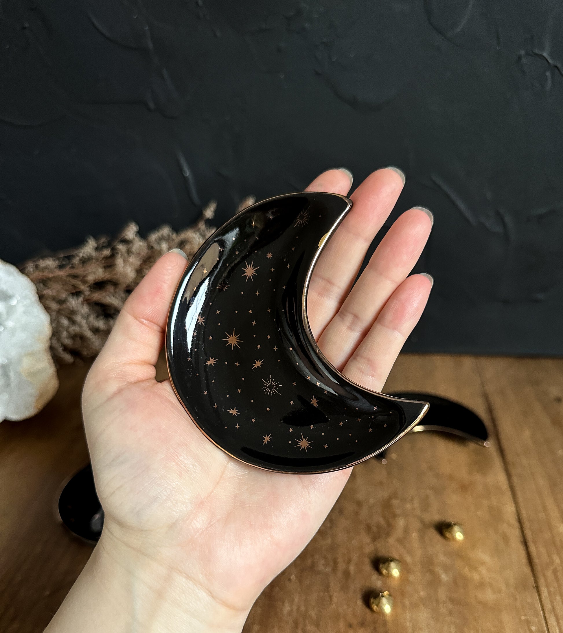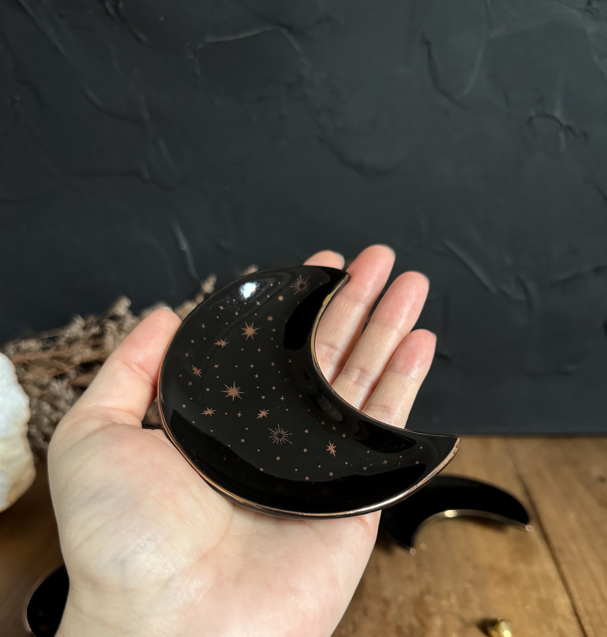 Adorned with celestial gold details that stand out against its black backdrop, this stunning ceramic crescent moon dish is not only a captivating piece for displaying jewelry, trinkets, and small crystals but also doubles as a versatile incense holder.
