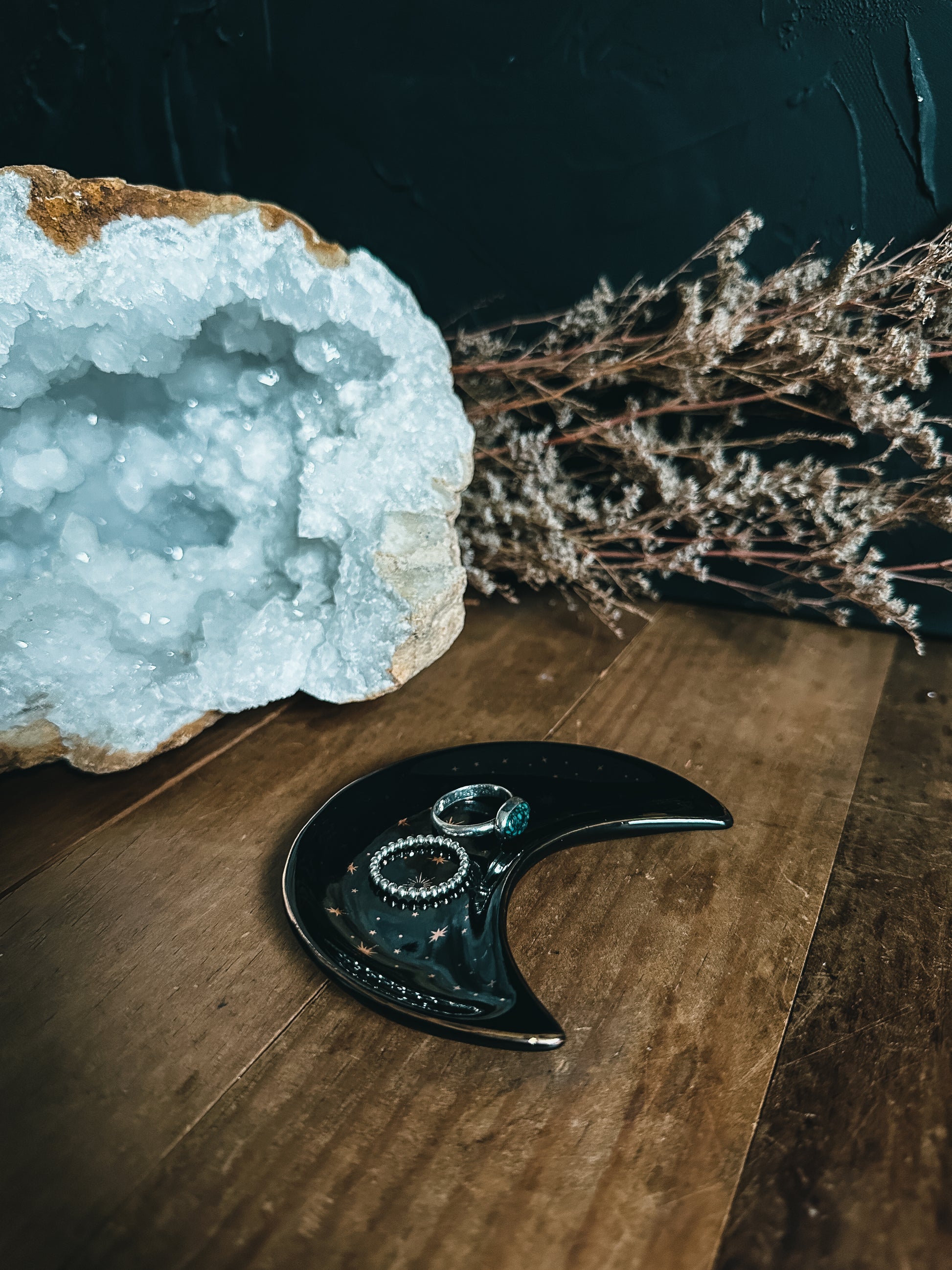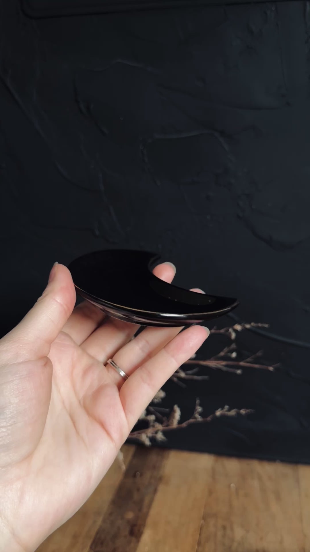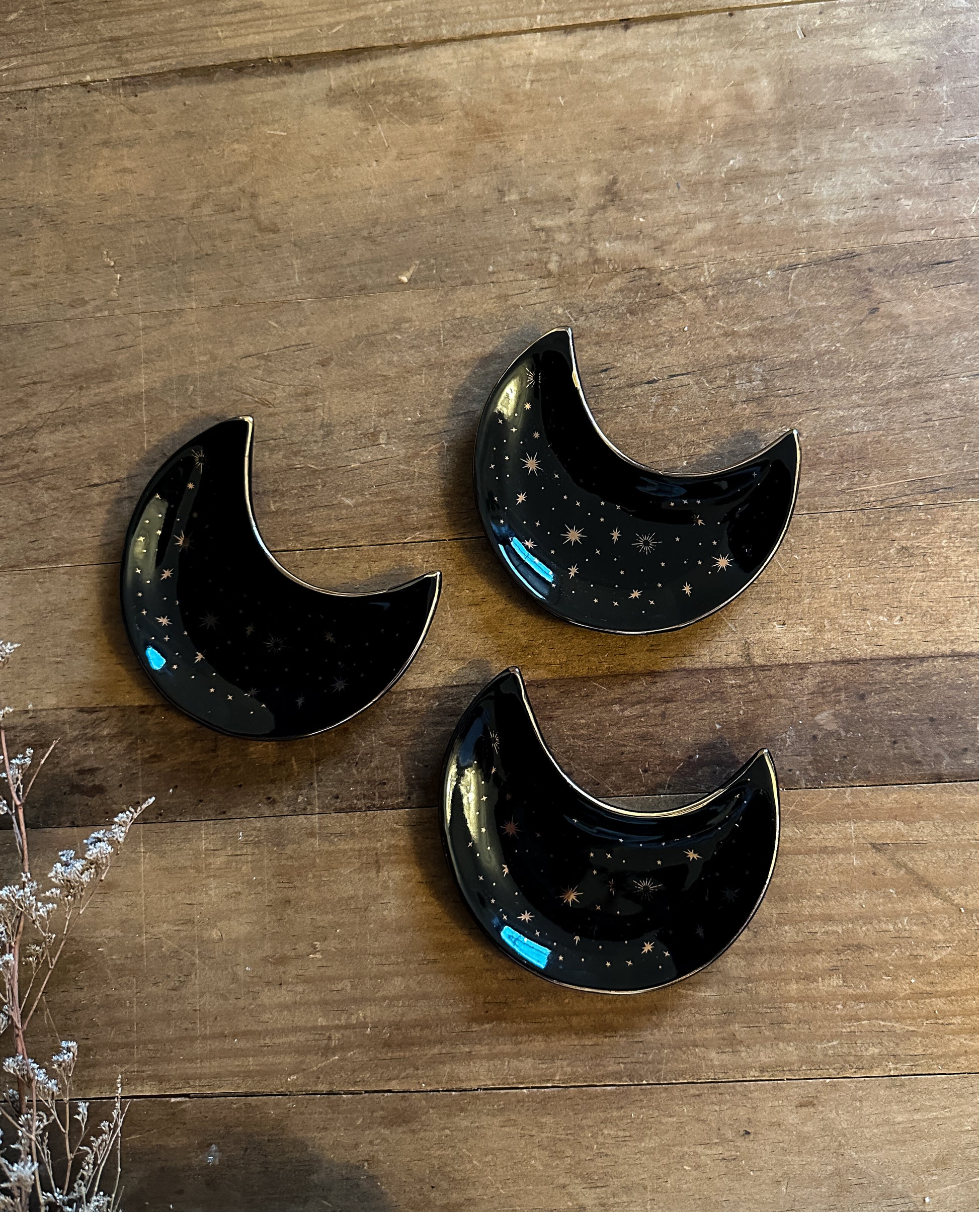 Adorned with celestial gold details that stand out against its black backdrop, this stunning ceramic crescent moon dish is not only a captivating piece for displaying jewelry, trinkets, and small crystals but also doubles as a versatile incense holder.