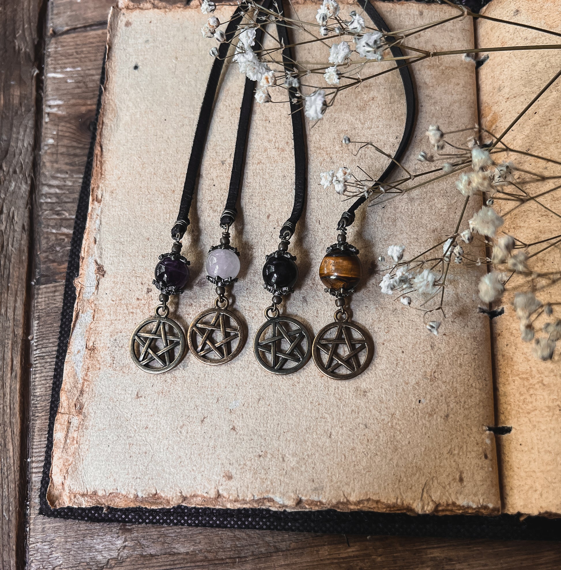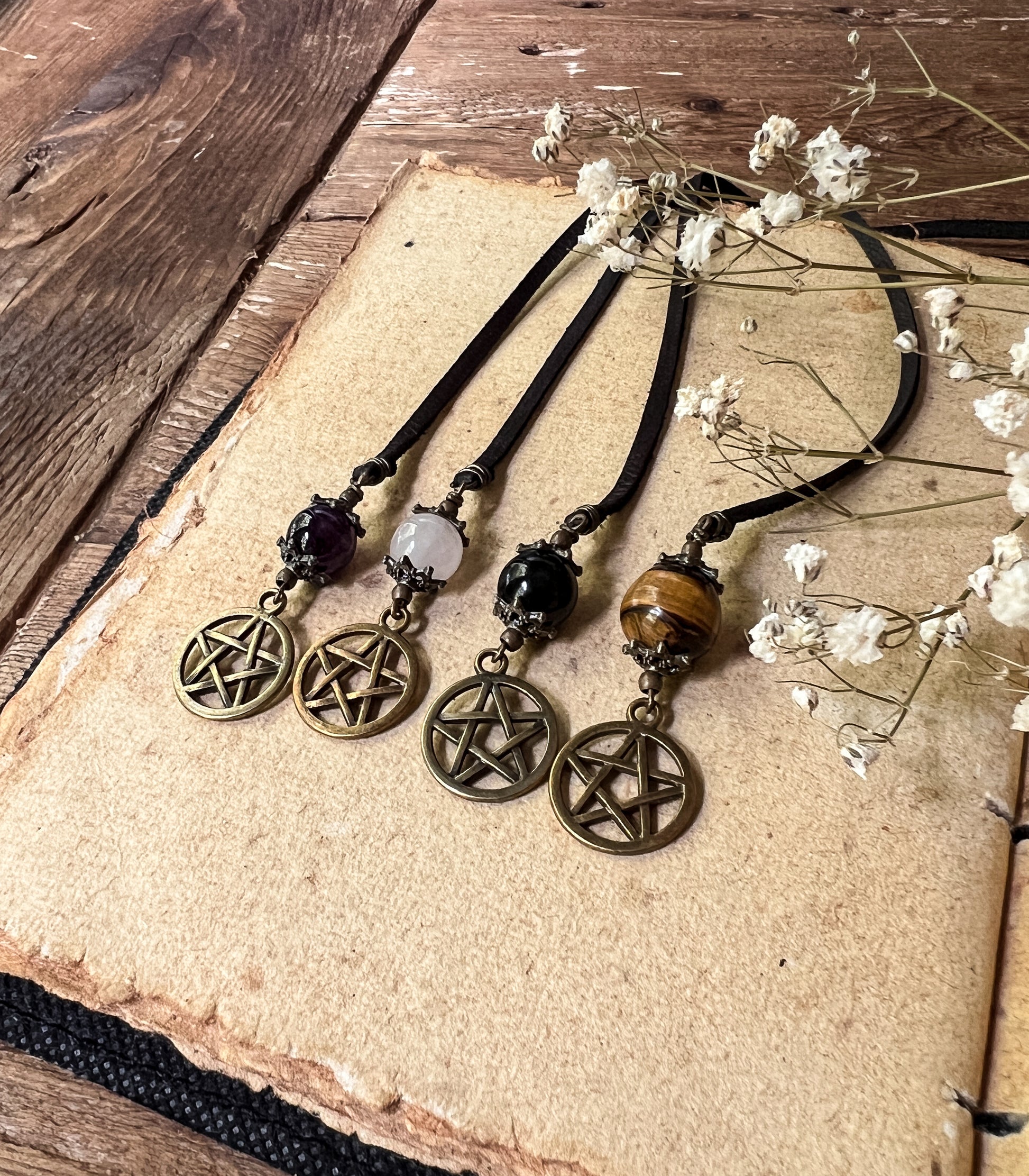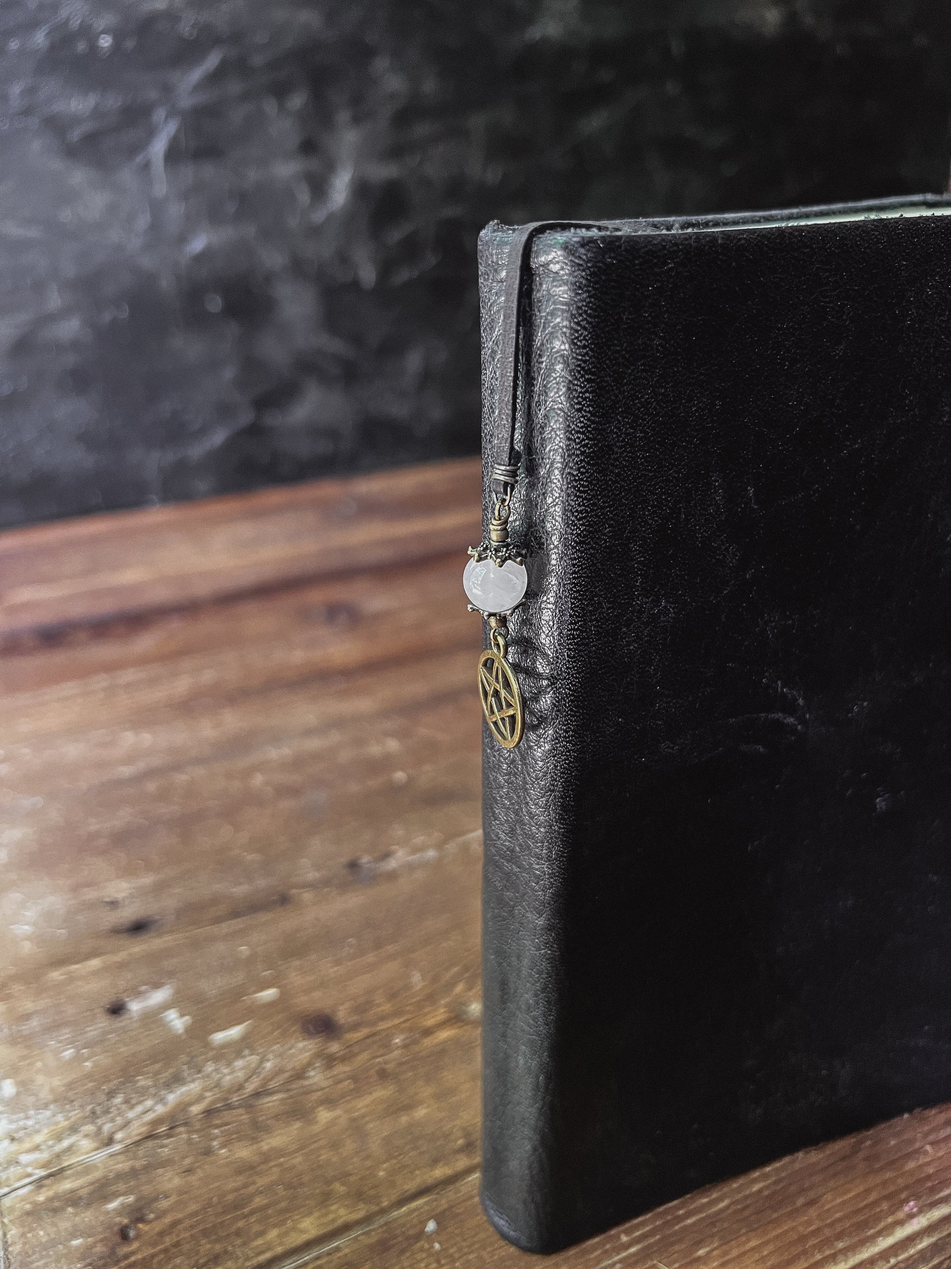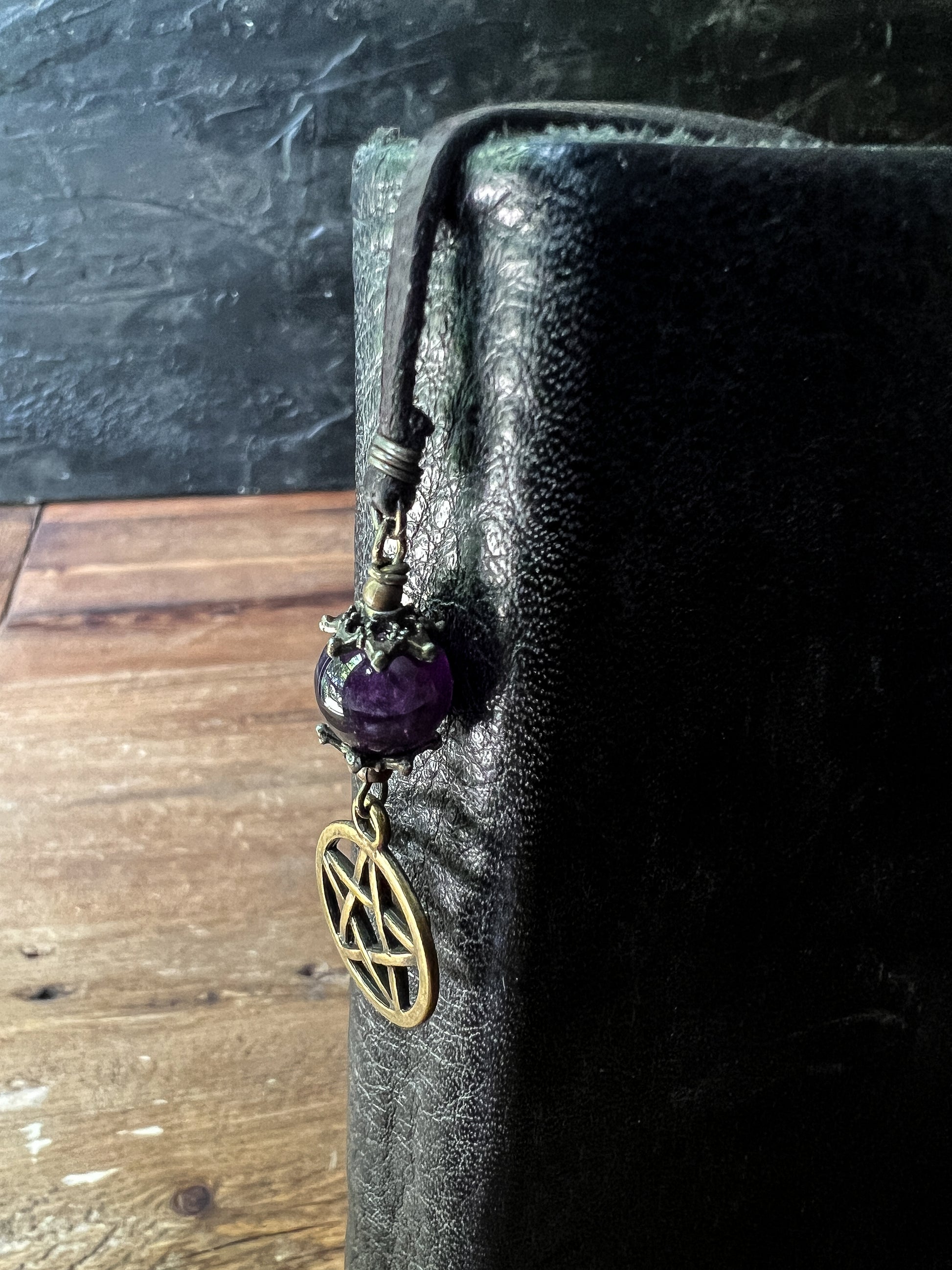 We adorned the faux leather strap with 2 gorgeous Crystal Spheres on either side and one brass pentacle.