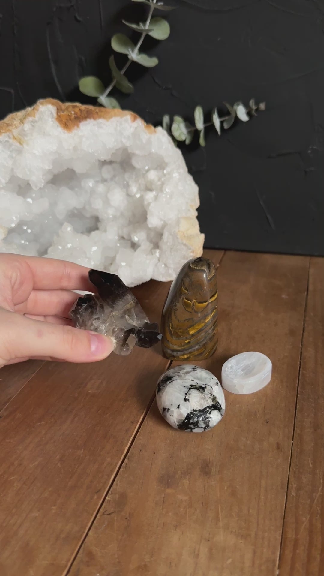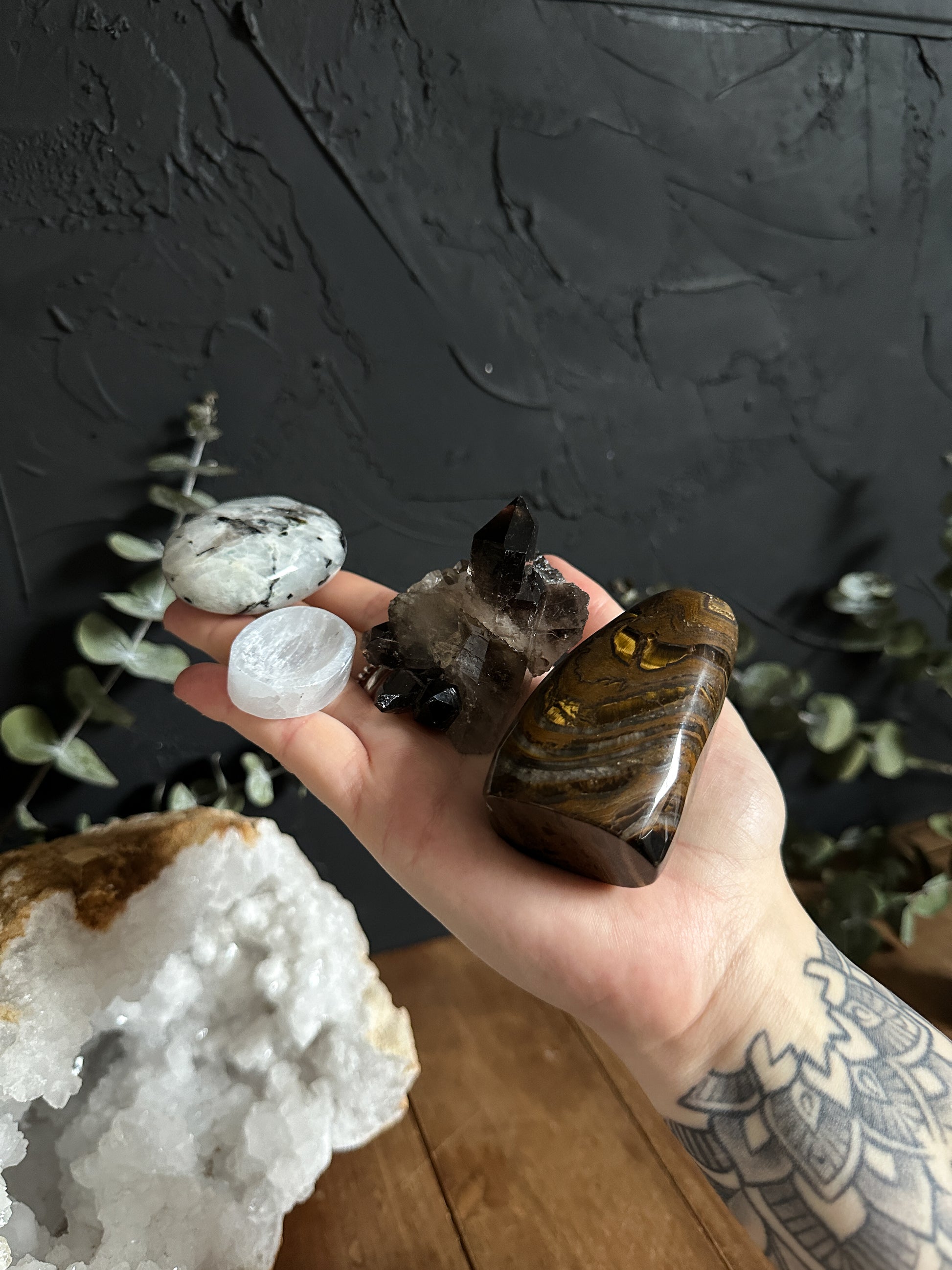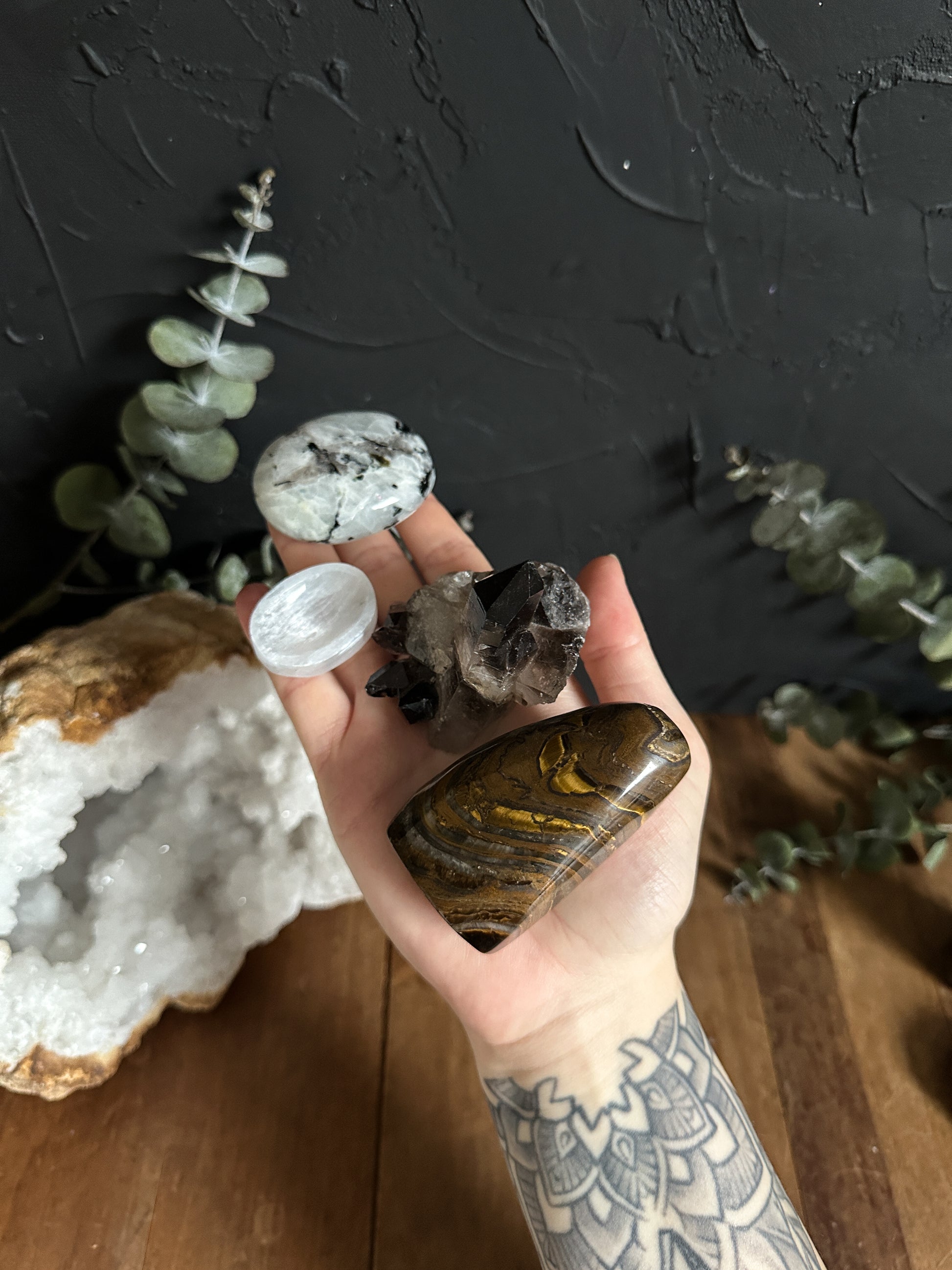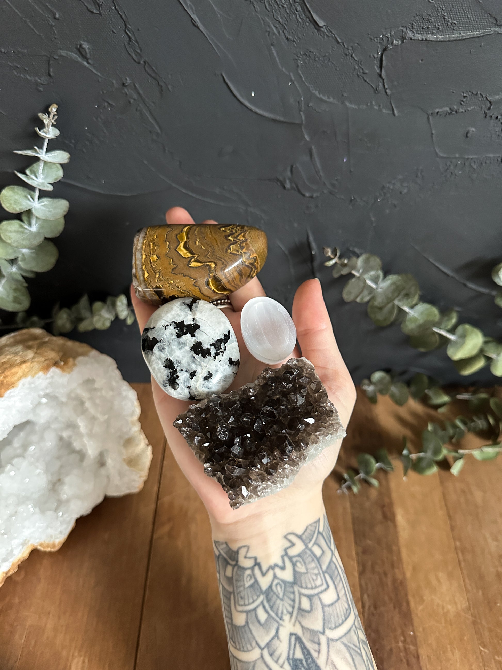 Find peace with our Anxiety Relief Crystal Kit, featuring Tigers Eye, Smoky Quartz, Moonstone, and Selenite. Tigers Eye instills courage and confidence, while Smoky Quartz absorbs negative energy and promotes emotional stability. Moonstone brings soothing energy and emotional balance, while Selenite clears the mind of worries and promotes inner peace. These stones help reduce anxiety by calming your soul and easing your mind. The vibrational pull will balance your energy while keeping the mind open to clear thinking. Putting situations into perspective can help conquer certain anxieties.