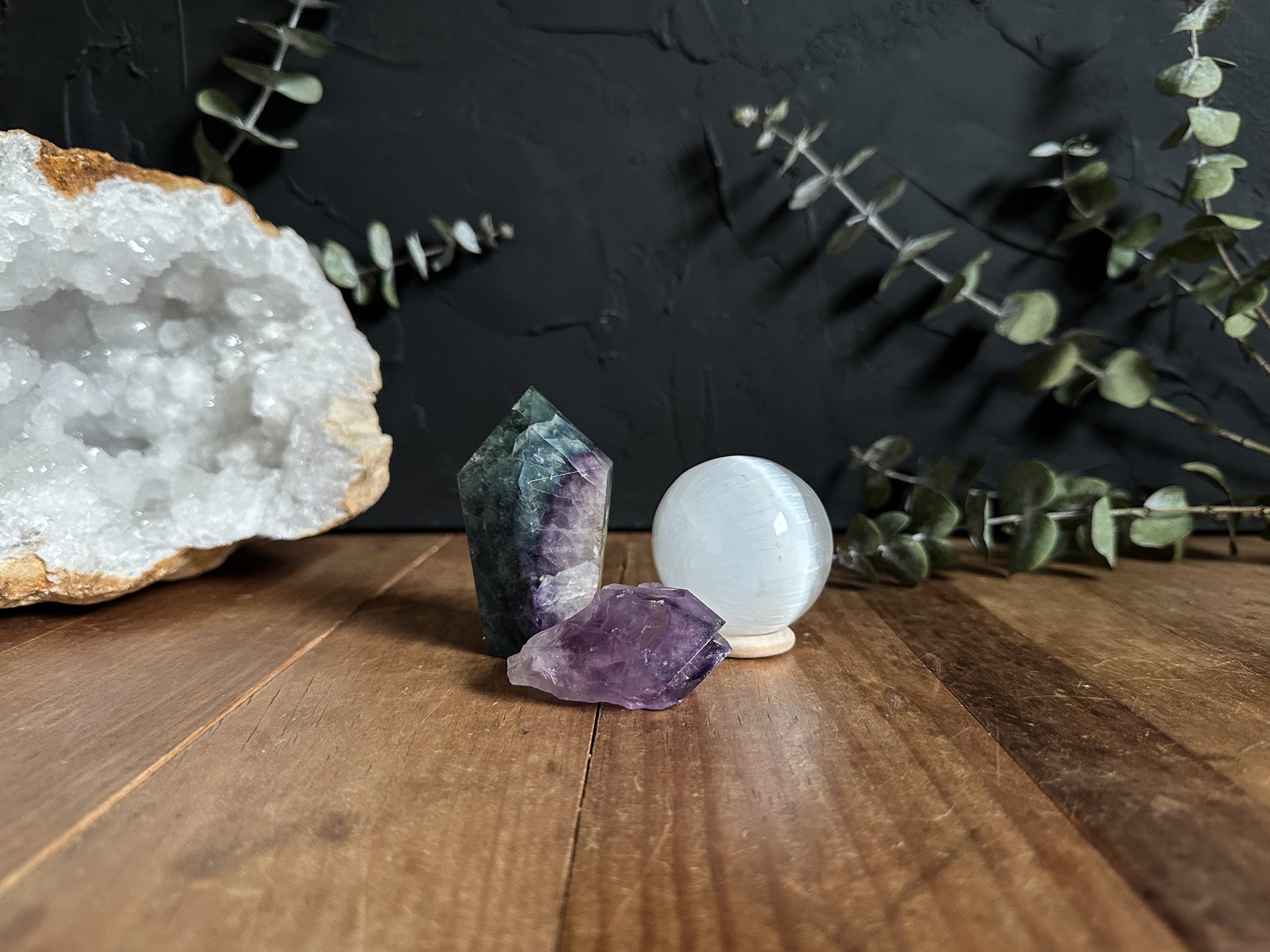 Amethyst quiets the mind to promote mental clarity and concentration, while Fluorite aids in organizing thoughts, improving decision-making and reduces mental fog. Selenite cleanses the mind of distractions, fostering a clear and focused mindset.
