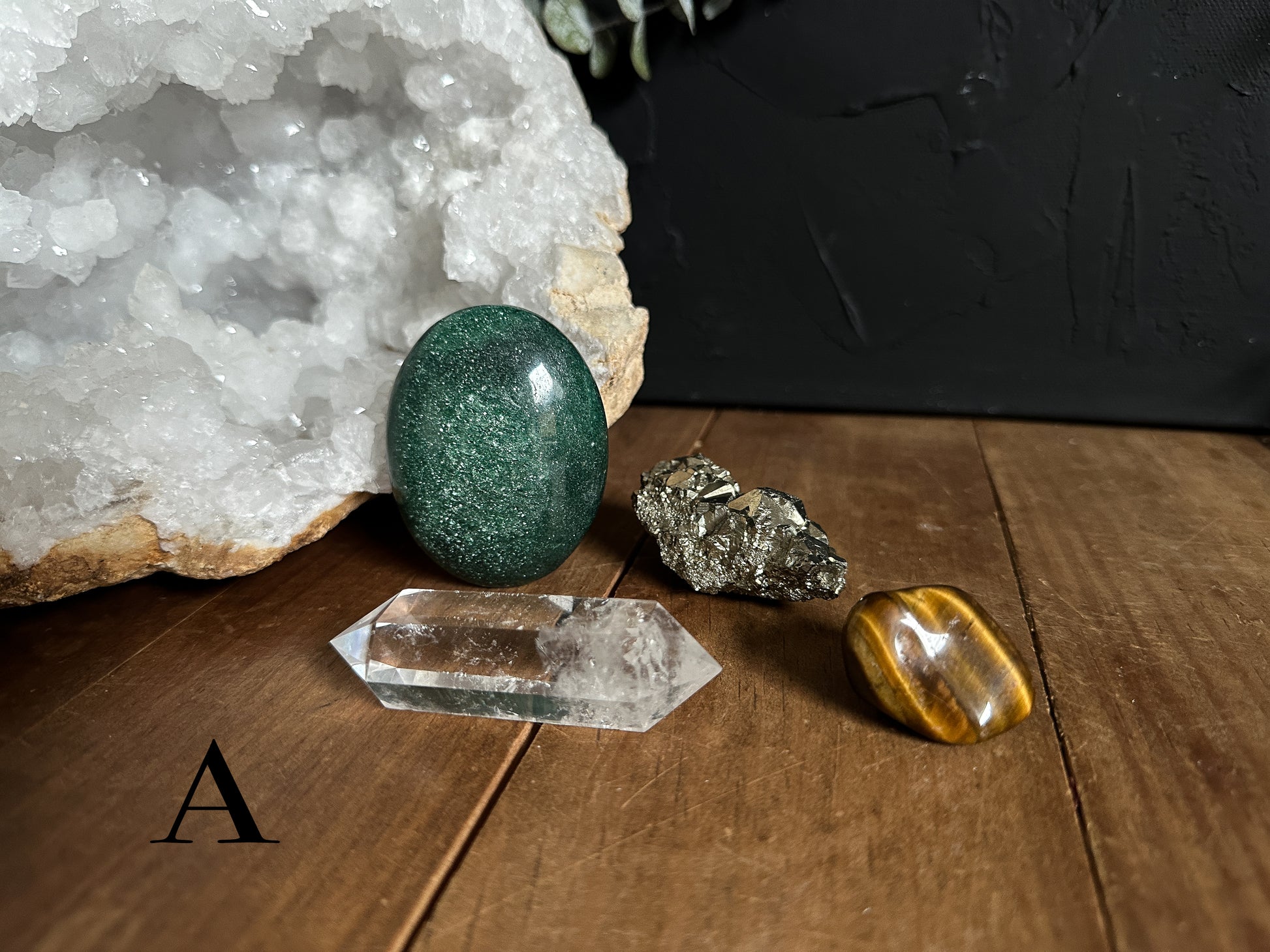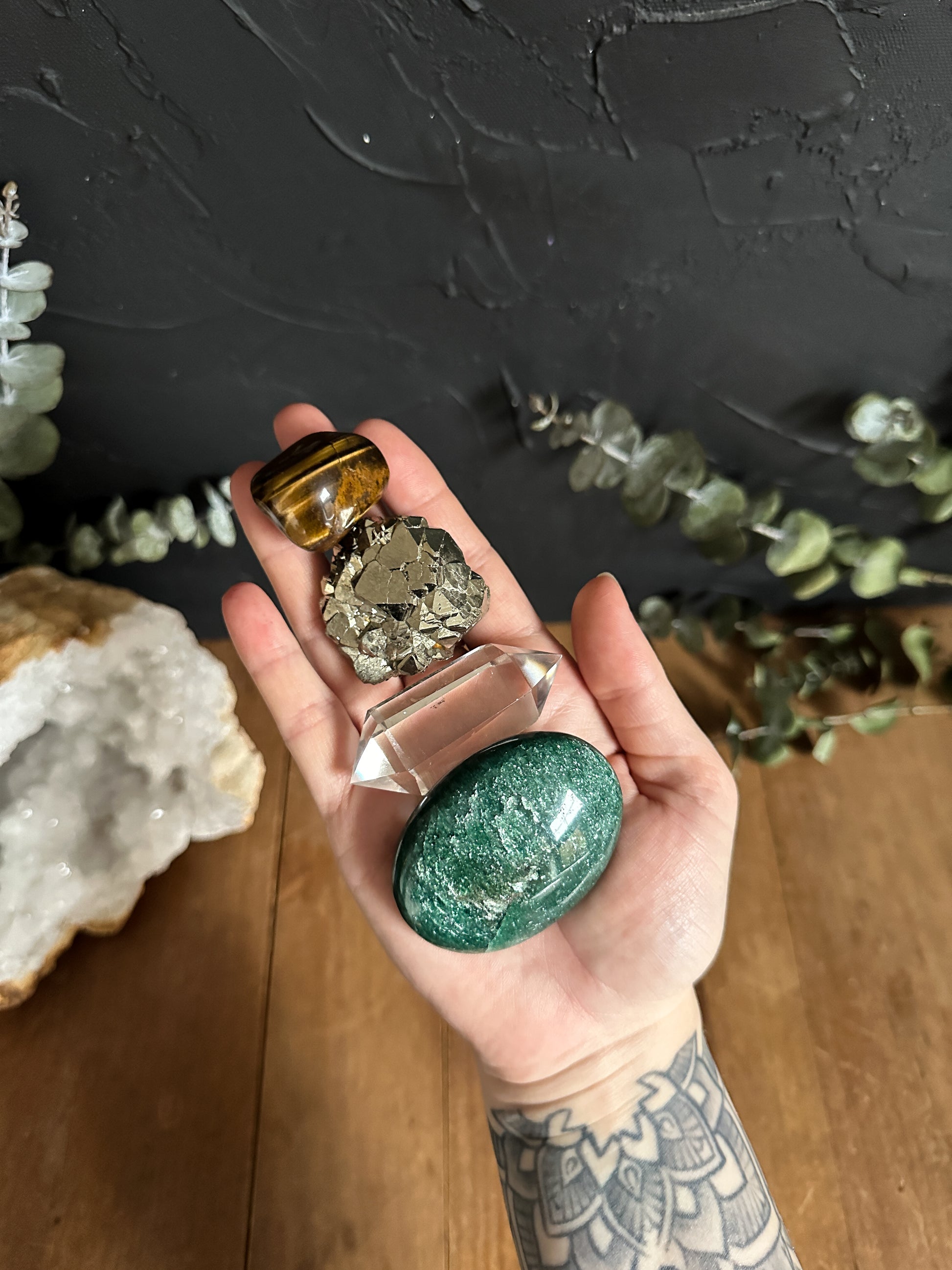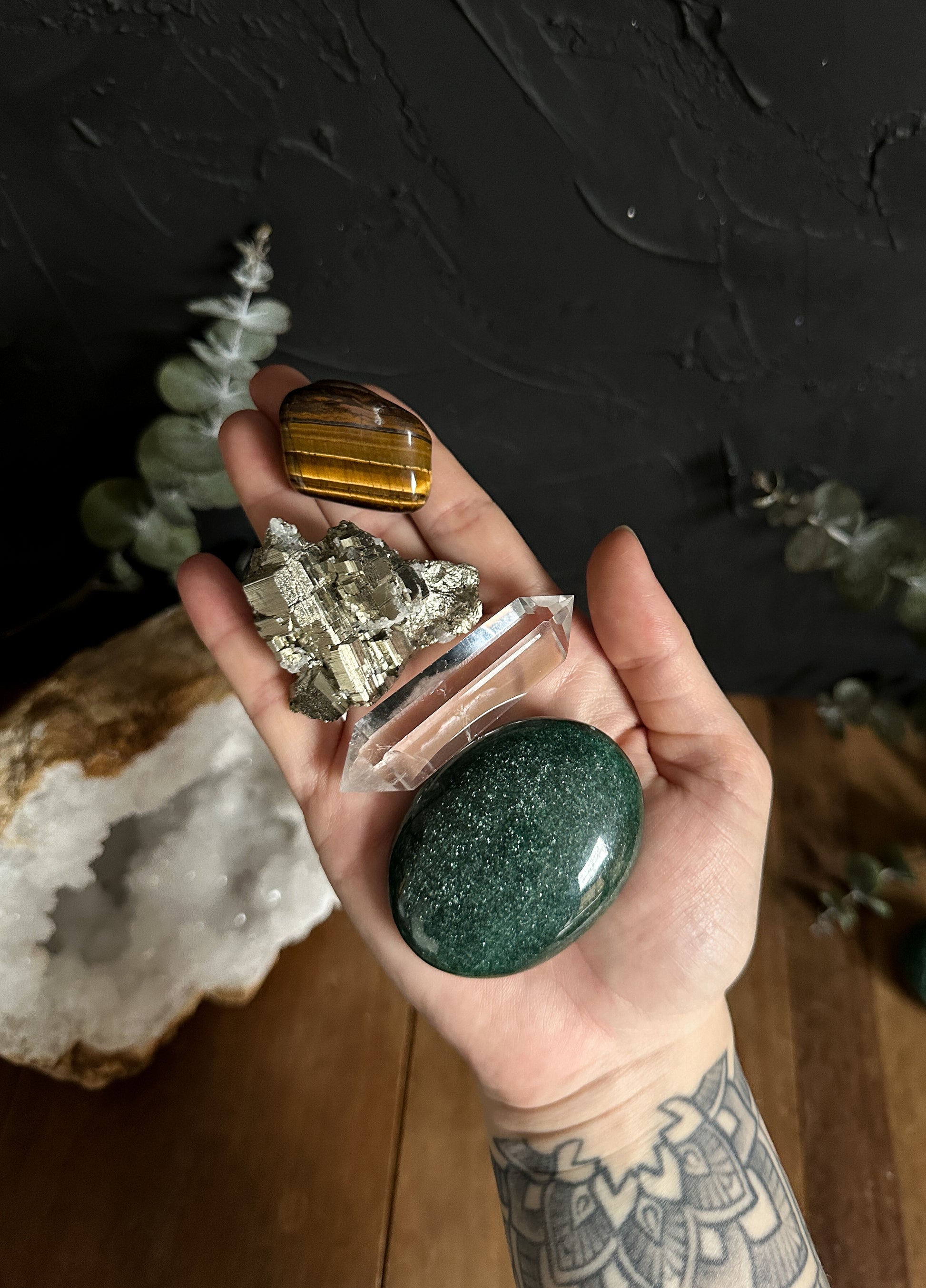 Unlock prosperity and abundance with our Crystal Kit for Wealth and Abundance, featuring Green Aventurine, Pyrite, Clear Quartz, and Tigers Eye. Green Aventurine attracts opportunities and luck in financial matters, while Pyrite ignites the fire of ambition and helps manifest your goals into reality. Clear Quartz amplifies intentions and clears blockages, while Tigers Eye fosters determination and success. Use this powerful combination to attract abundance, increase prosperity, and manifest your financial goals with confidence and clarity.