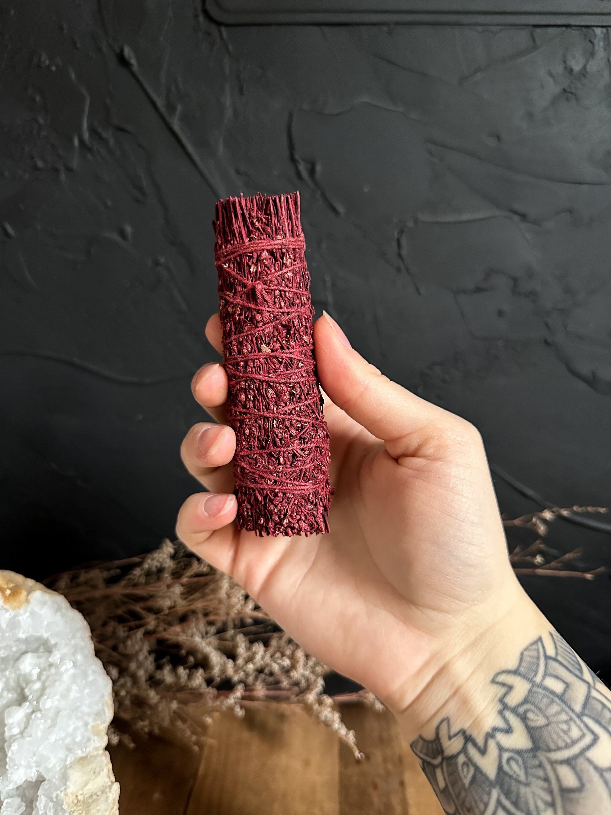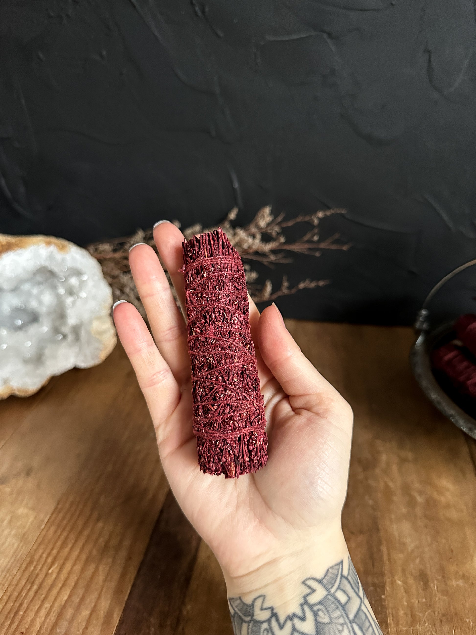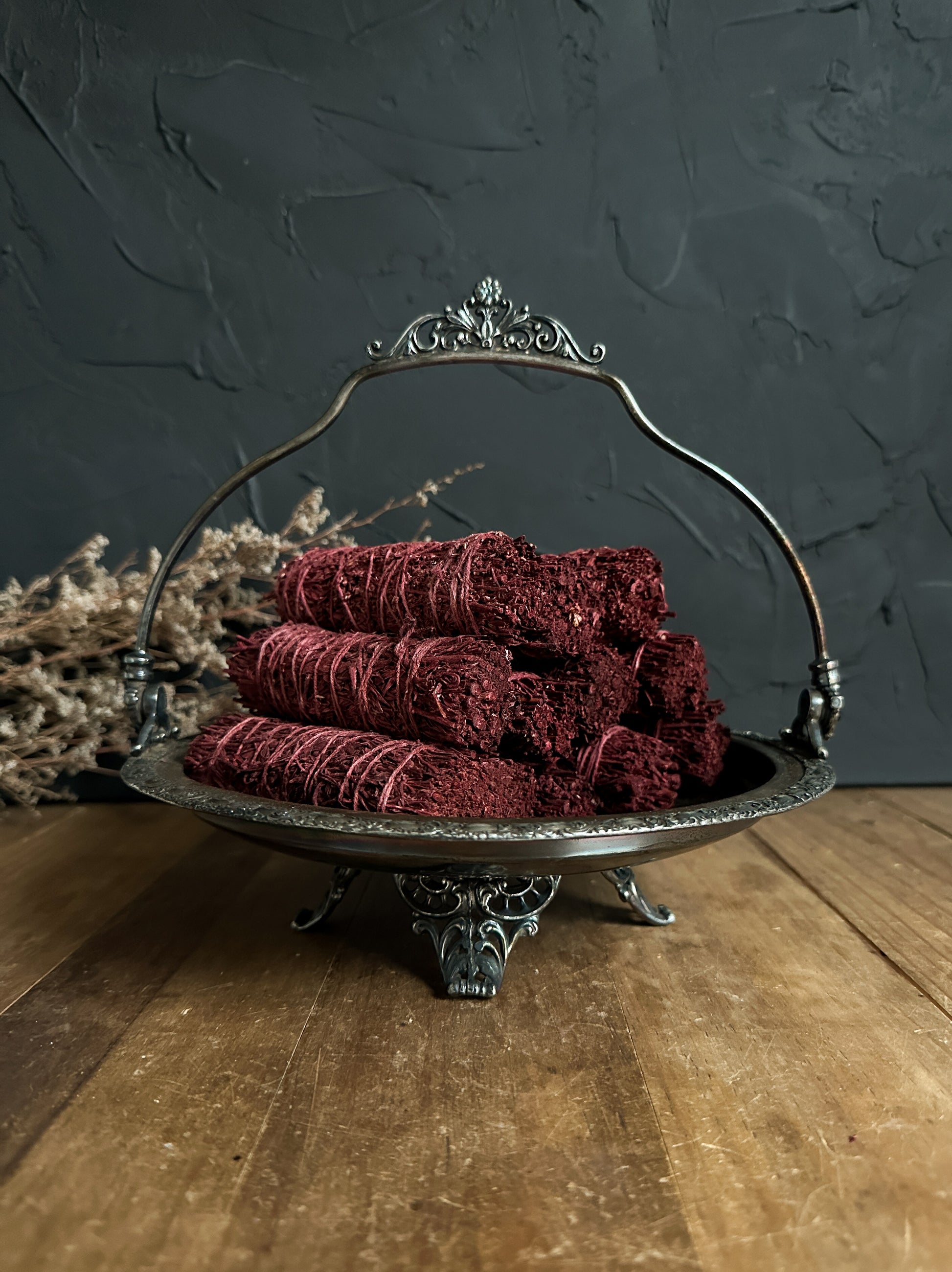These Bundles have a blend of scents of Dragon's Blood Resin and Mountain Sage. This combination cultivates an aura of protection and love, wards off evil and negative influences and amplifies healing and manifestation. It purifies the air and brings mental and spiritual clarity.