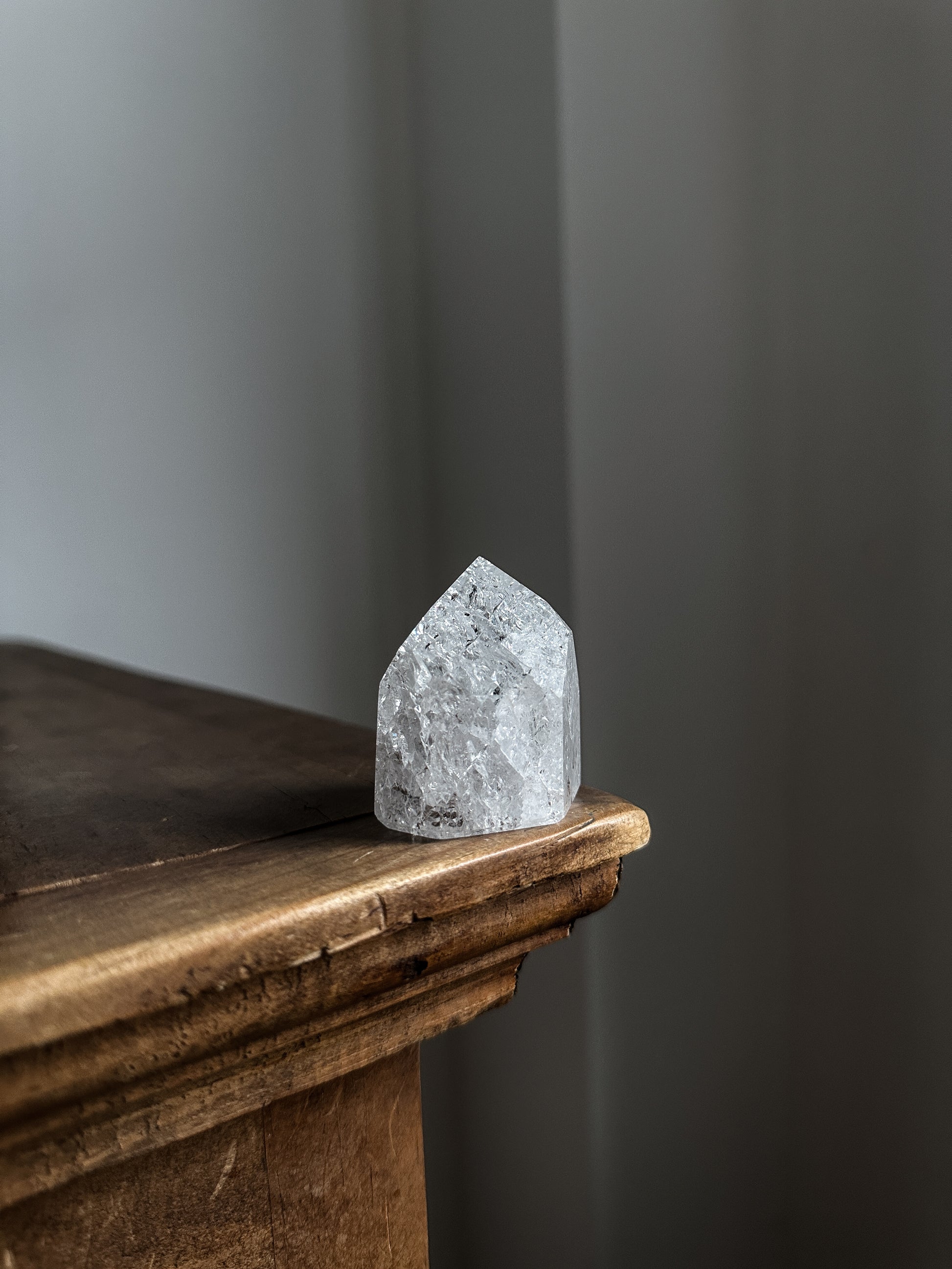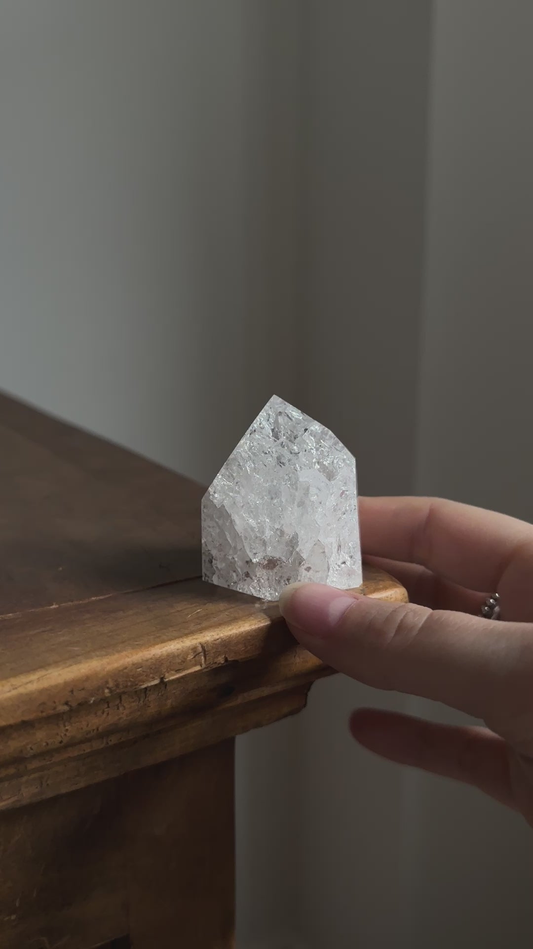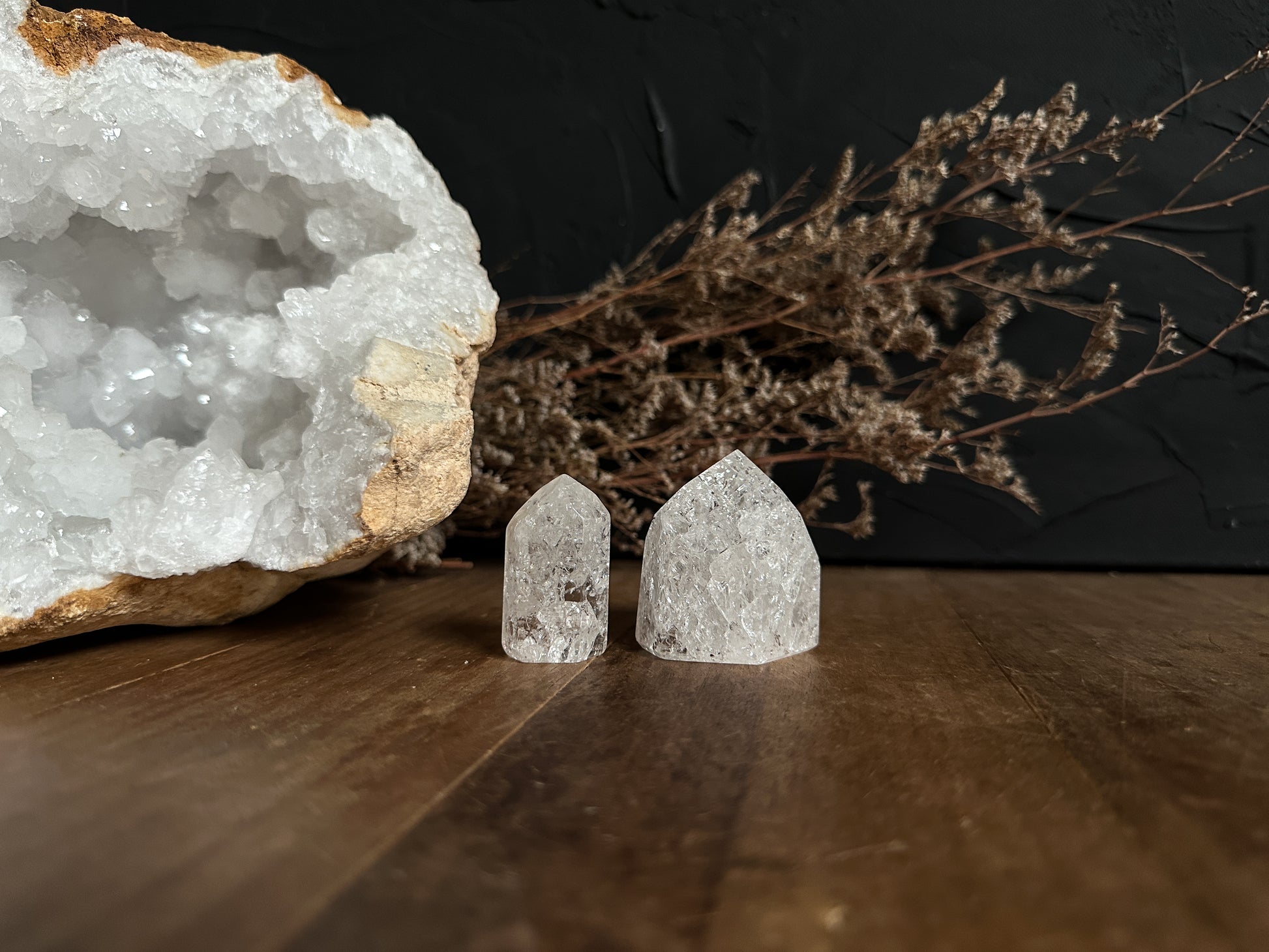 Fire and Ice Quartz, or Crackled Quartz, is created through heat treatment, which introduces temperature differences to natural quartz, resulting in the distinctive cracks and fissures underneath the crystals surface. This process enhances the stone's appearance, giving it a shimmering rainbow effect when exposed to light.