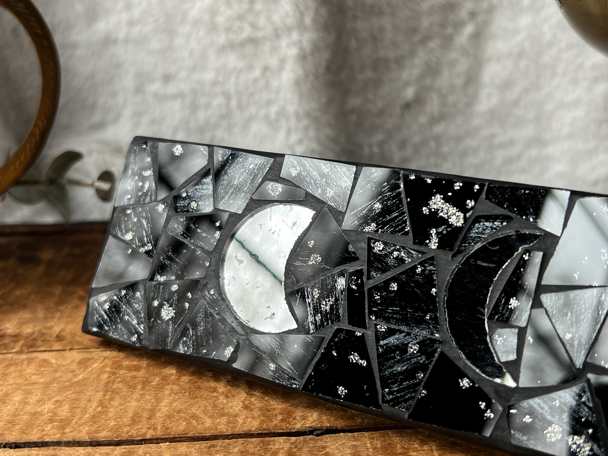 The Perfect catch all for your incense ash. This mosaic features black glass, silver glitter specks and mirror cut into moons! This is on the larger side of incense holders however this one is a piece of art on its own.