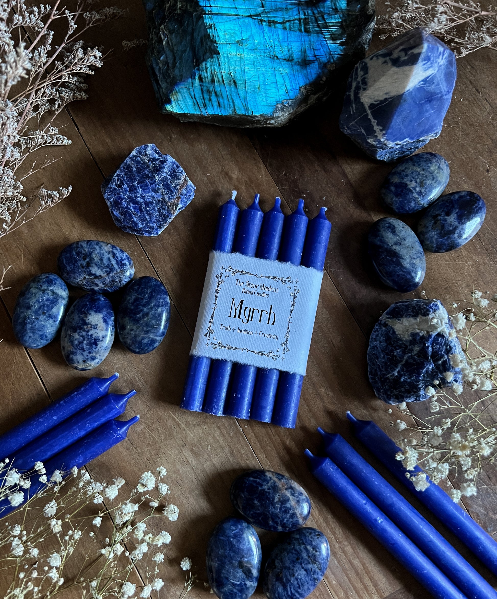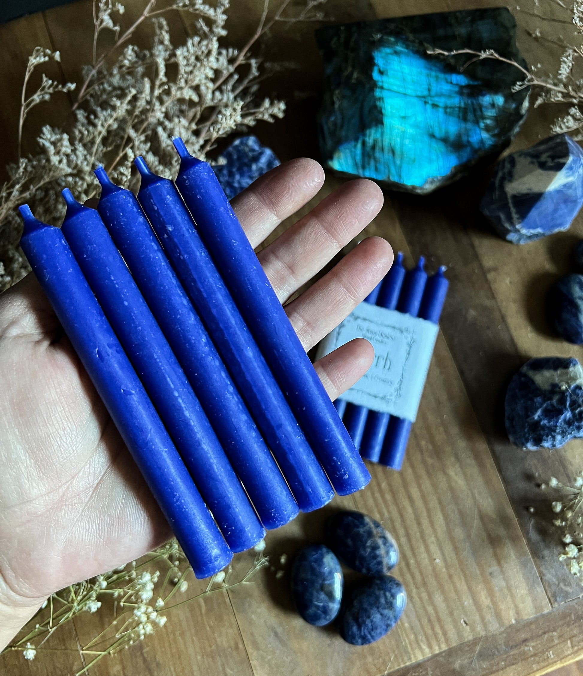 These Dark Blue Ritual Candles also known as Chime Candles, are infused with the grounding scent of Myrrh essential oil.