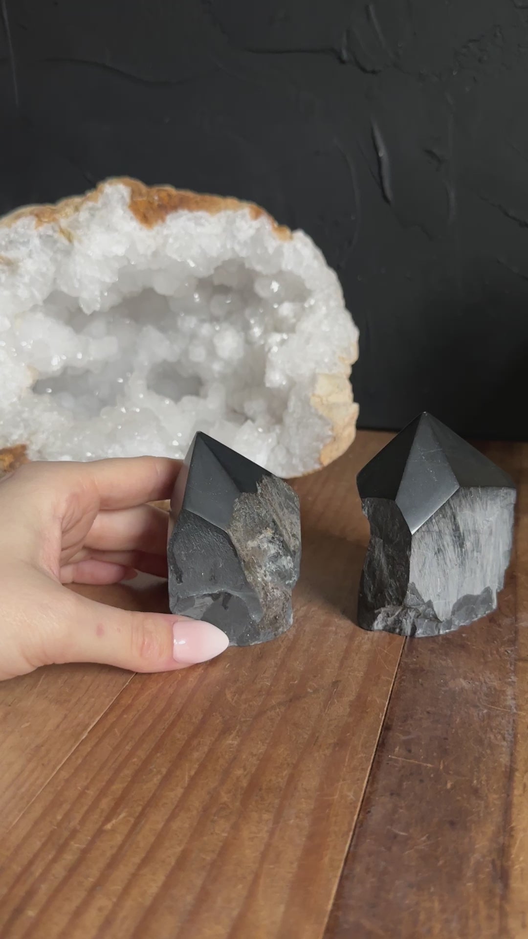 These beautiful Onyx Top Points are embellished with shimmering Pyrite throughout.