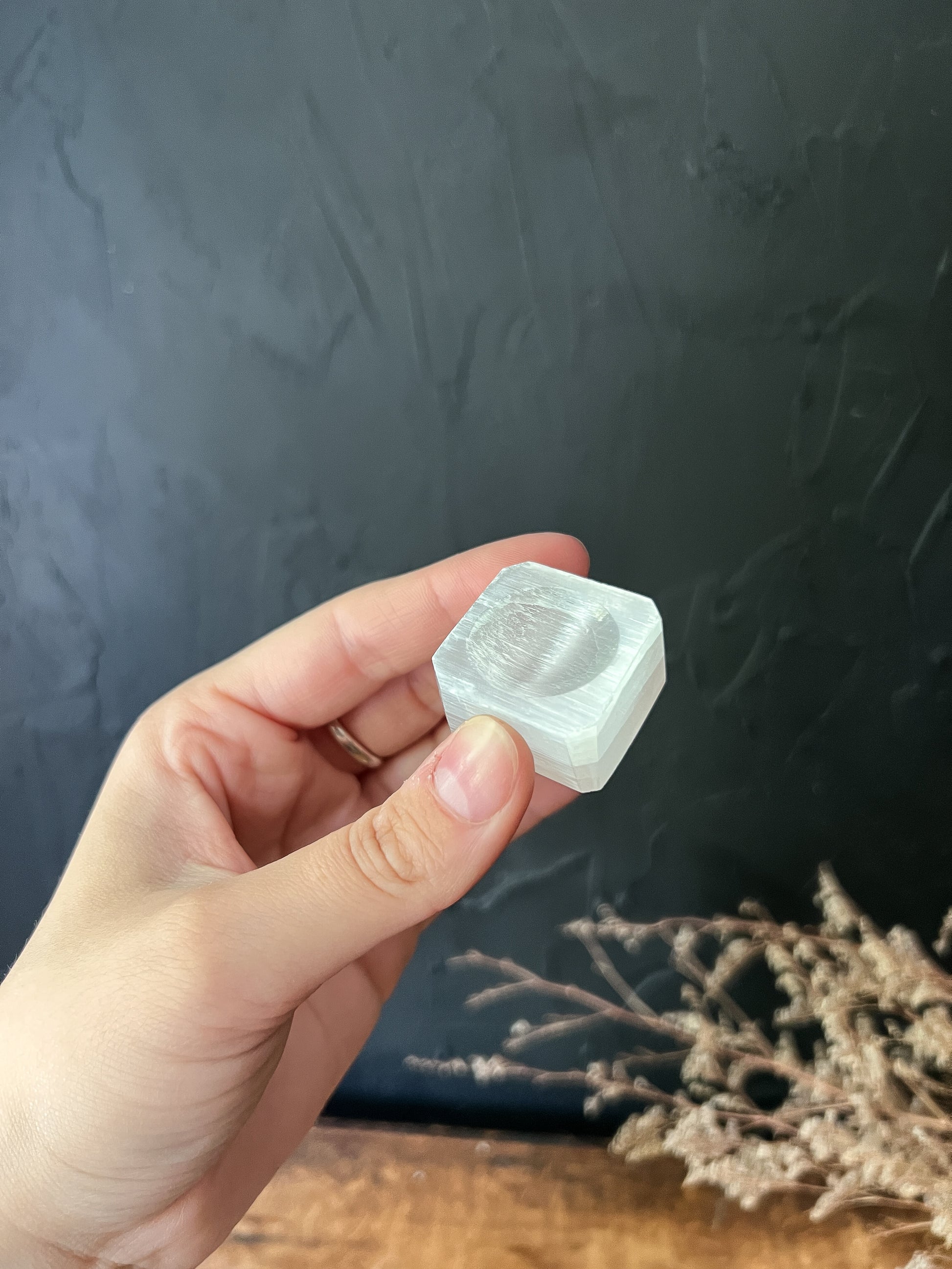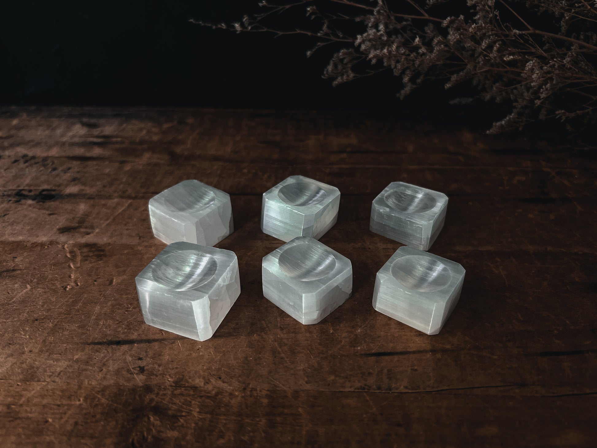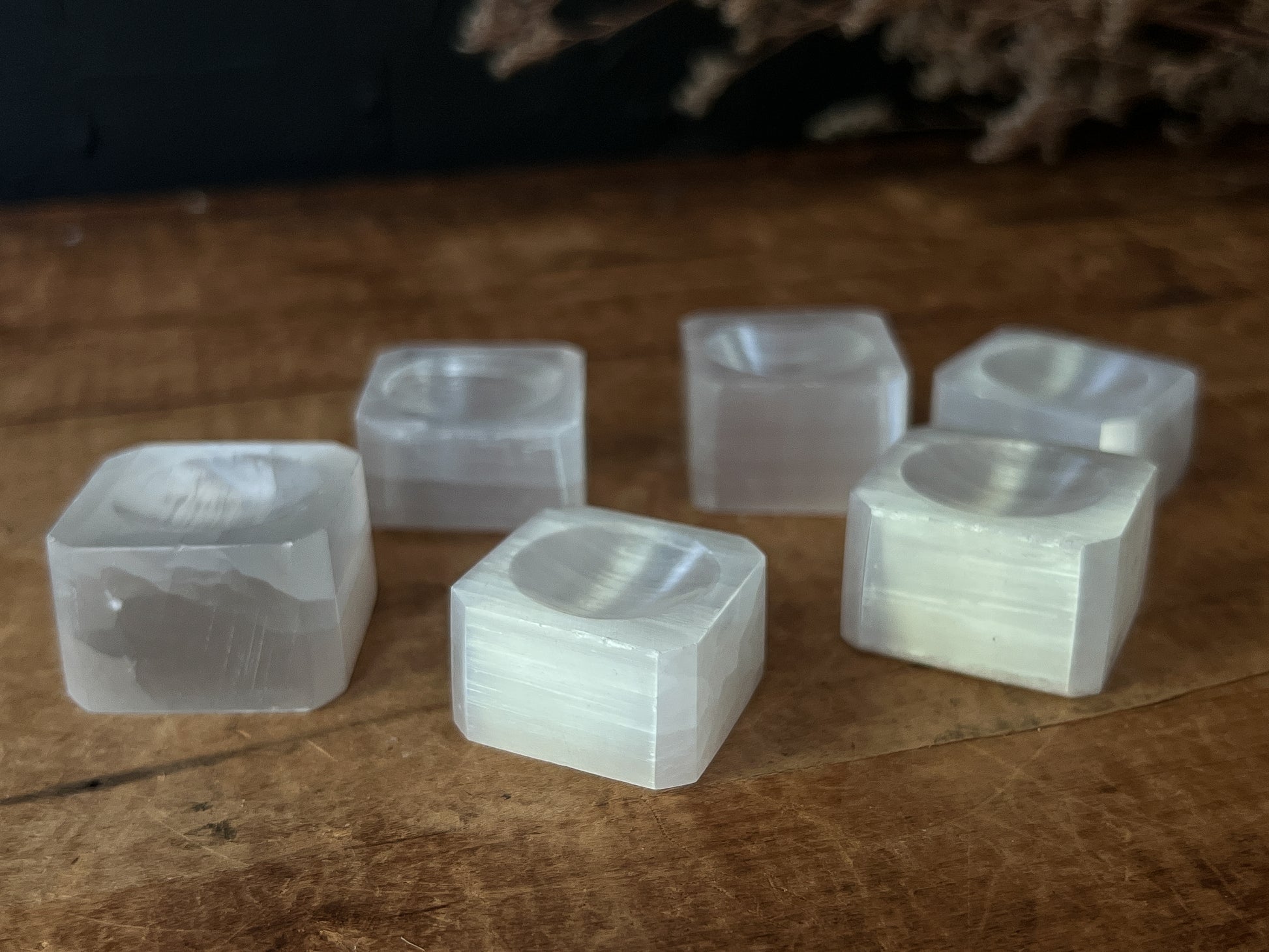 You will receive one Selenite Cube Stand, that measures approximately 17mm tall x 28mm wide.