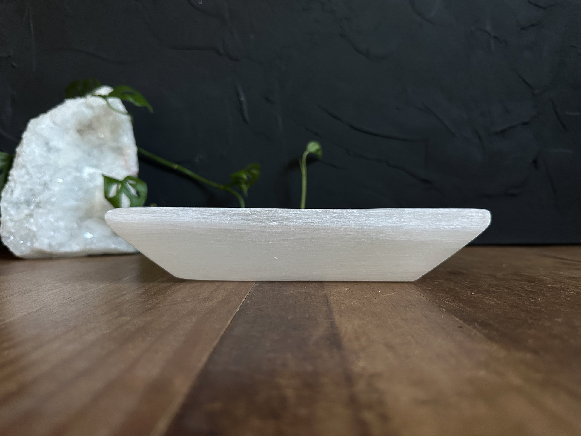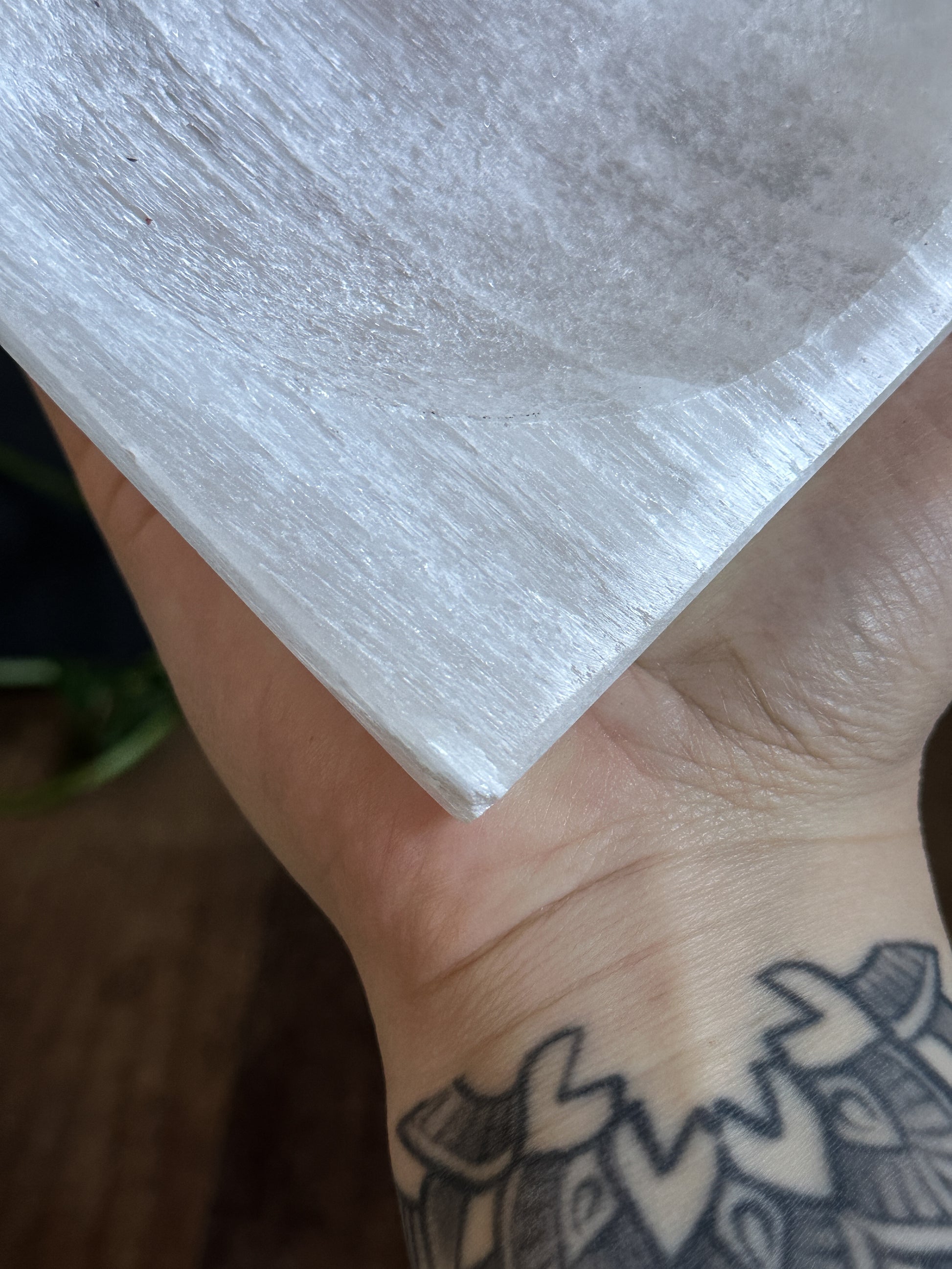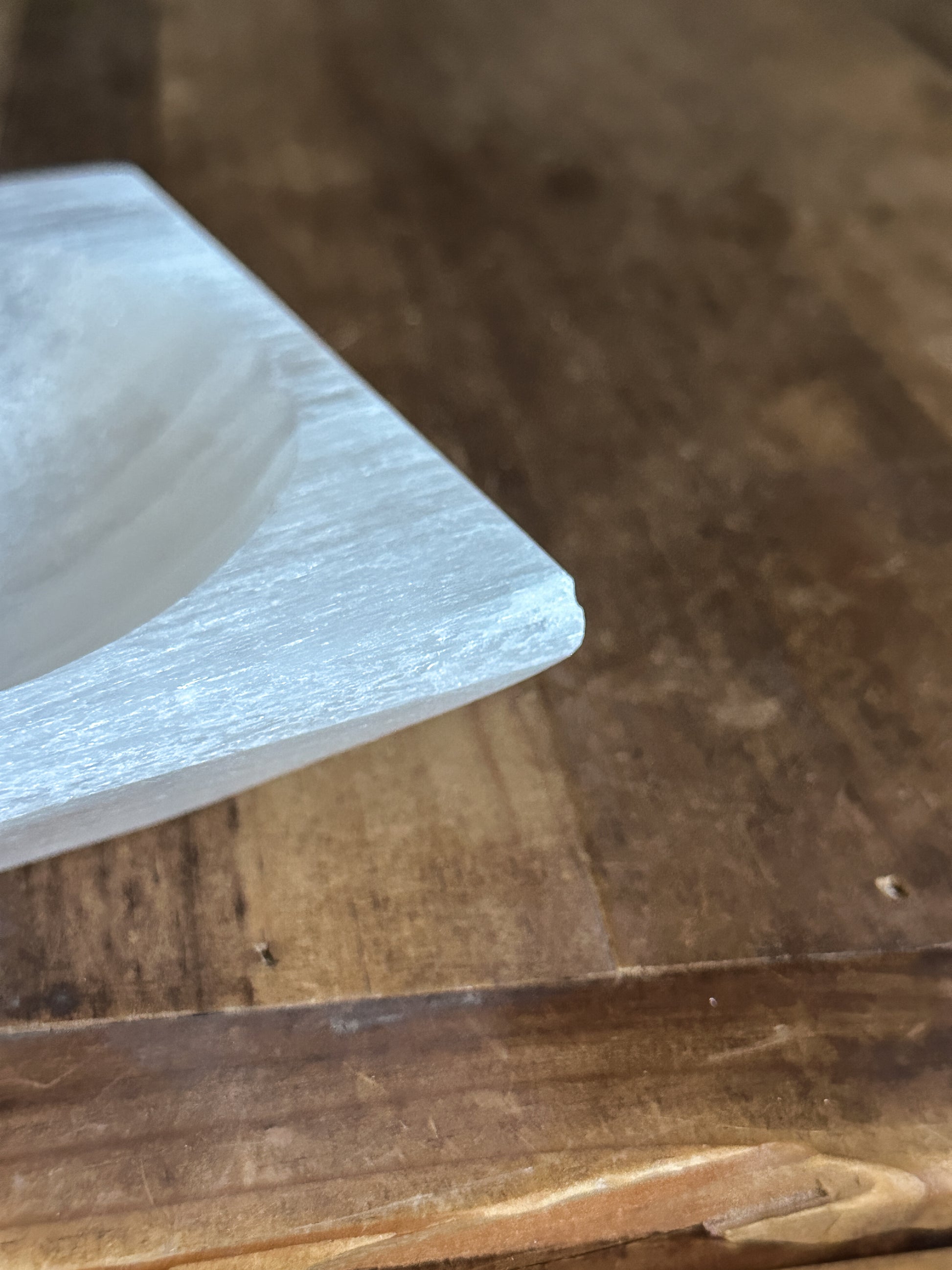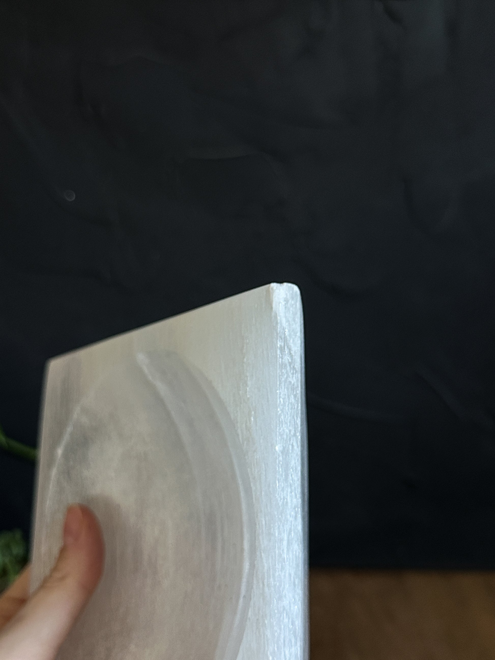 As gorgeous as this Selenite Square Bowl is, it does have a dinged corner. Despite its imperfection, this crystal bowl still radiates energy and holds the potential to enhance your spiritual practice, meditation sessions, or home decor.