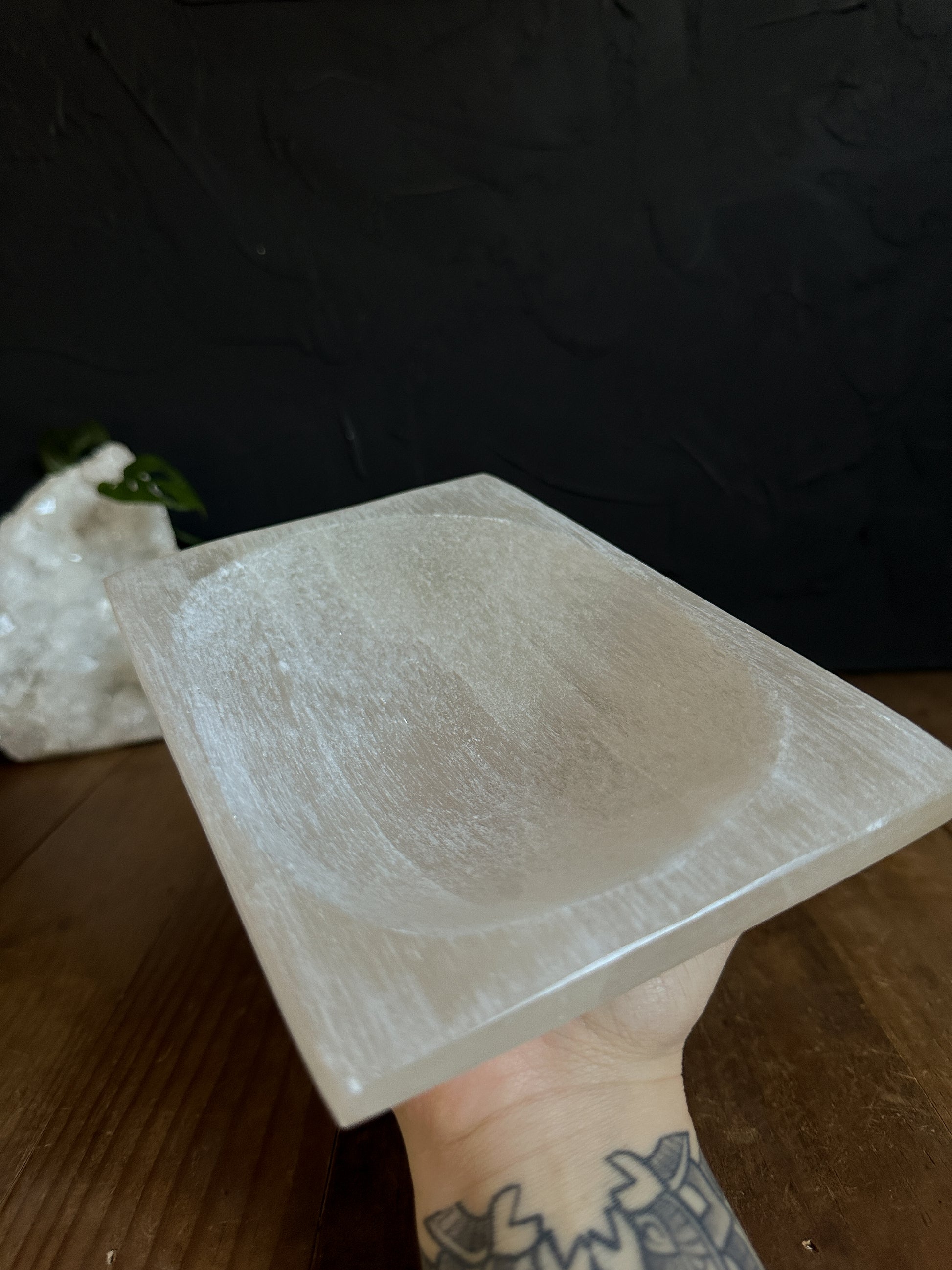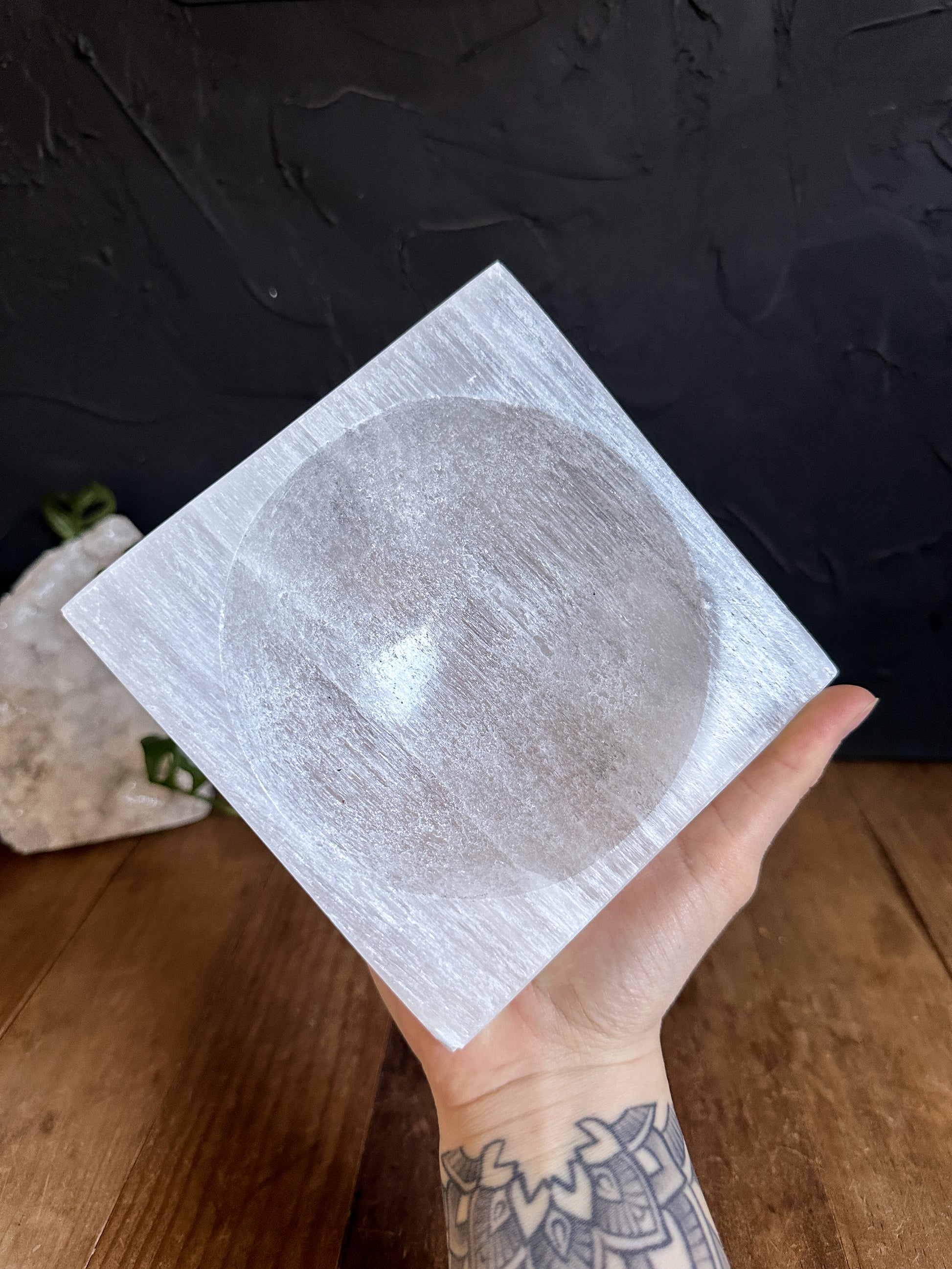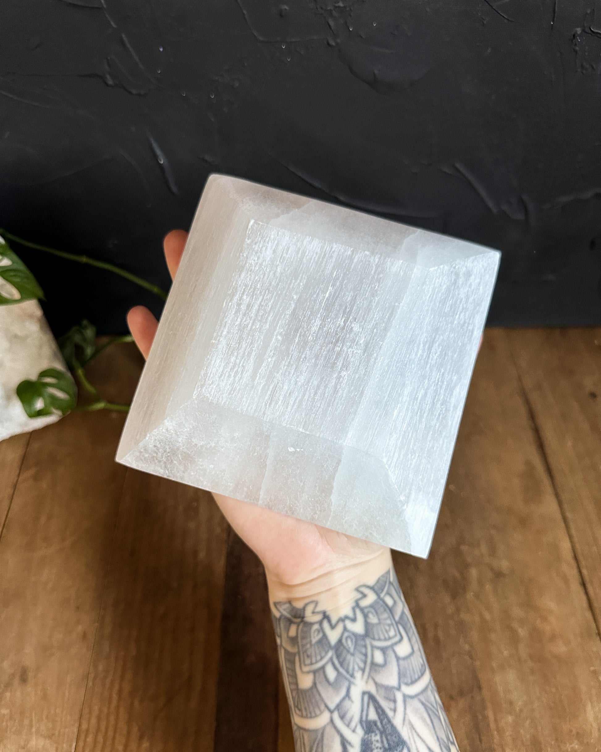 As gorgeous as this Selenite Square Bowl is, it does have a dinged corner. Despite its imperfection, this crystal bowl still radiates energy and holds the potential to enhance your spiritual practice, meditation sessions, or home decor.