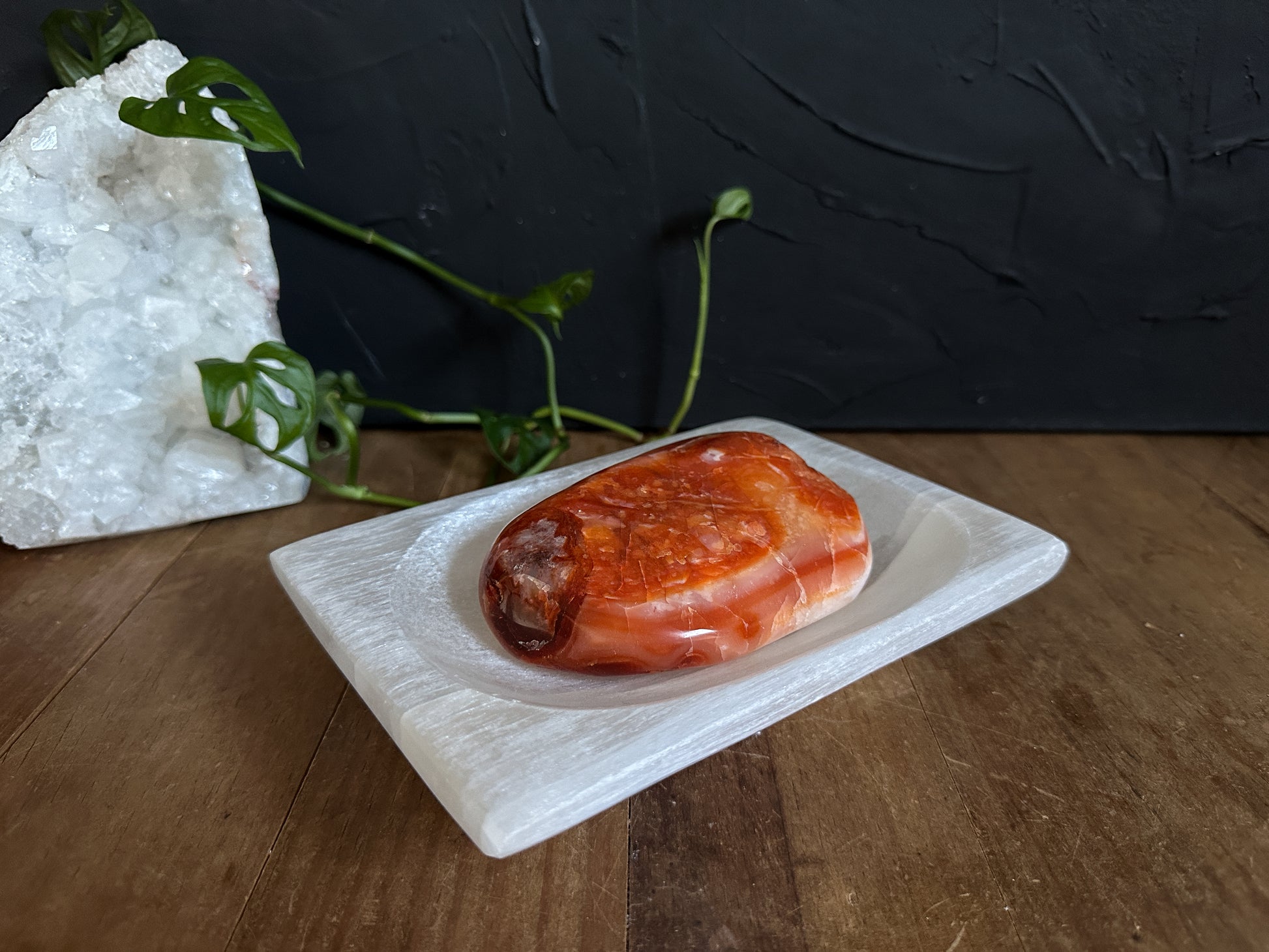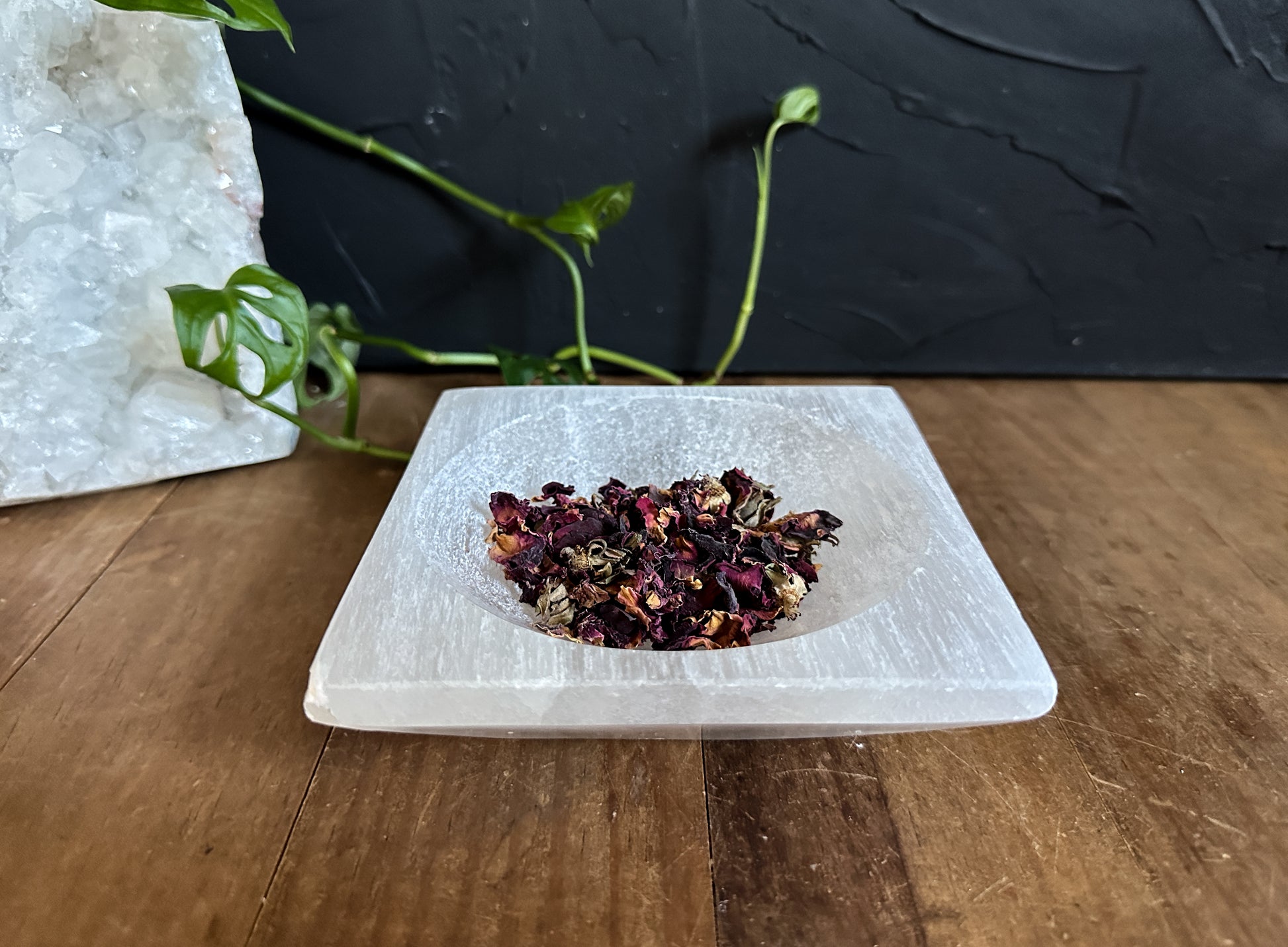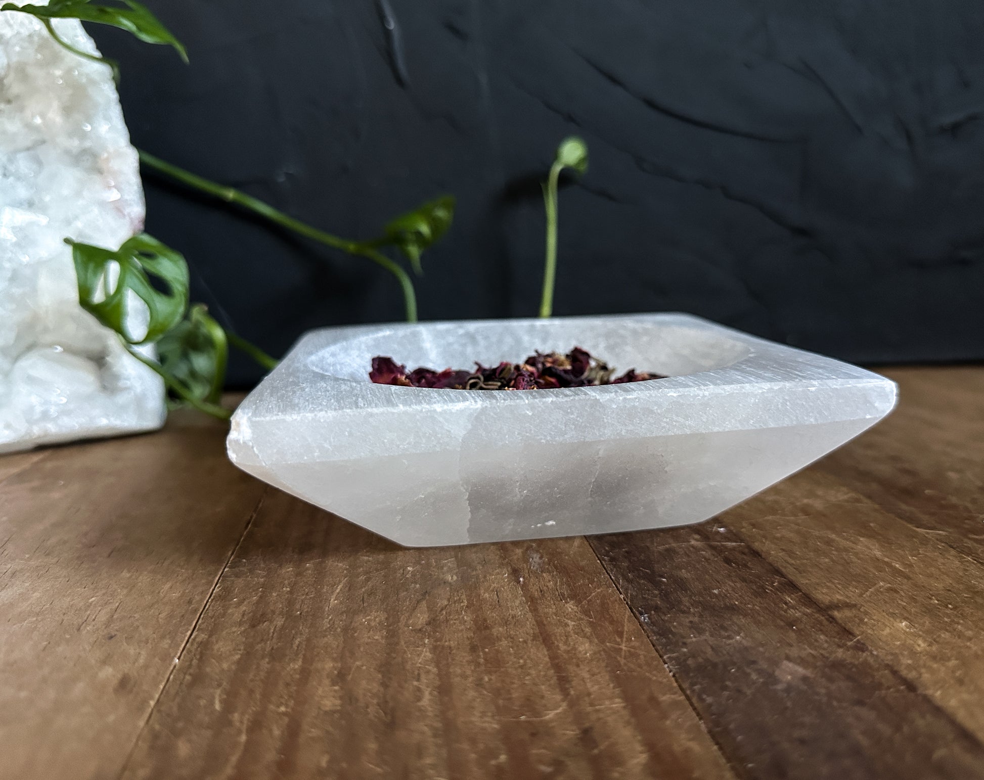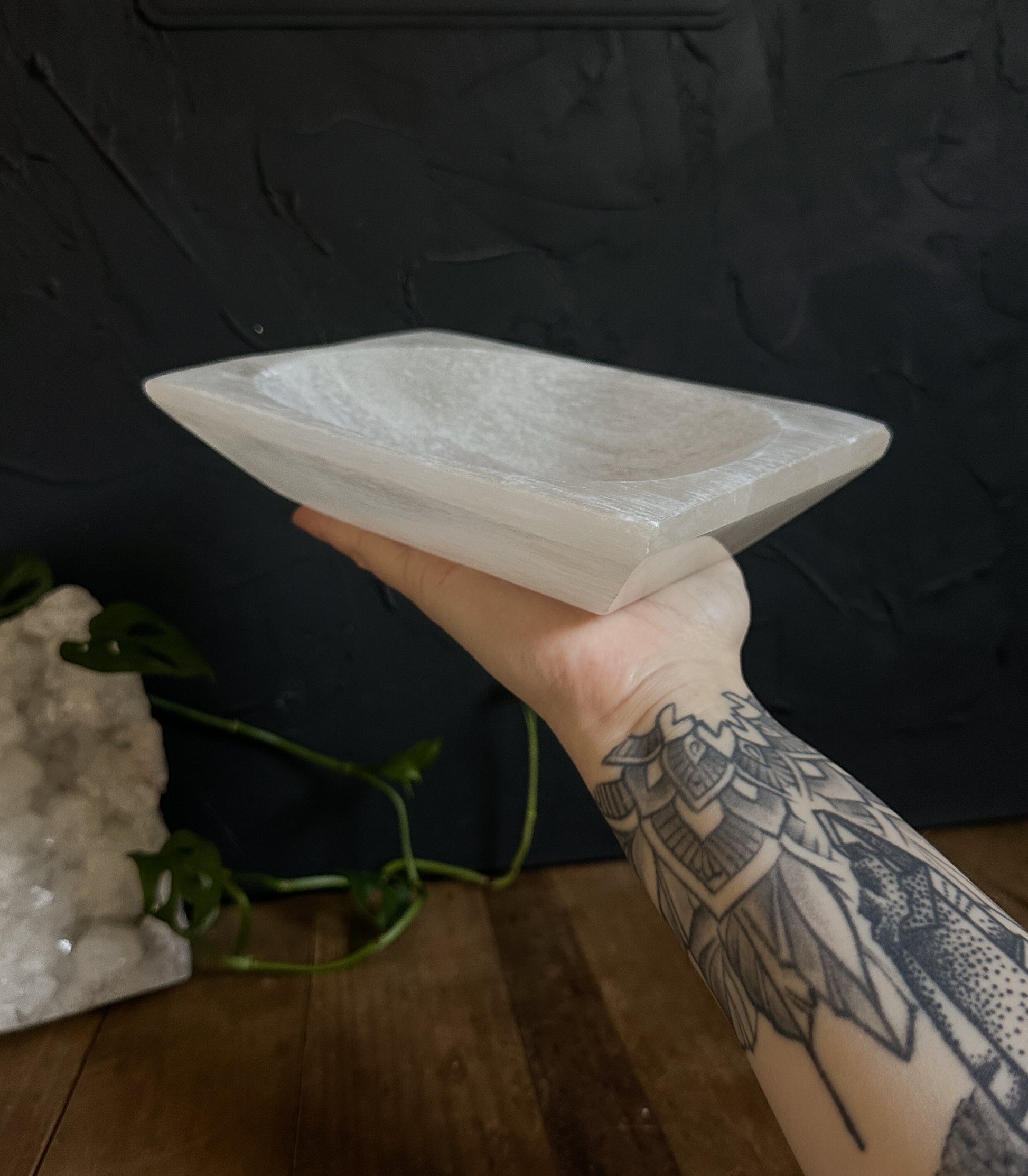 As gorgeous as this Selenite Square Bowl is, it does have a dinged corner. Despite its imperfection, this crystal bowl still radiates energy and holds the potential to enhance your spiritual practice, meditation sessions, or home decor.
