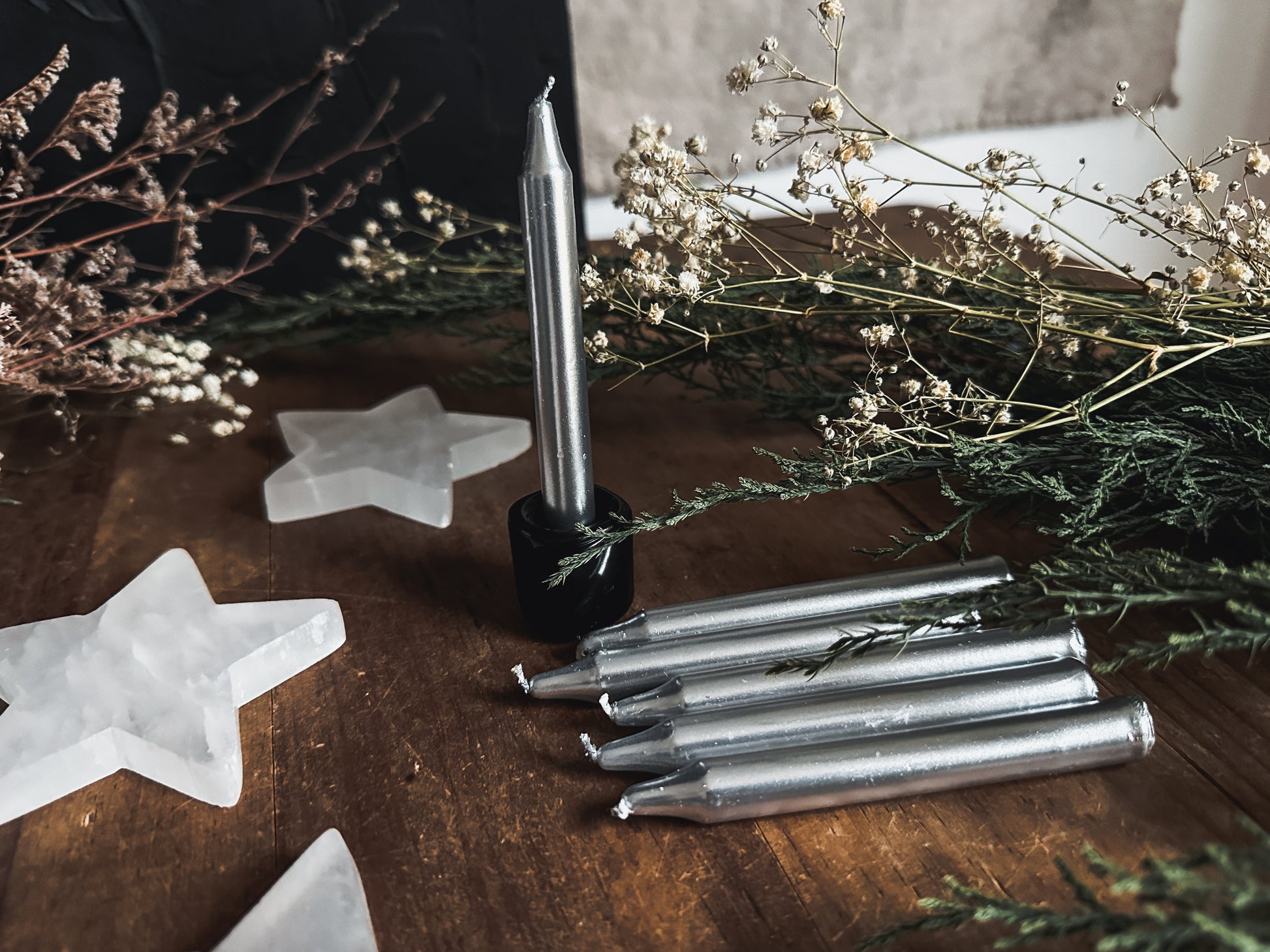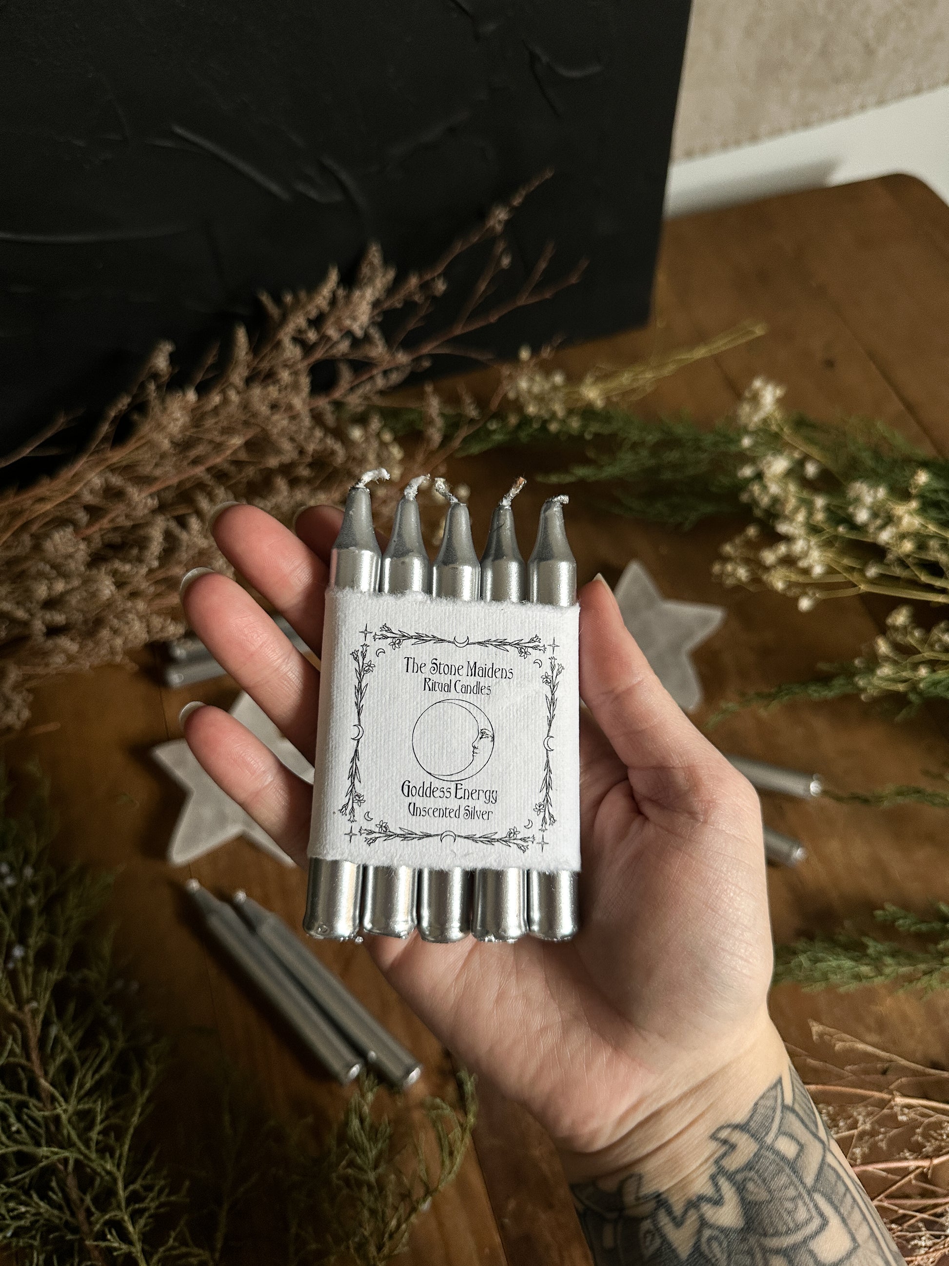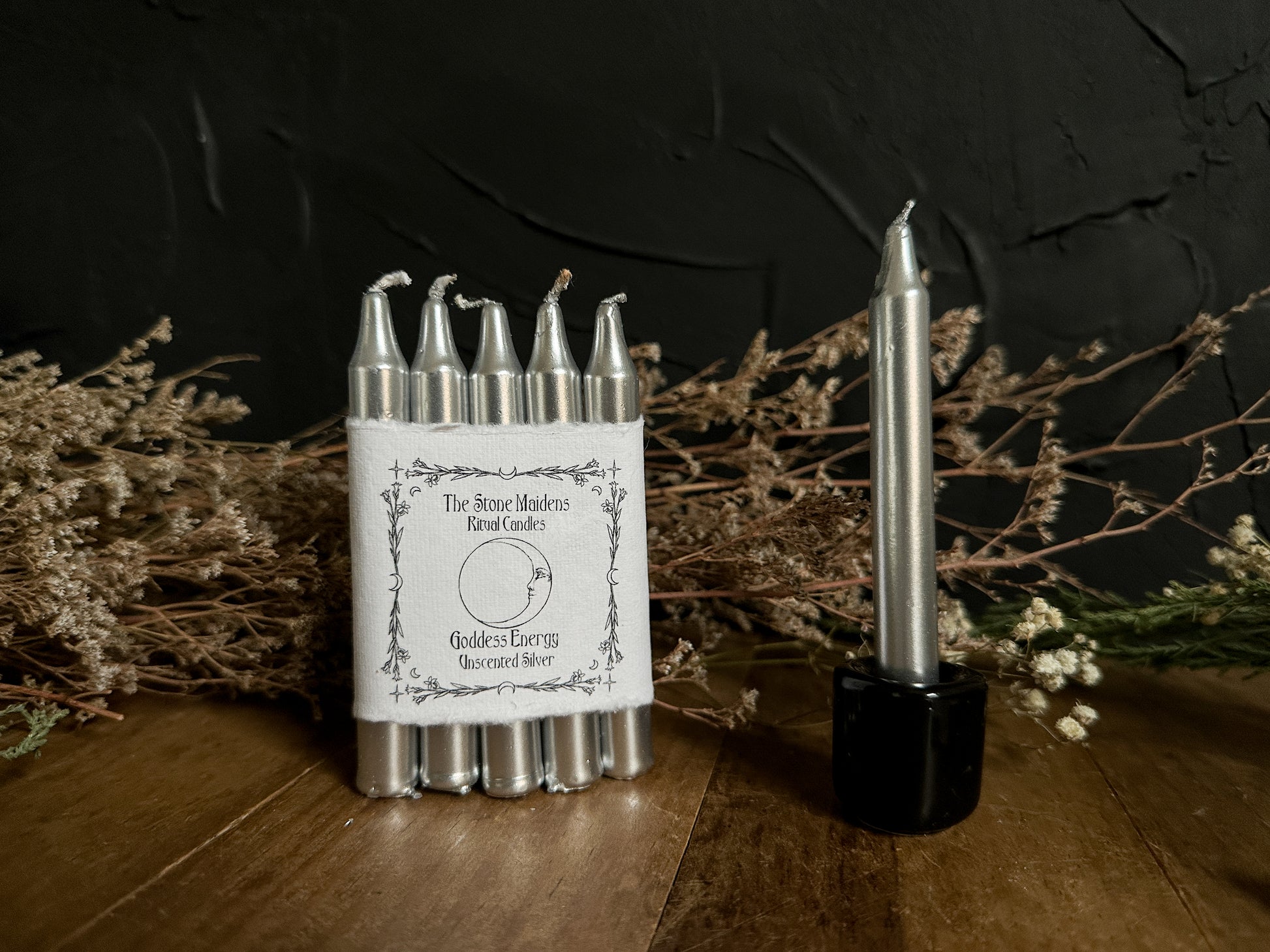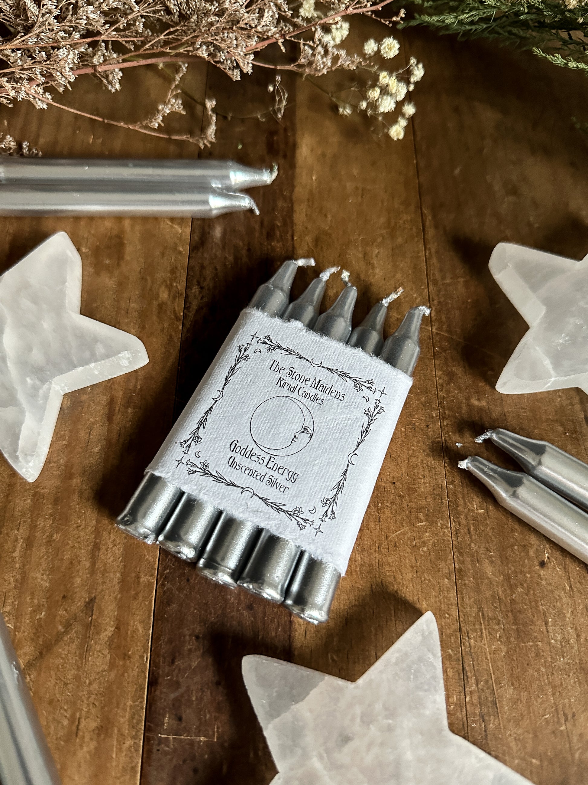 Silver candles are often associated with Lunar Goddess, Moon Magic, Intuition and Hidden Knowledge.