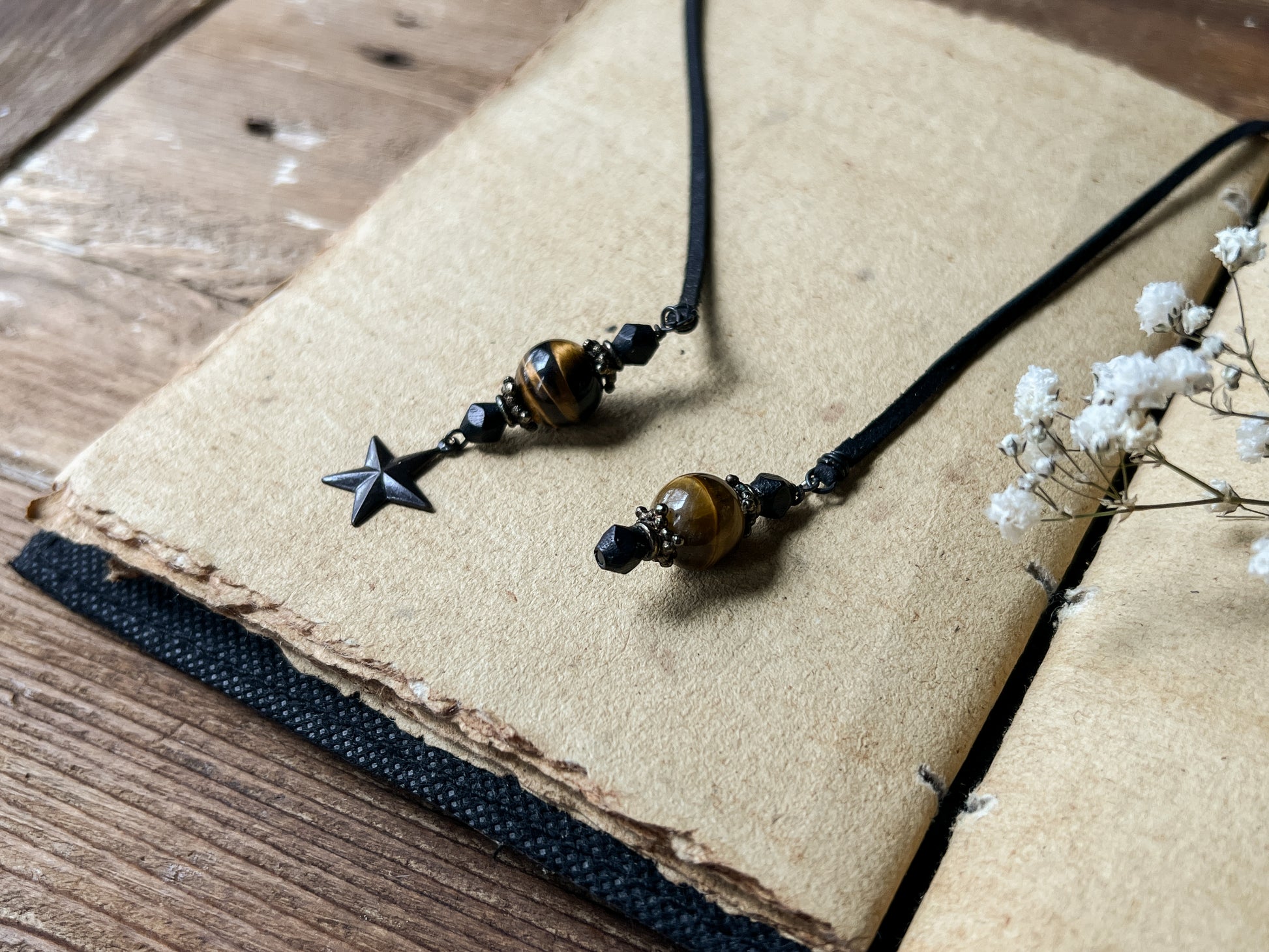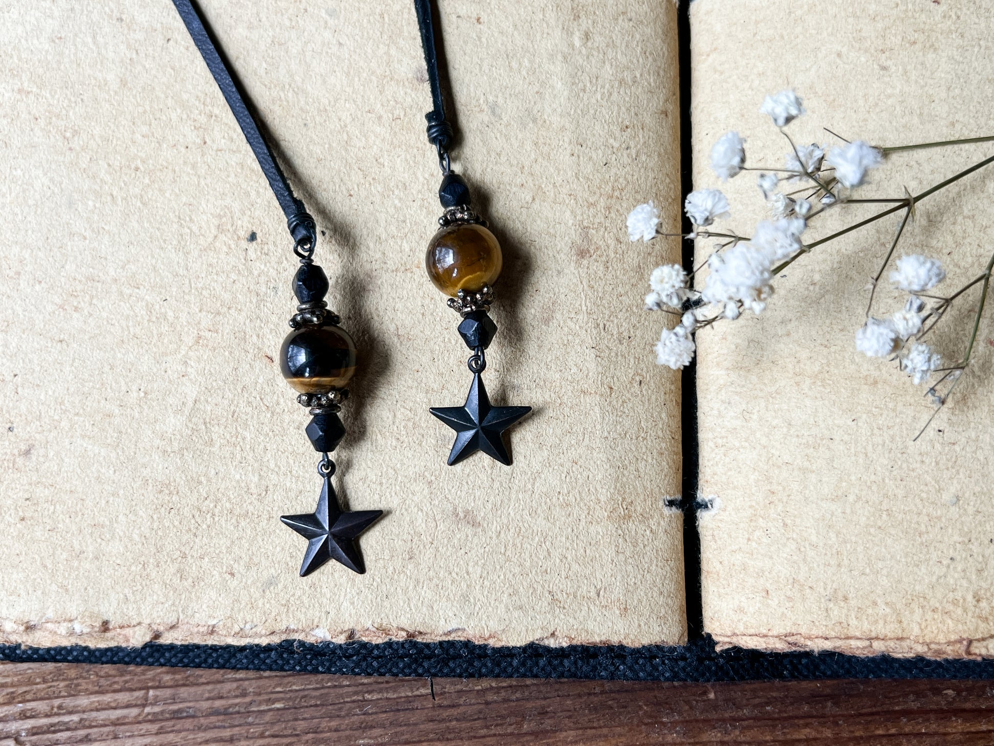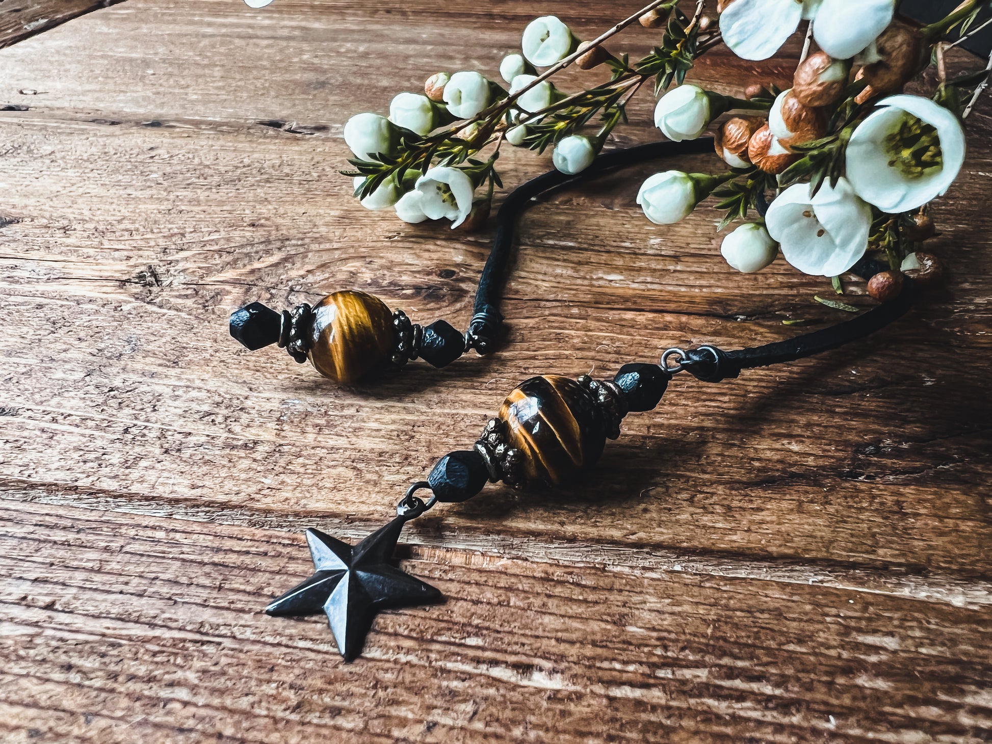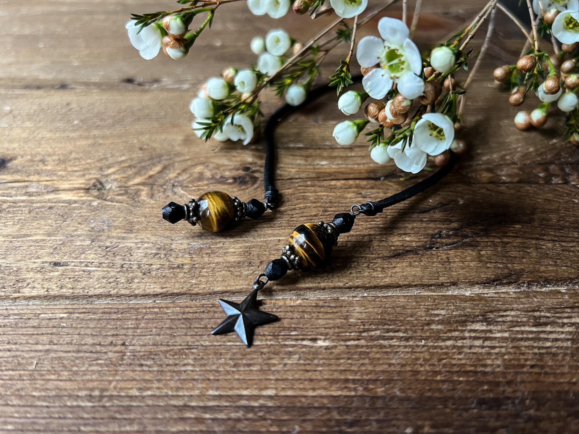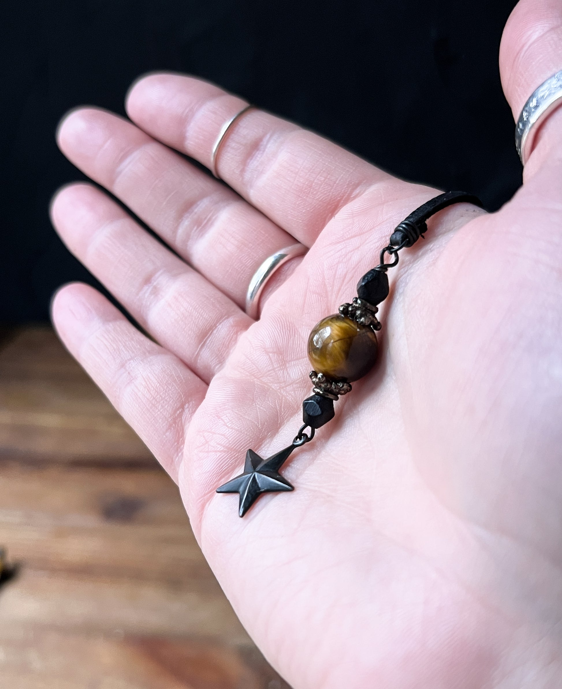 We adorned This Faux Leather strap with 2 gorgeous Tiger Eyes Spheres on either side and one dark brass Star. The choice is yours where you want the STAR to hang from.