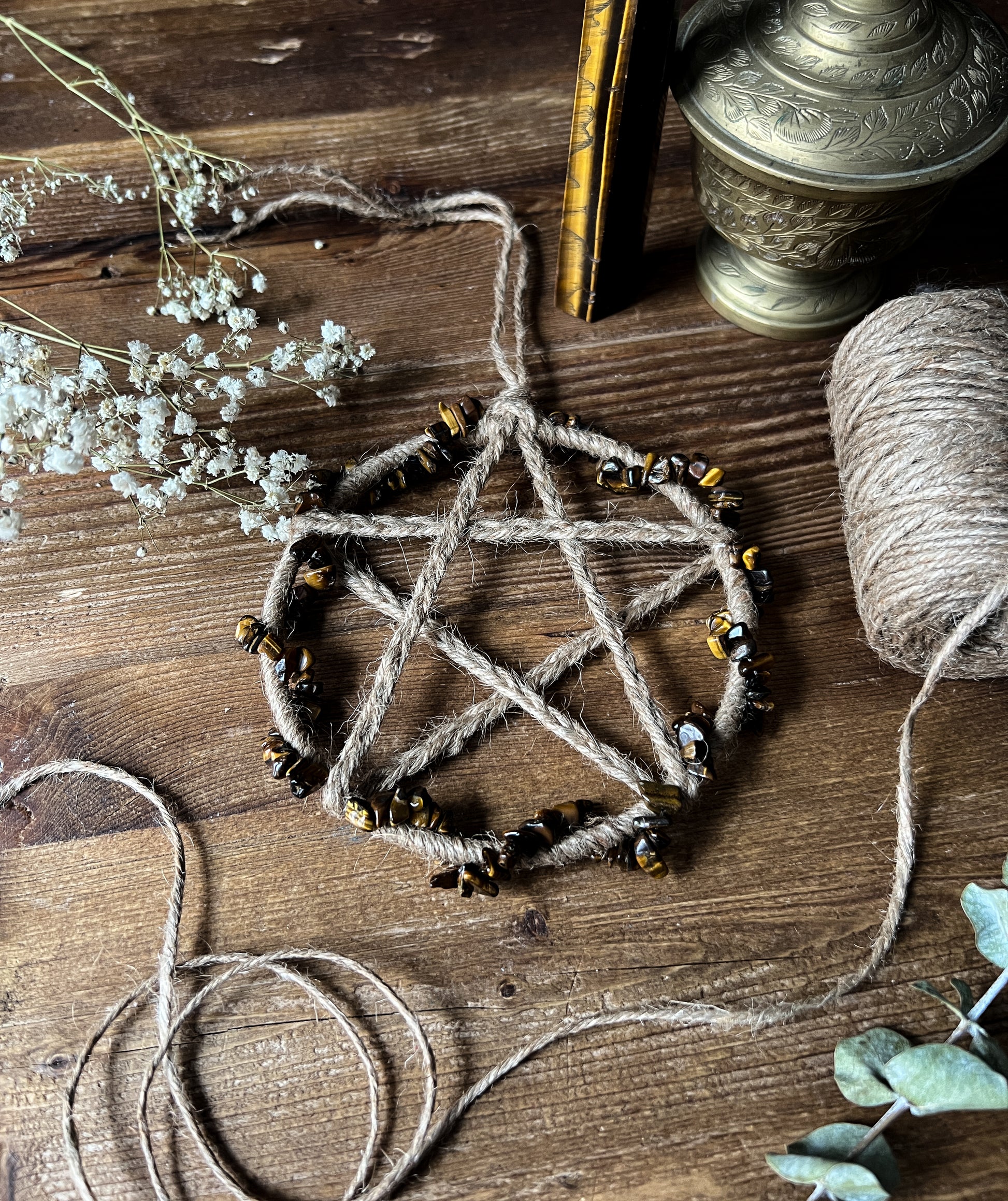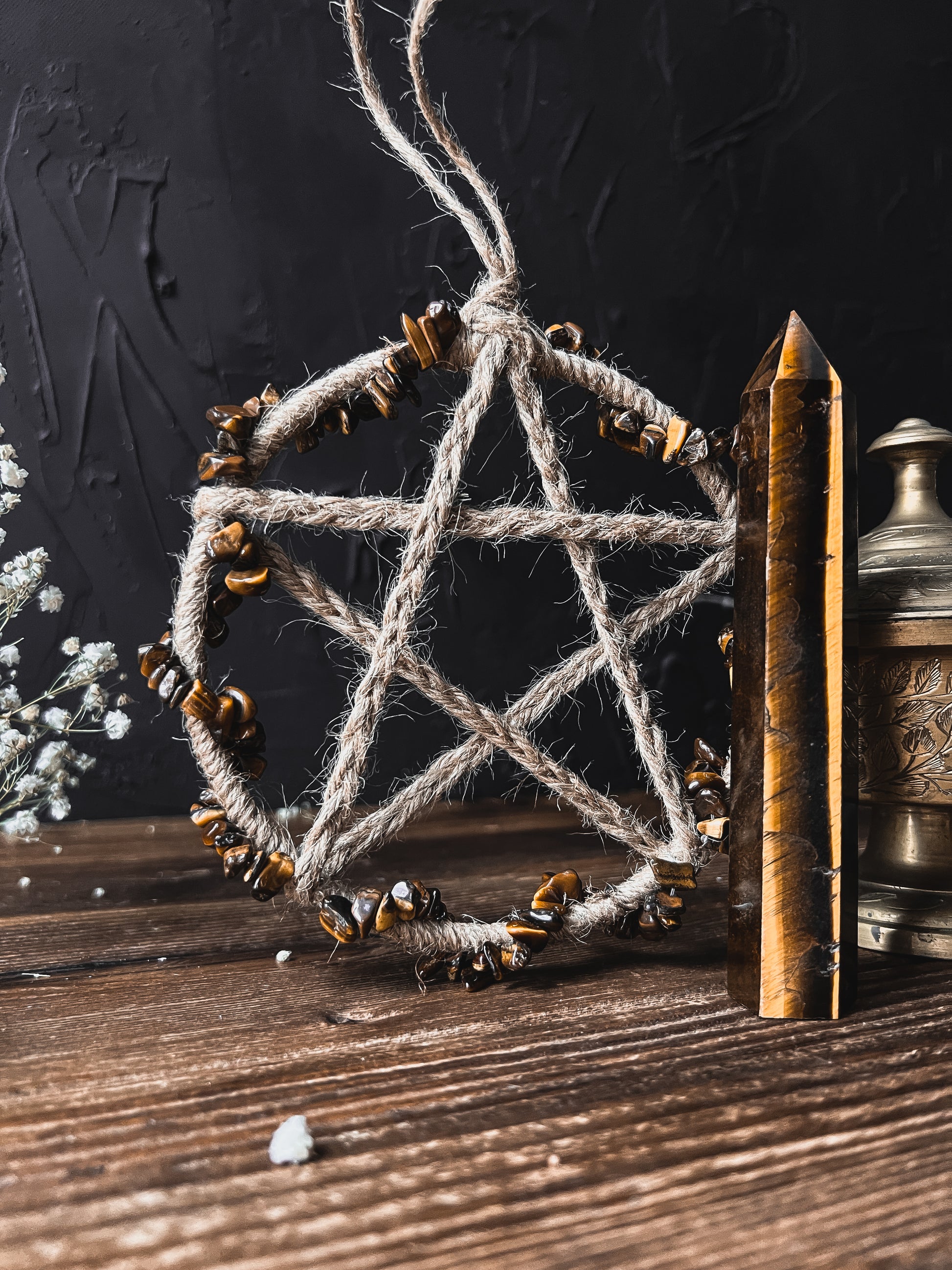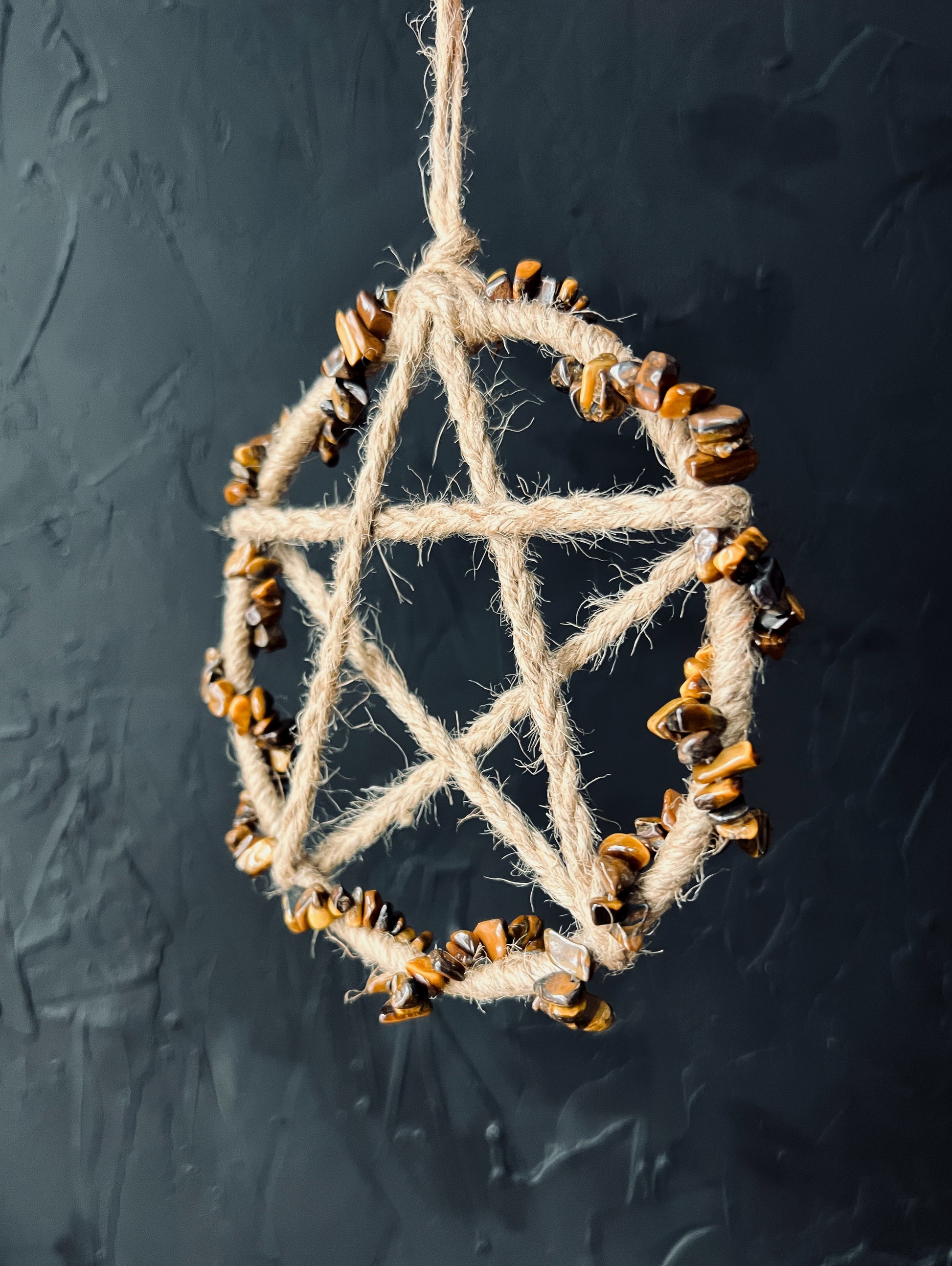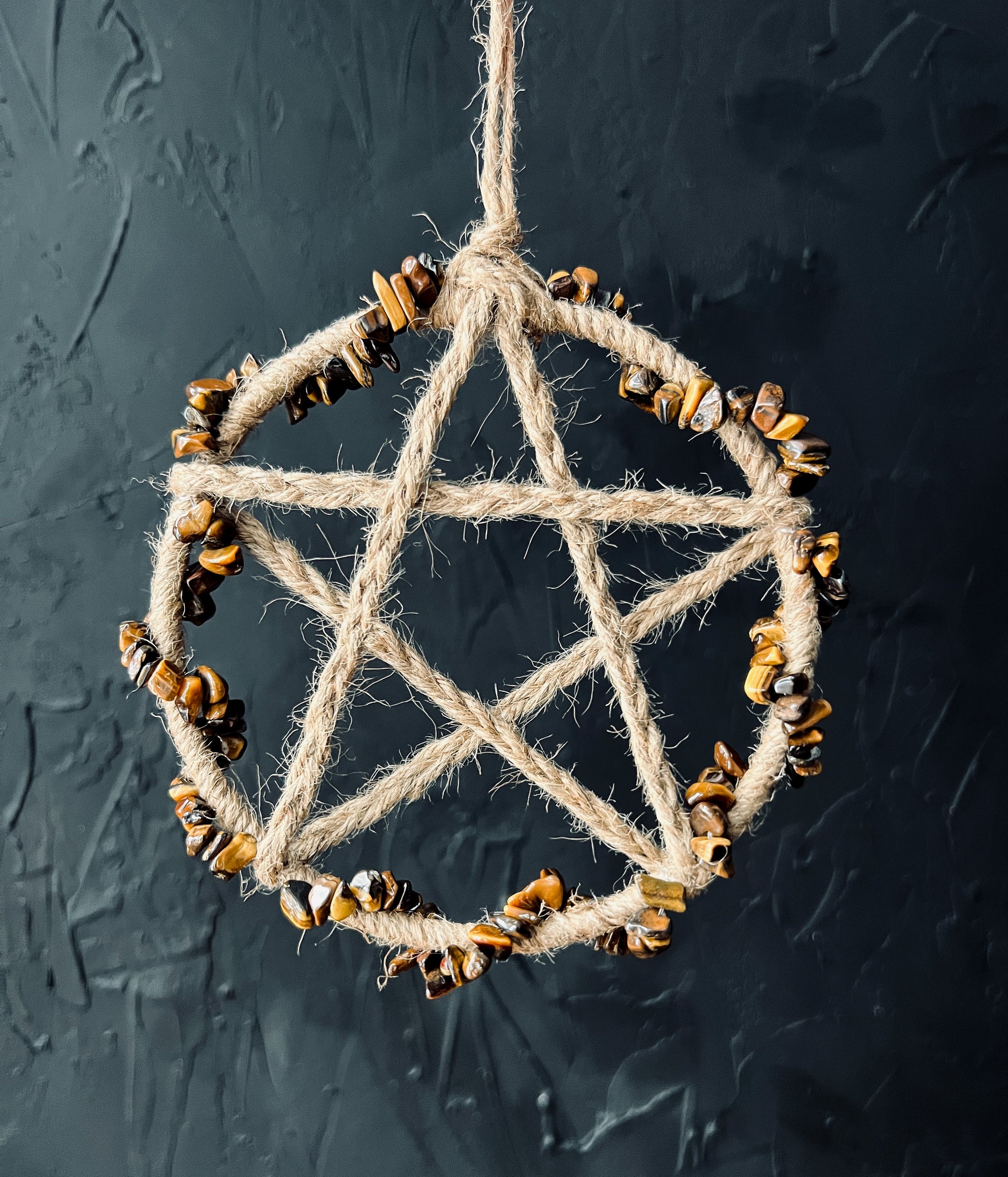This beautiful Tiger's Eye Pentacle Wall Hanging measures 5 inches.