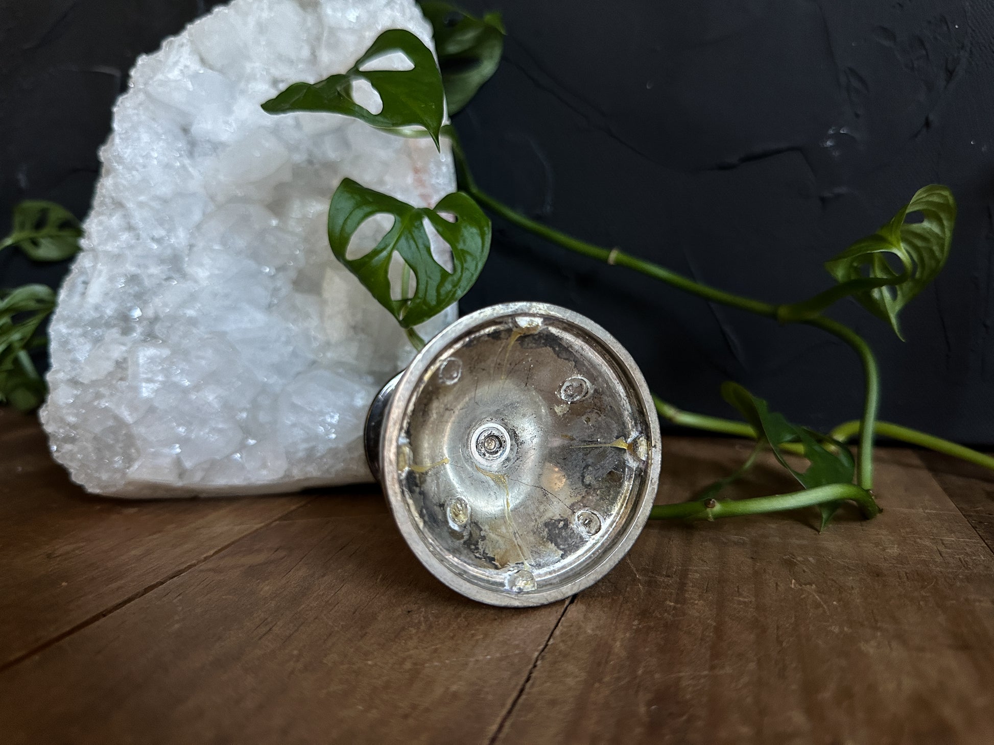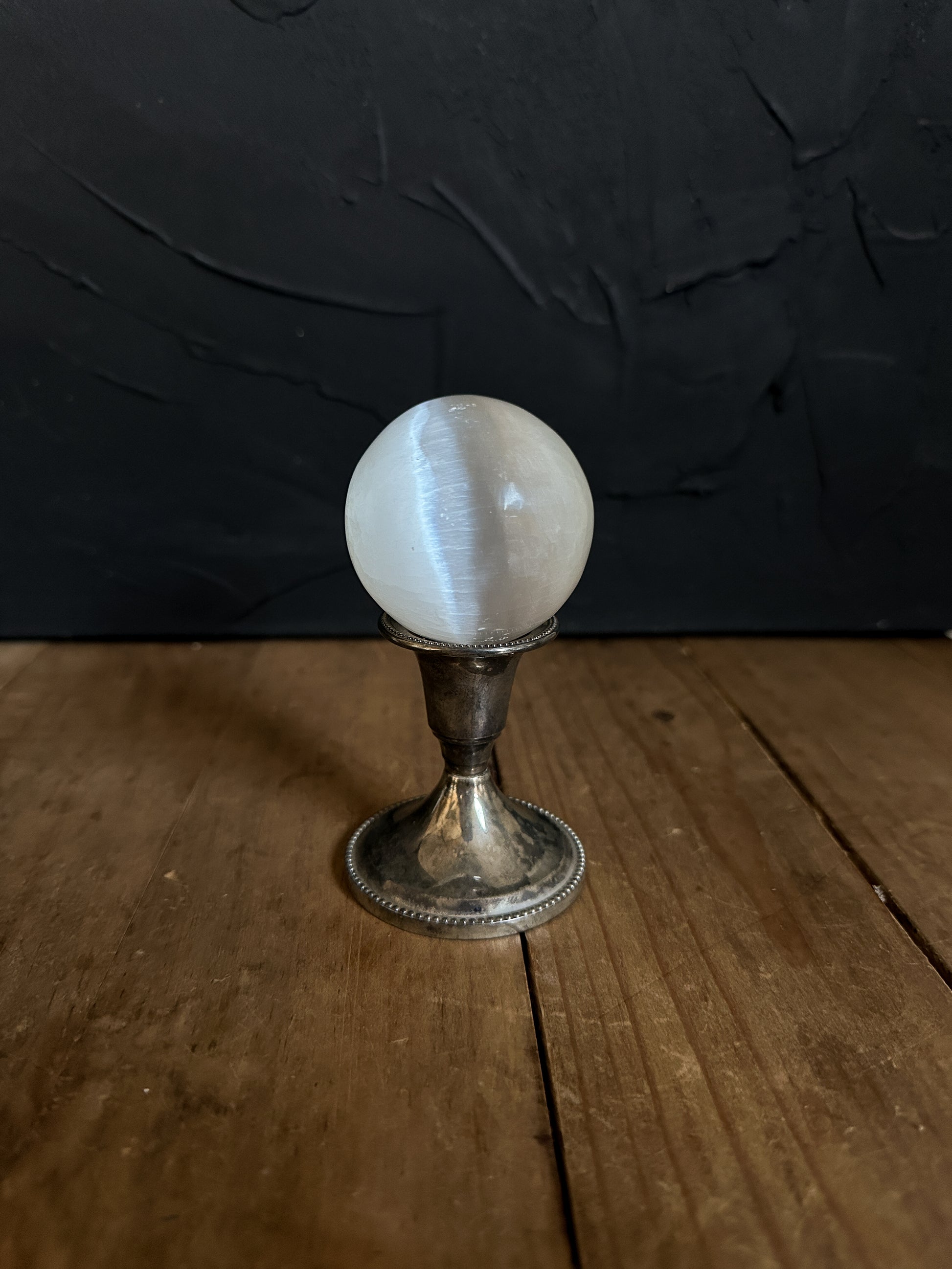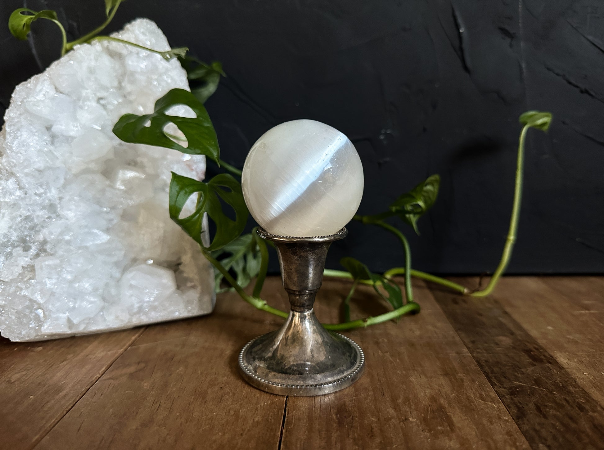 This cute vintage silver plated candle holder is the perfect Crystal Ball stand! This stand comes with the Selenite Sphere shown.
