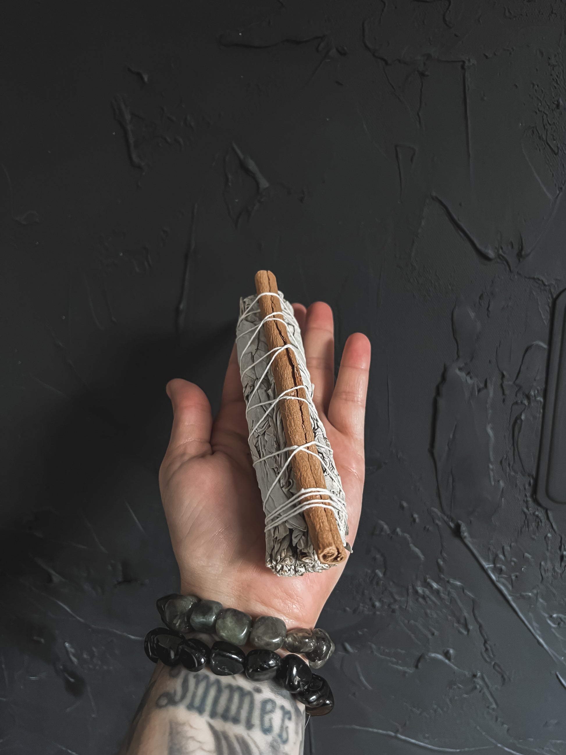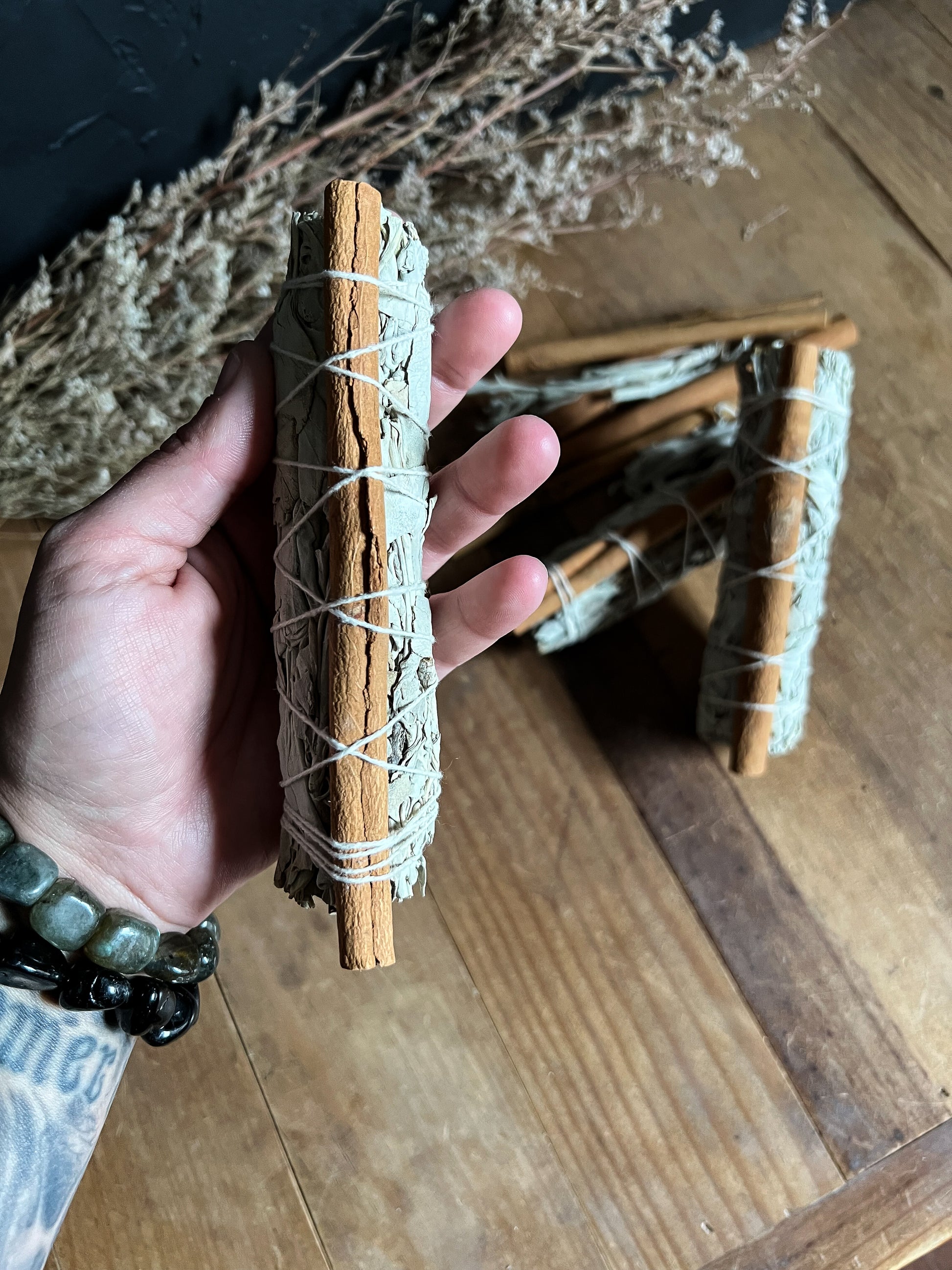 The sweet, spicy notes of cinnamon evoke the cozy, autumnal spirit, while the timeless power of White Sage brings a touch of mysticism to your sacred space. Each bundle is truly one-of-a-kind, ensuring that every bundle is slightly unique yet closely resembles the ones pictured.