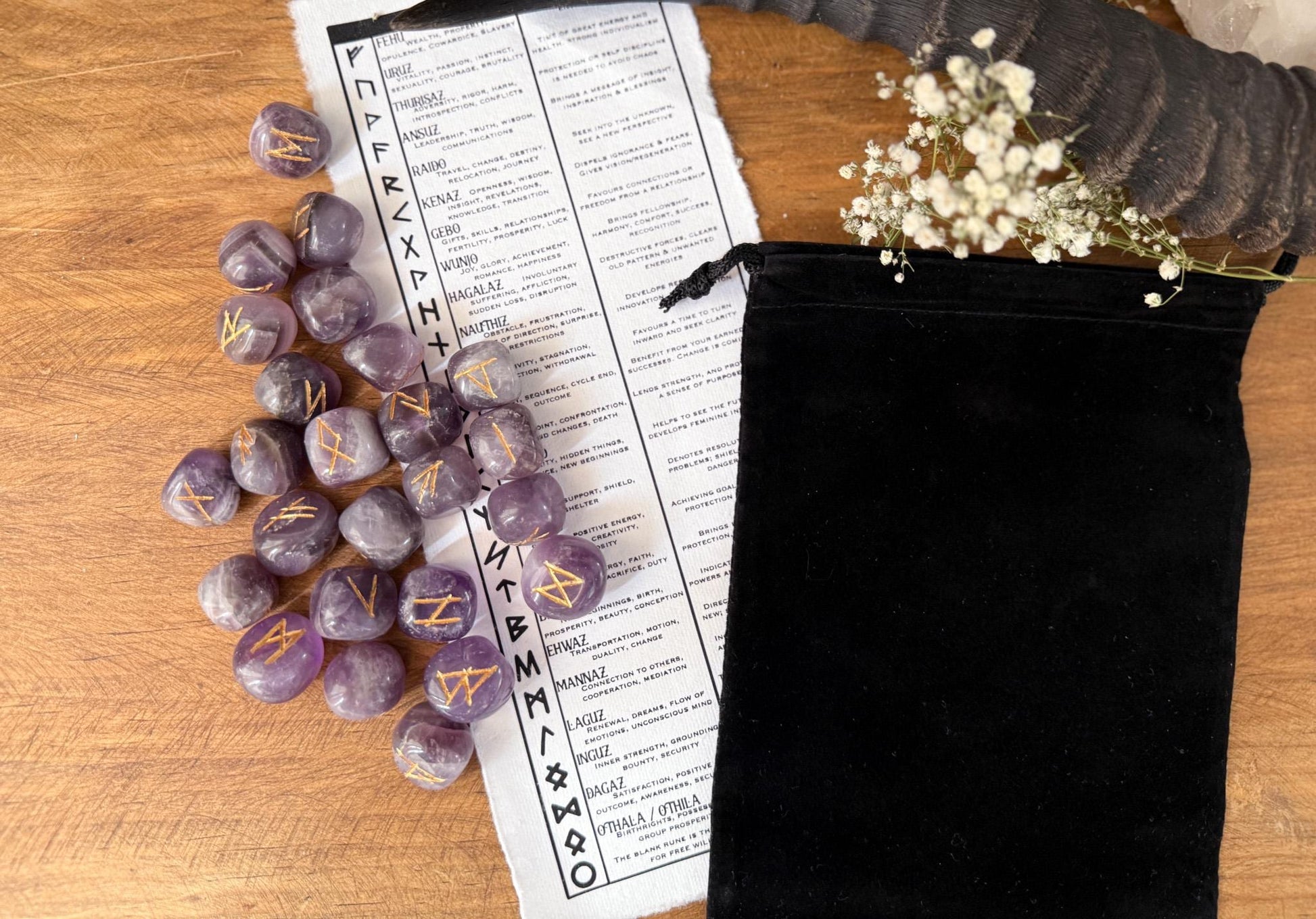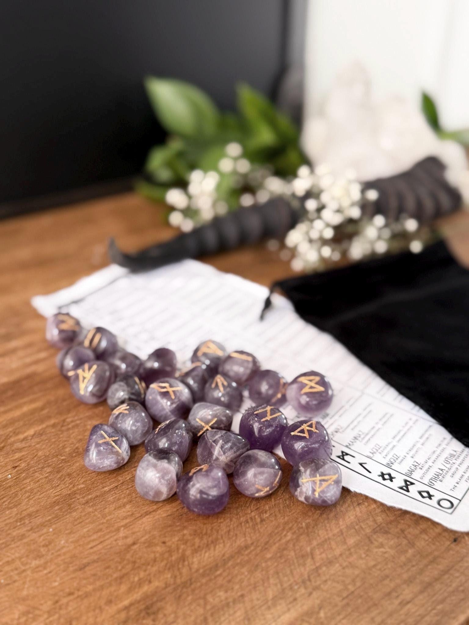 You will receive 1 Set of Amethyst Runes which contains 25pc Elder Futhark Runes, that come in a black velvet bag with a printed out meaning guide on handmade cotton paper.