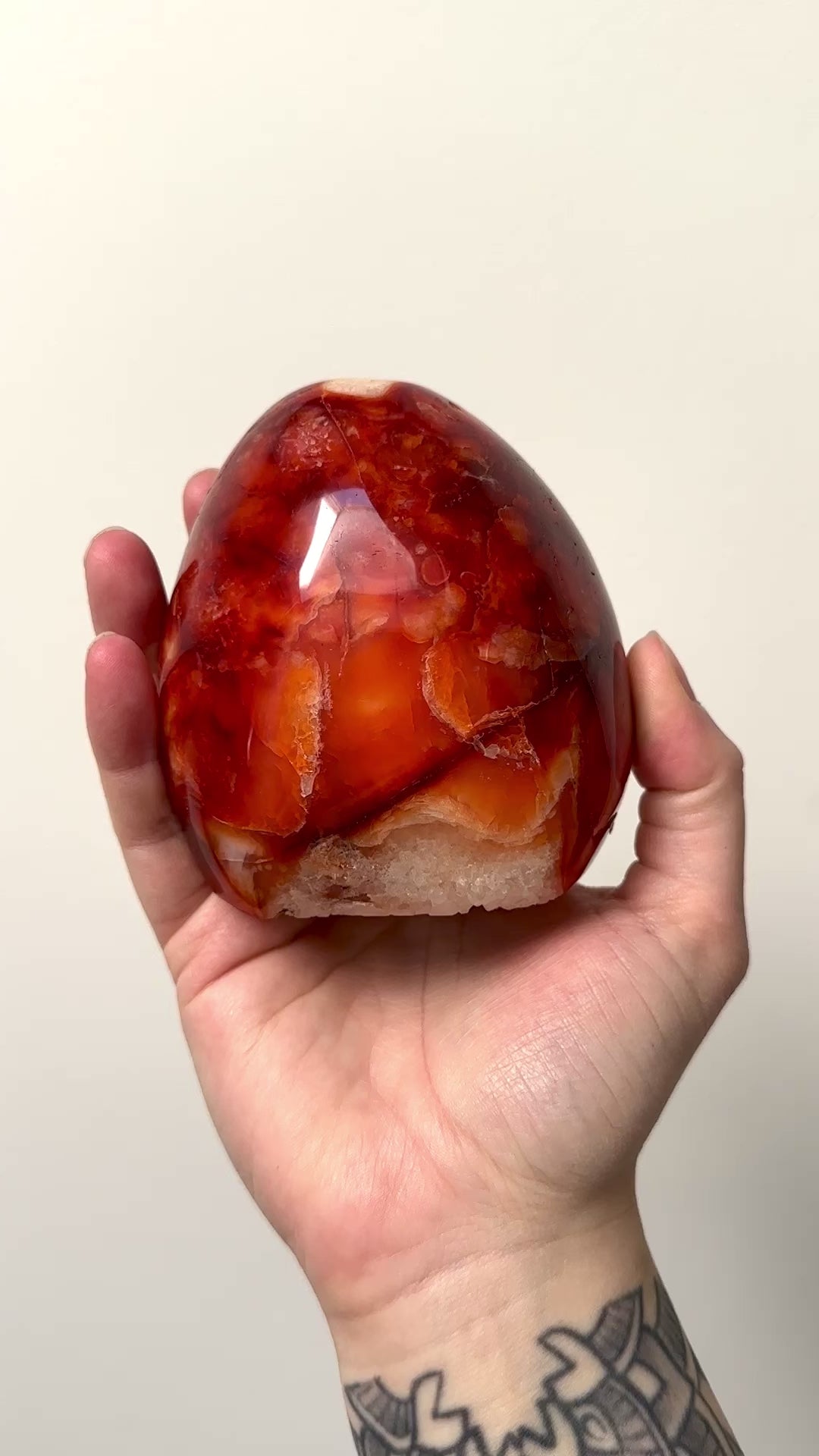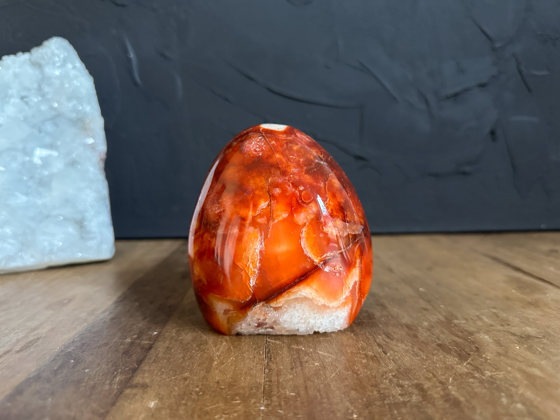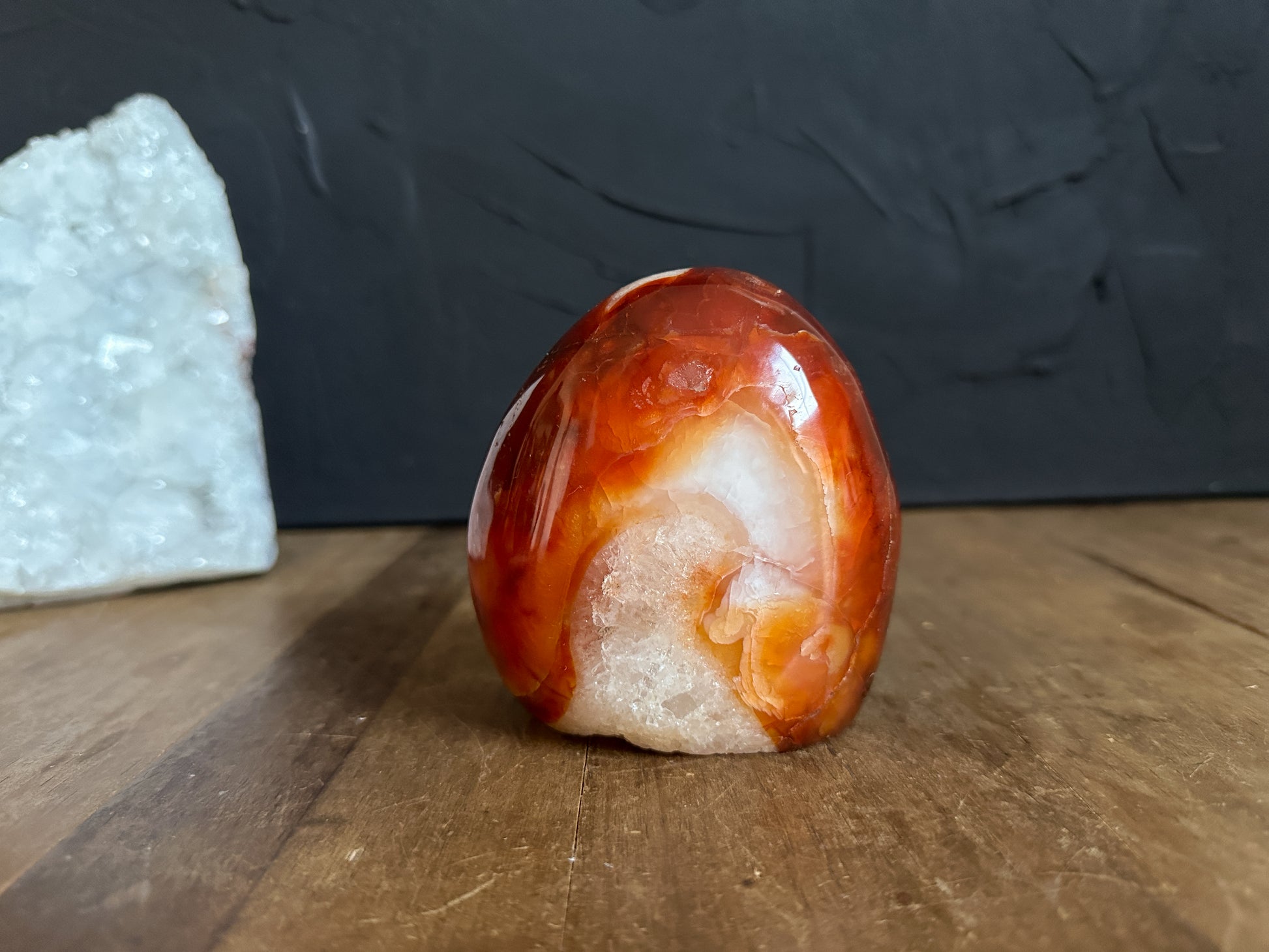 This mesmerizing Carnelian Freeform is adorned with dark red and orange hues complemented by hints of quartz. Each side radiates warmth and vitality, making it a captivating addition to any collection or space.