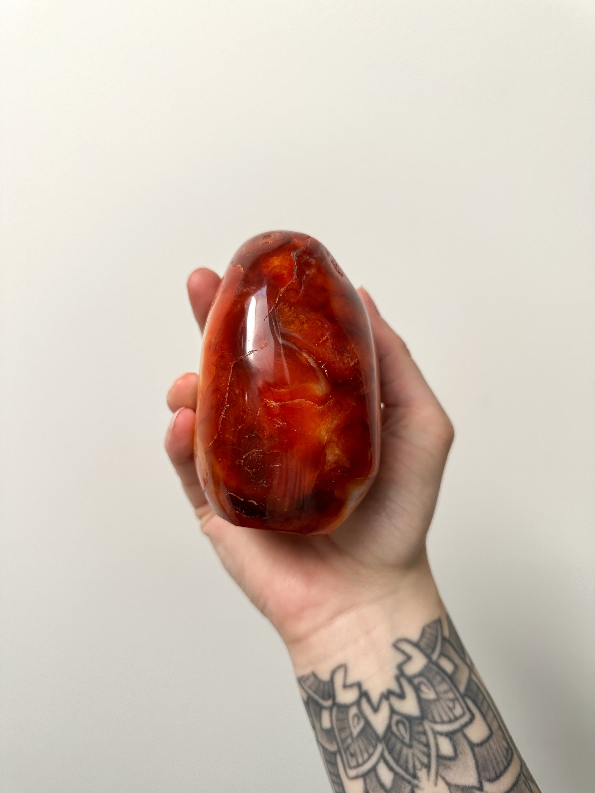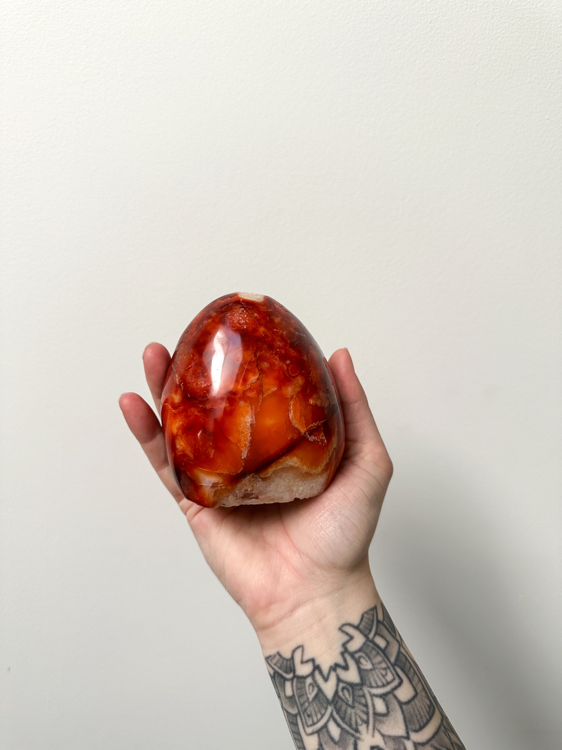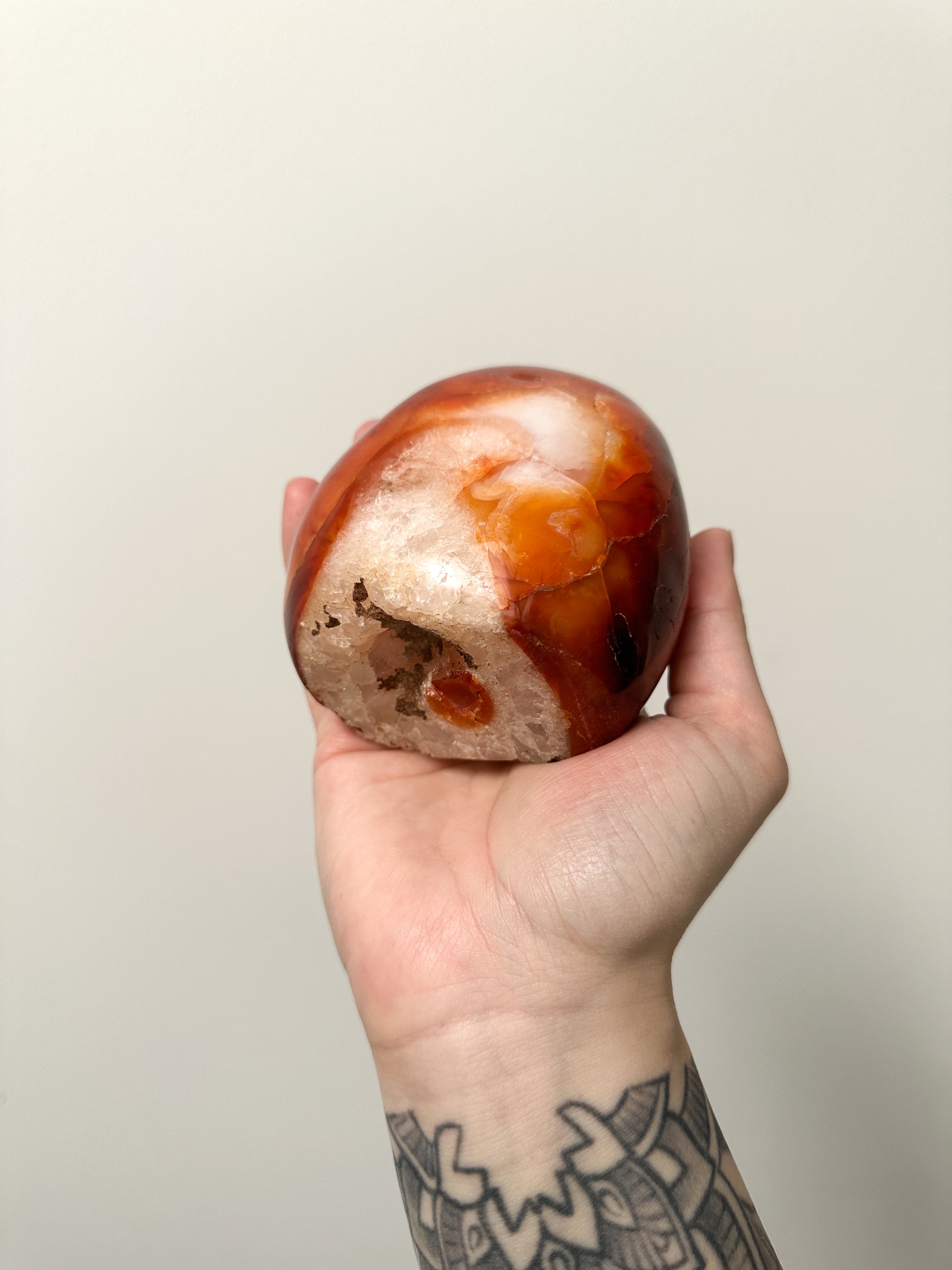 This mesmerizing Carnelian Freeform is adorned with dark red and orange hues complemented by hints of quartz. Each side radiates warmth and vitality, making it a captivating addition to any collection or space.