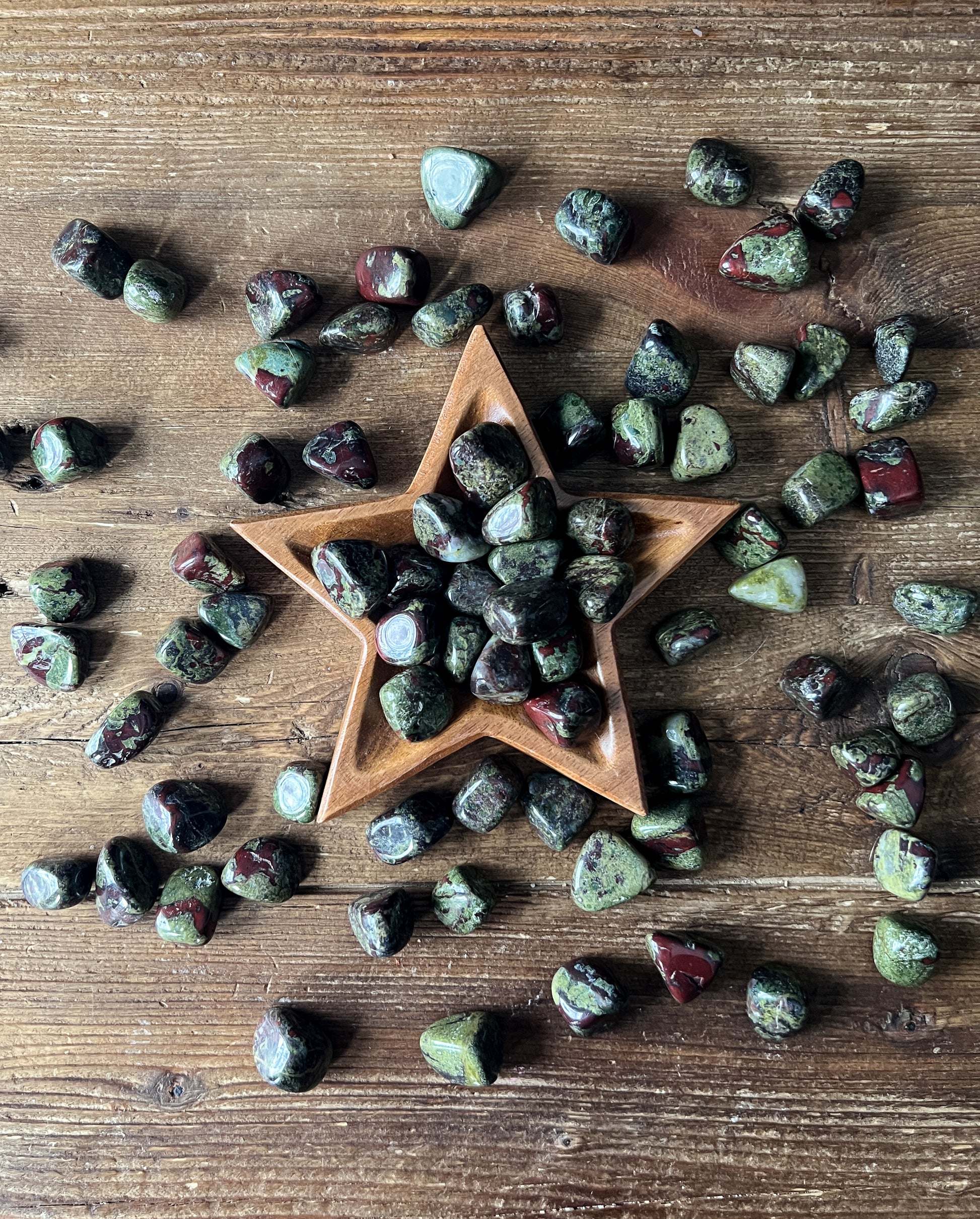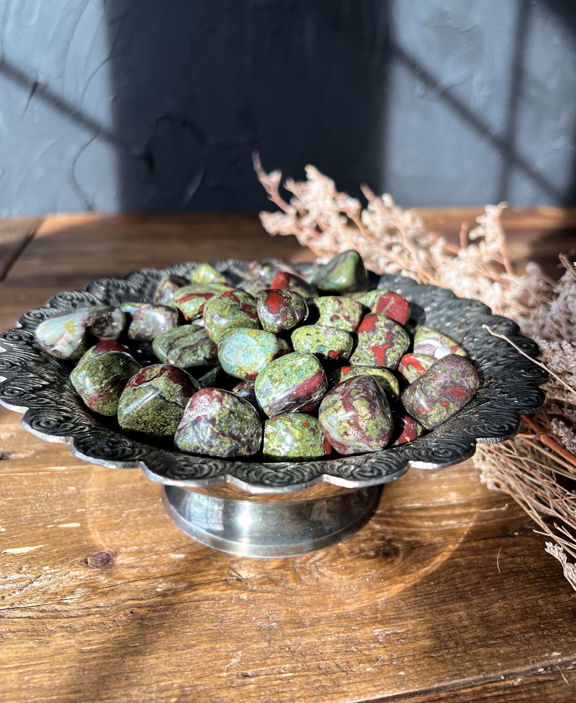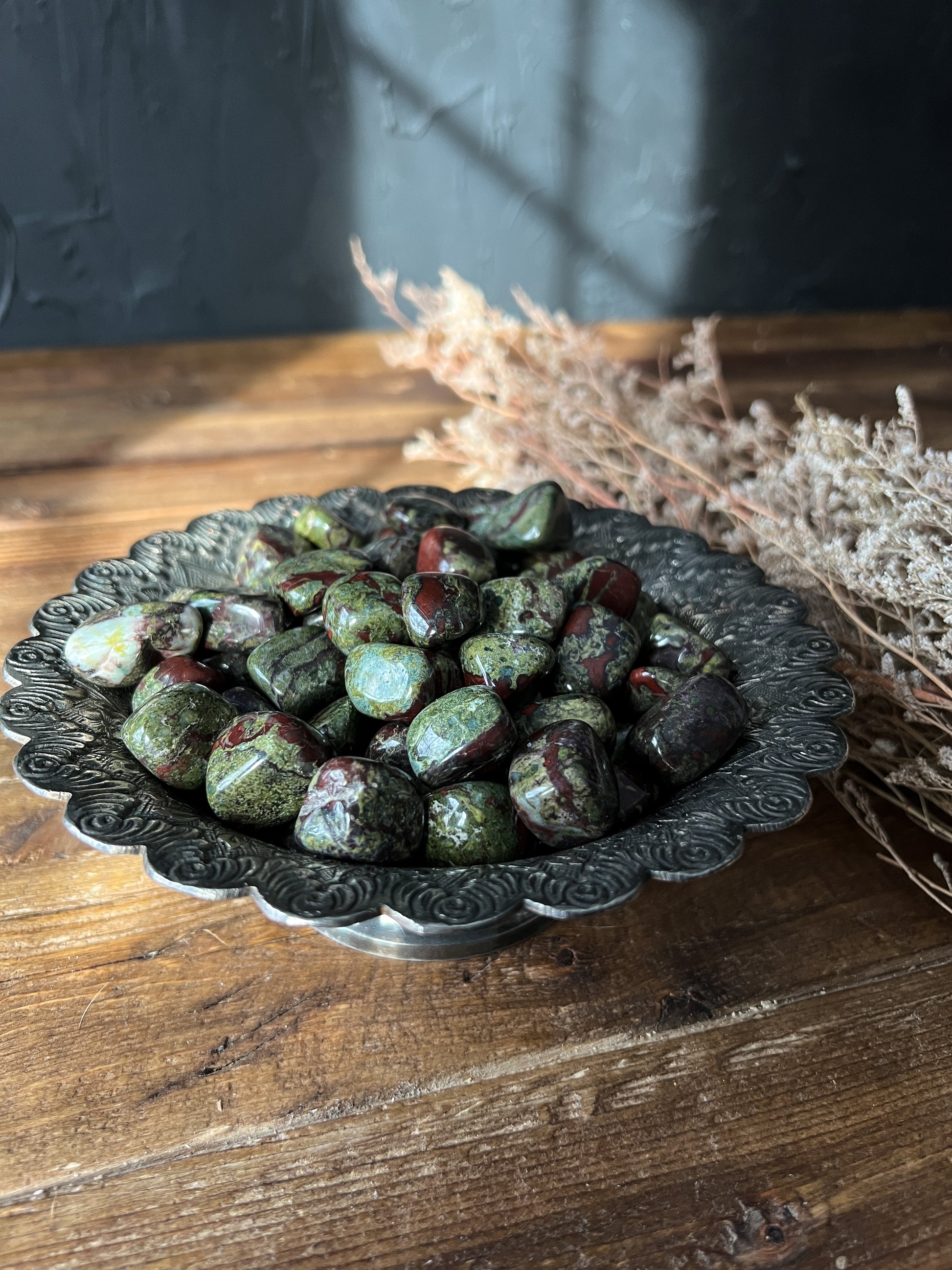 Healing Properties: Dragon's Blood, with its rich green and red hues, aligns with the root and heart chakras. Recognized for its distinctive appearance resembling the mythical dragon's blood, this crystal is believed to enhance strength, courage, and love. It is associated with promoting grounding energy, emotional healing, and the release of past traumas. Dragon's Blood is thought to assist in connecting with the earth's energy, fostering inner strength, and supporting a harmonious balance between courage and compassion.