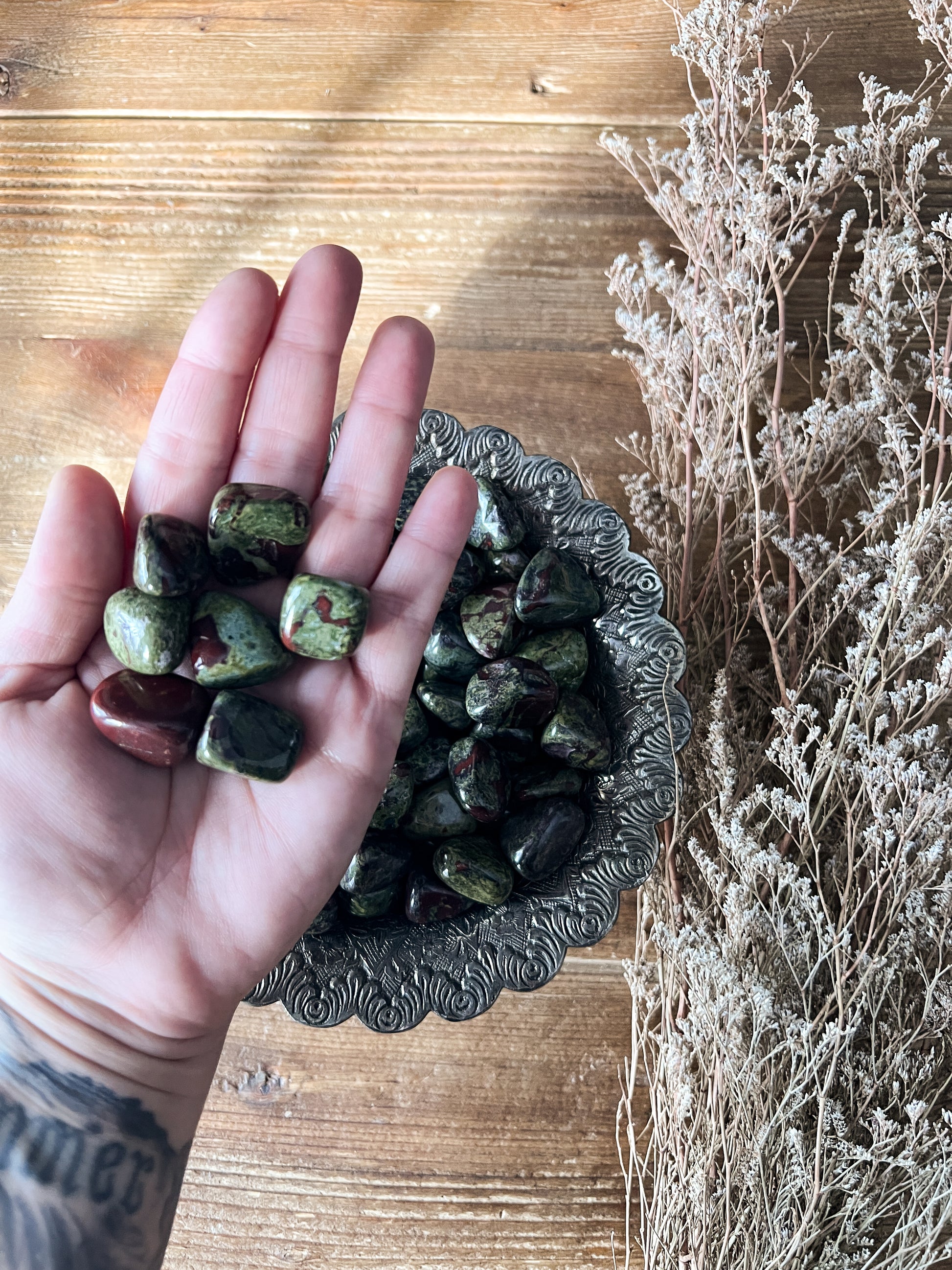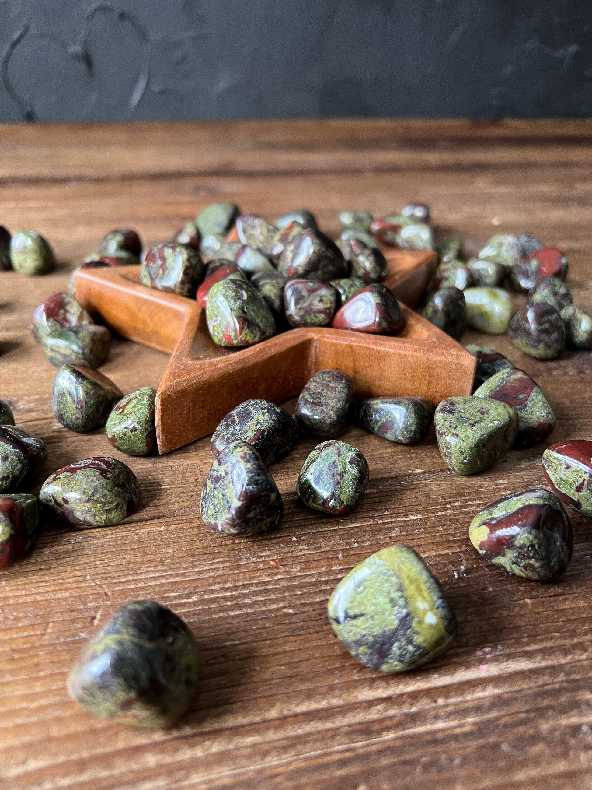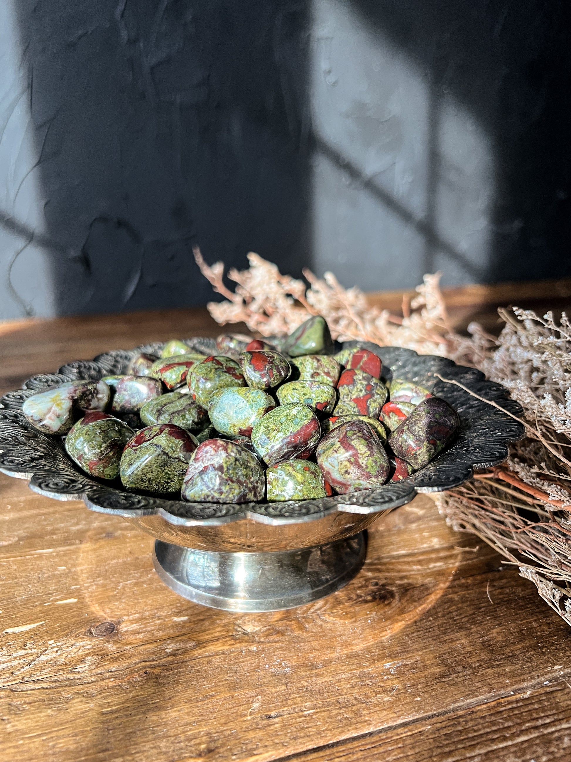 Healing Properties: Dragon's Blood, with its rich green and red hues, aligns with the root and heart chakras. Recognized for its distinctive appearance resembling the mythical dragon's blood, this crystal is believed to enhance strength, courage, and love. It is associated with promoting grounding energy, emotional healing, and the release of past traumas. Dragon's Blood is thought to assist in connecting with the earth's energy, fostering inner strength, and supporting a harmonious balance between courage and compassion.
