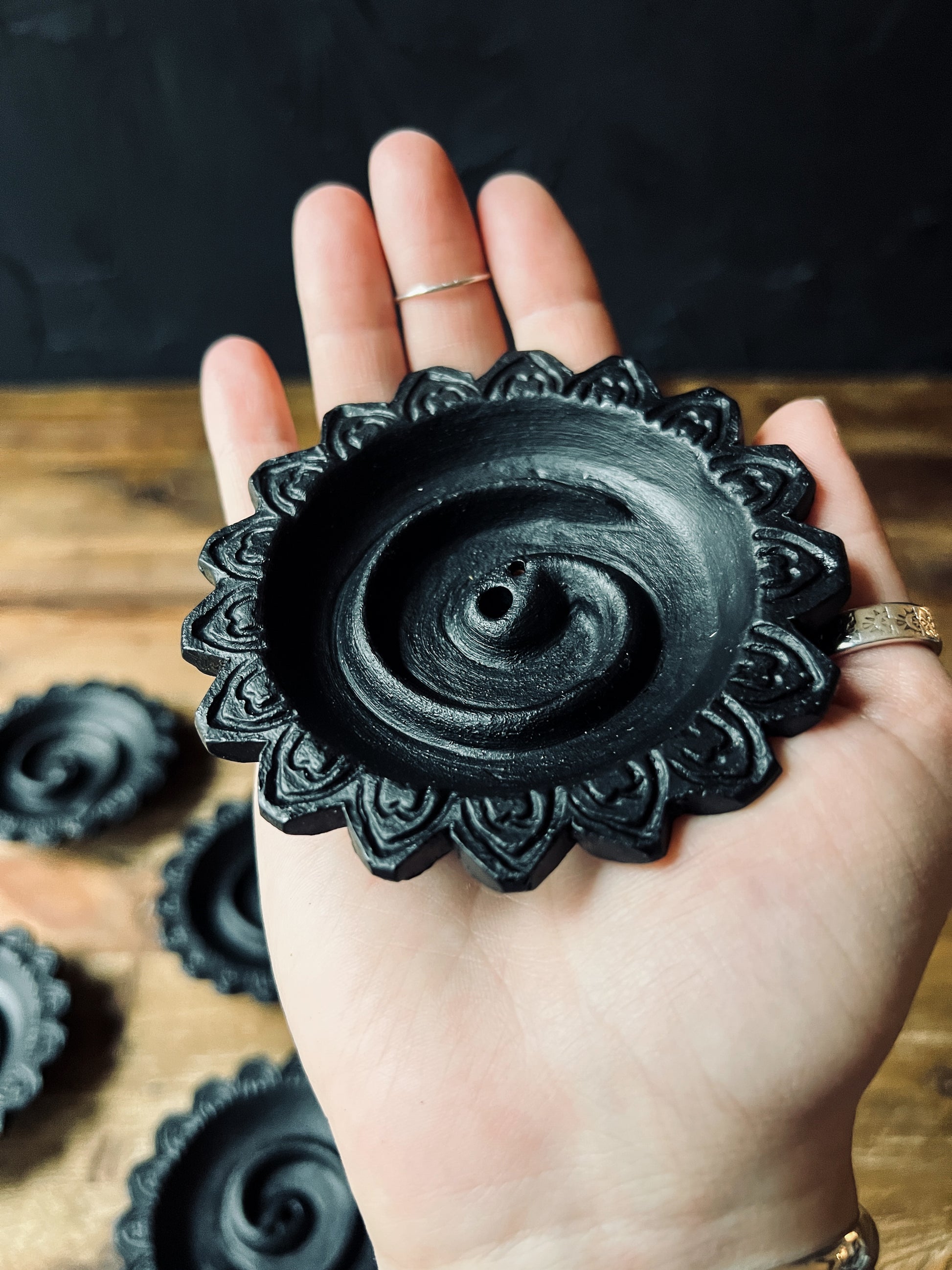 This beautiful black Incense burner is perfect for catching any incense ash! It features two different holes to accommodate your favourite form of incense. One larger hole for rope incense and a smaller hole for incense sticks.