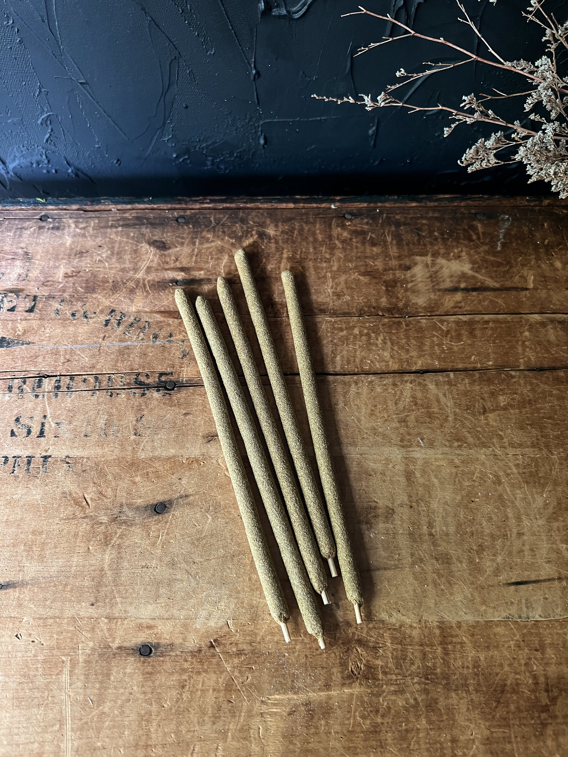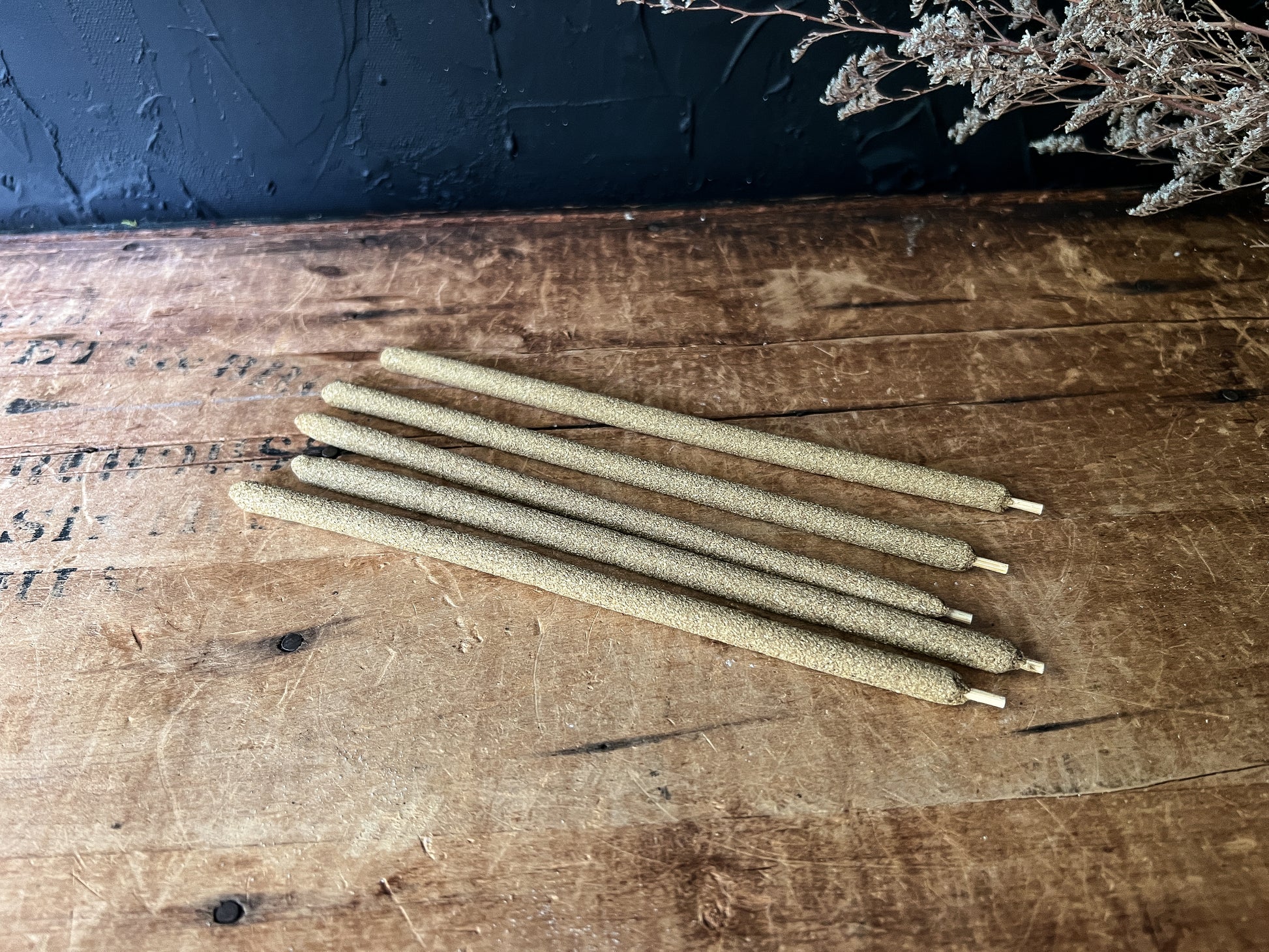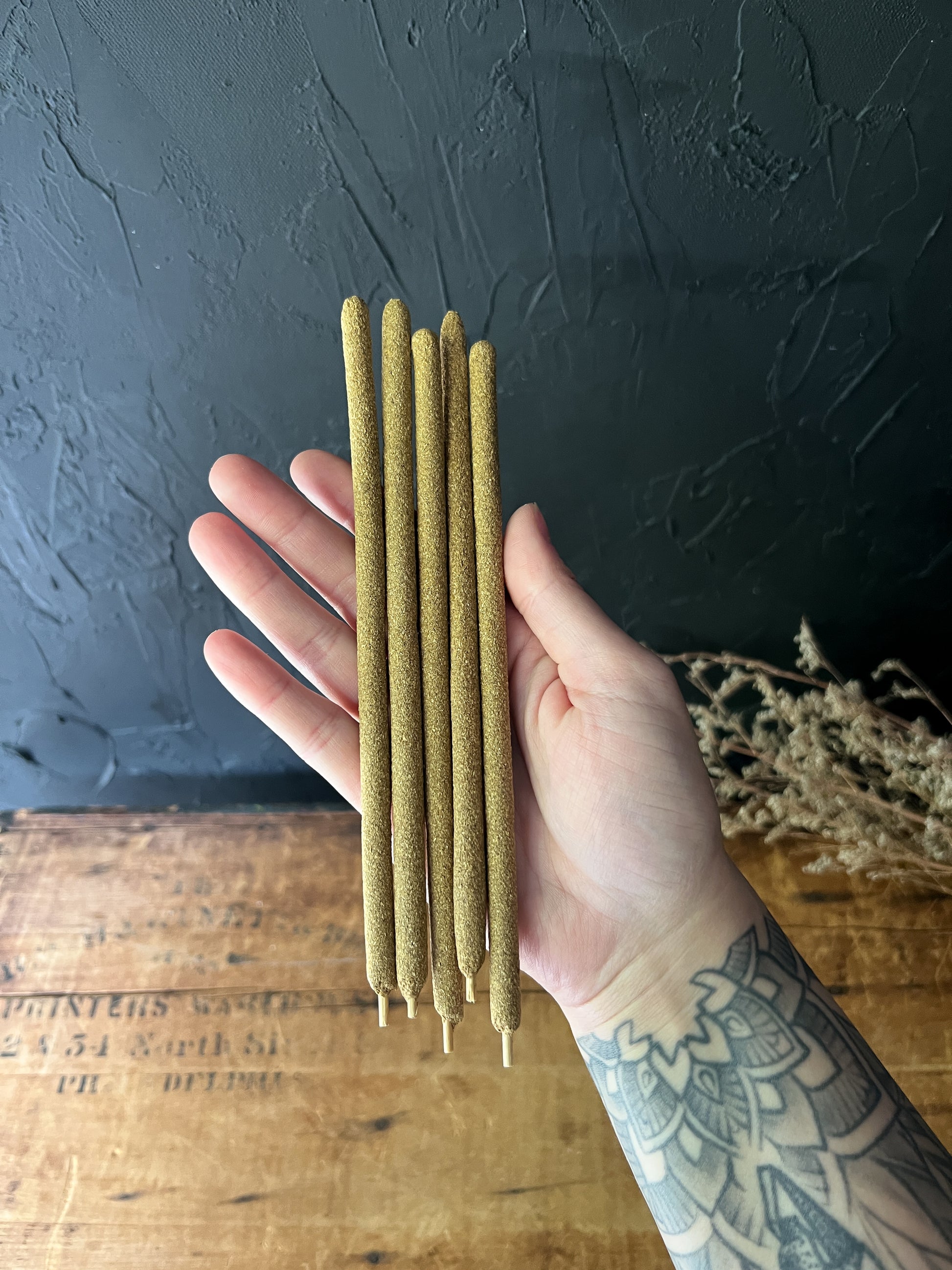 Palo Santo wood is harvested under government supervision by the natives of the Peruvian jungle. No trees are destroyed in the collection of the wood, only twigs and branches on the ground are collected. Our Palo Santo sticks are made from Palo Santo oil and powder mixed together.