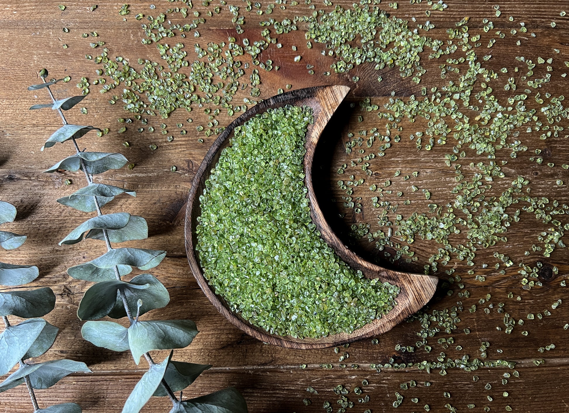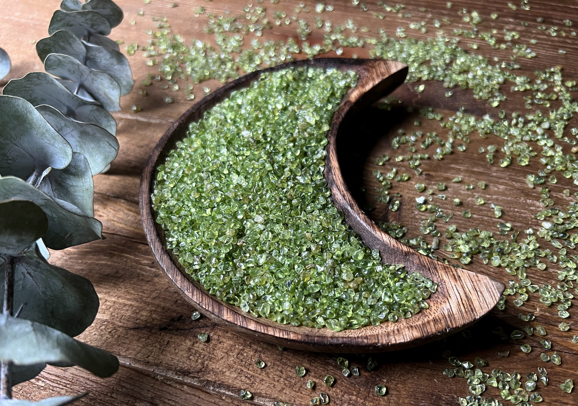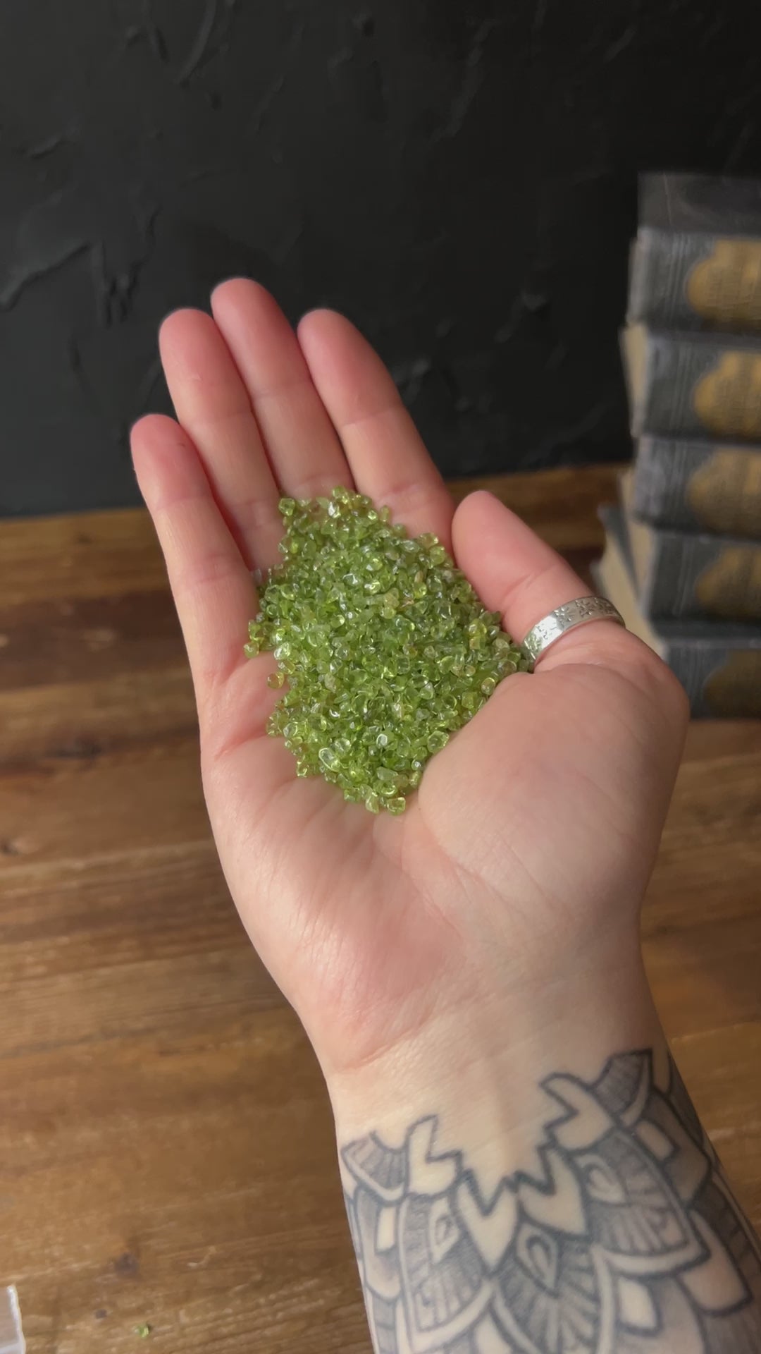 You could scatter these Peridot Crystal Chips in your terrariums, add them to your crystal grids, spell jars, candles, roller balls .... the options are endless. The Cutest Mini Gemstones!