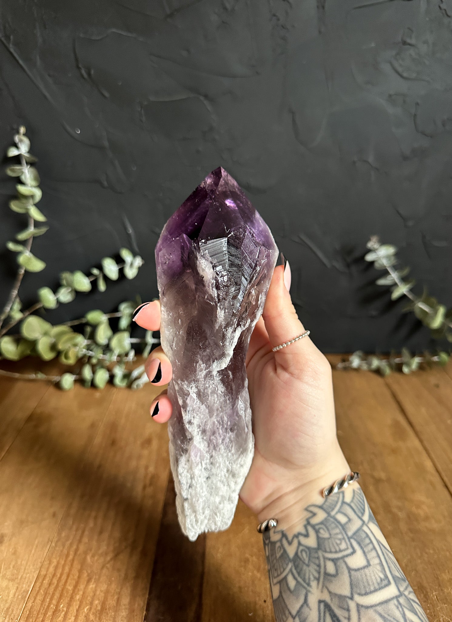This breathtaking Amethyst Root measures 9 inches long x 2.40 inches wide and weighs 688grams. The crystal featured is the exact one you'll receive.