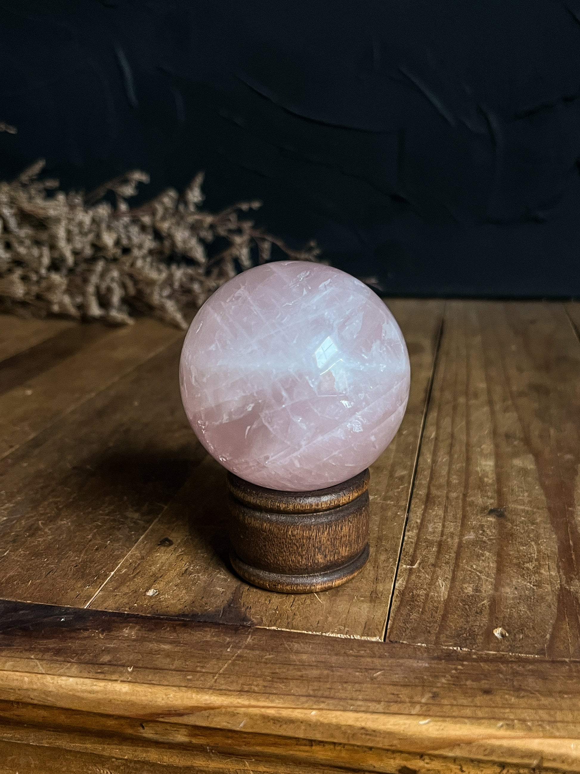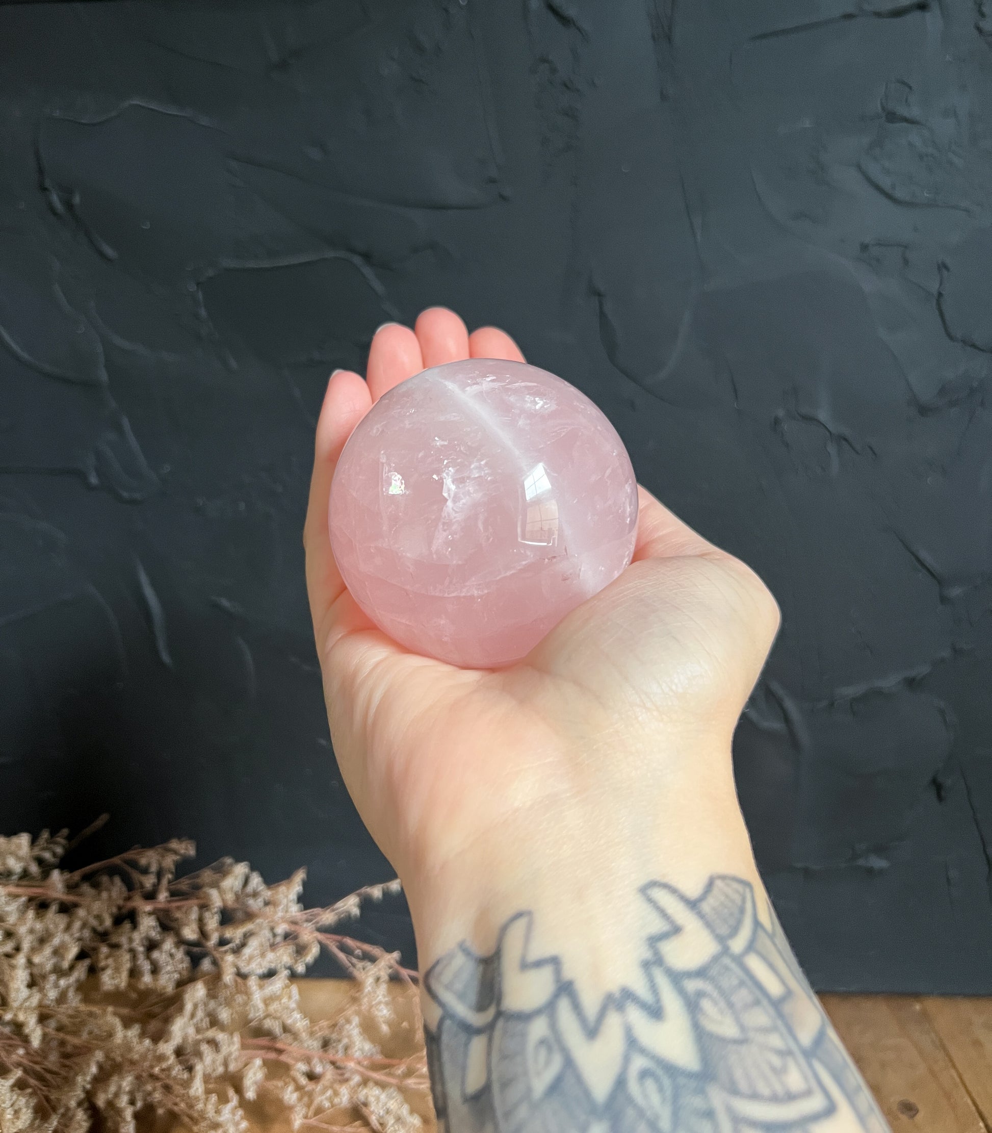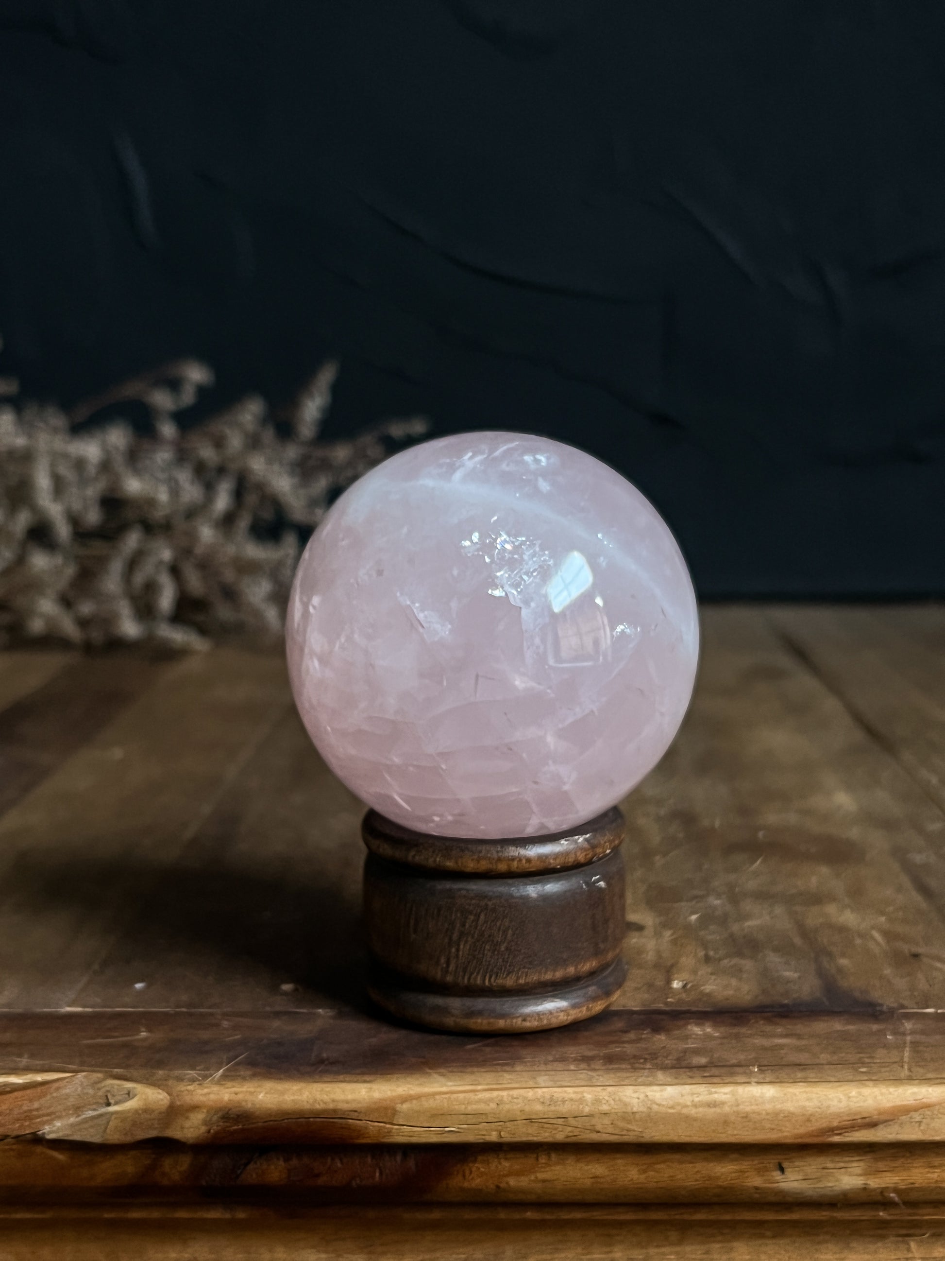 Beautiful little rainbows, shimmers and inclusions through out! This is one of our favourite Rose Quartz Spheres we've come across.
