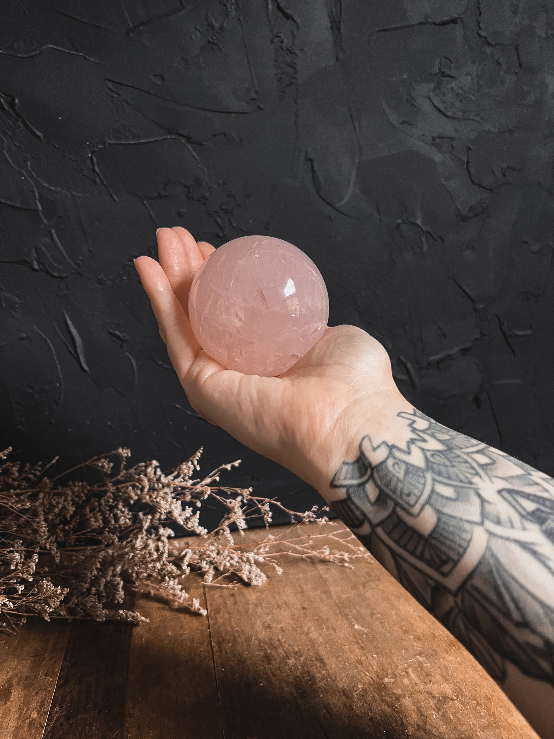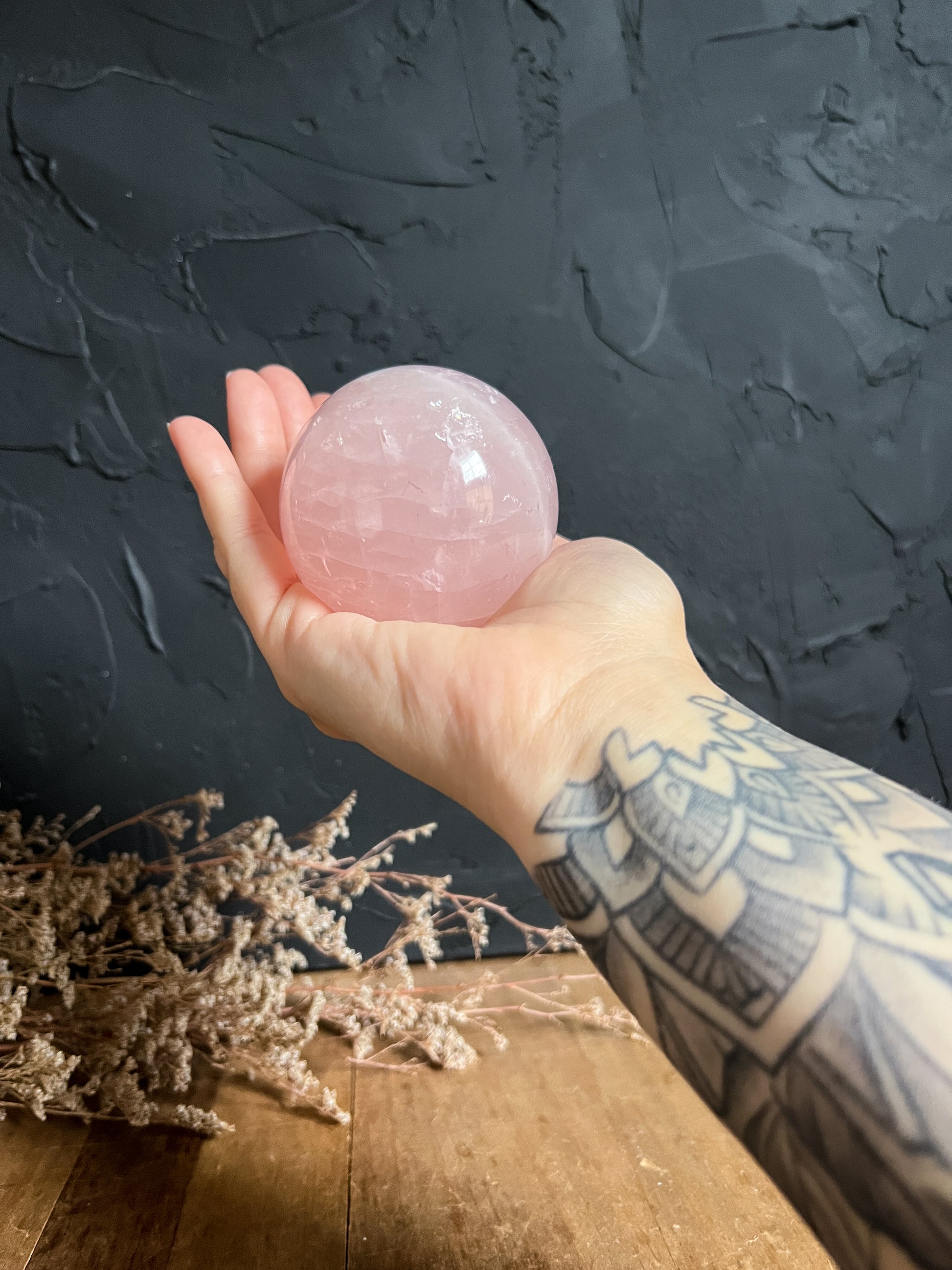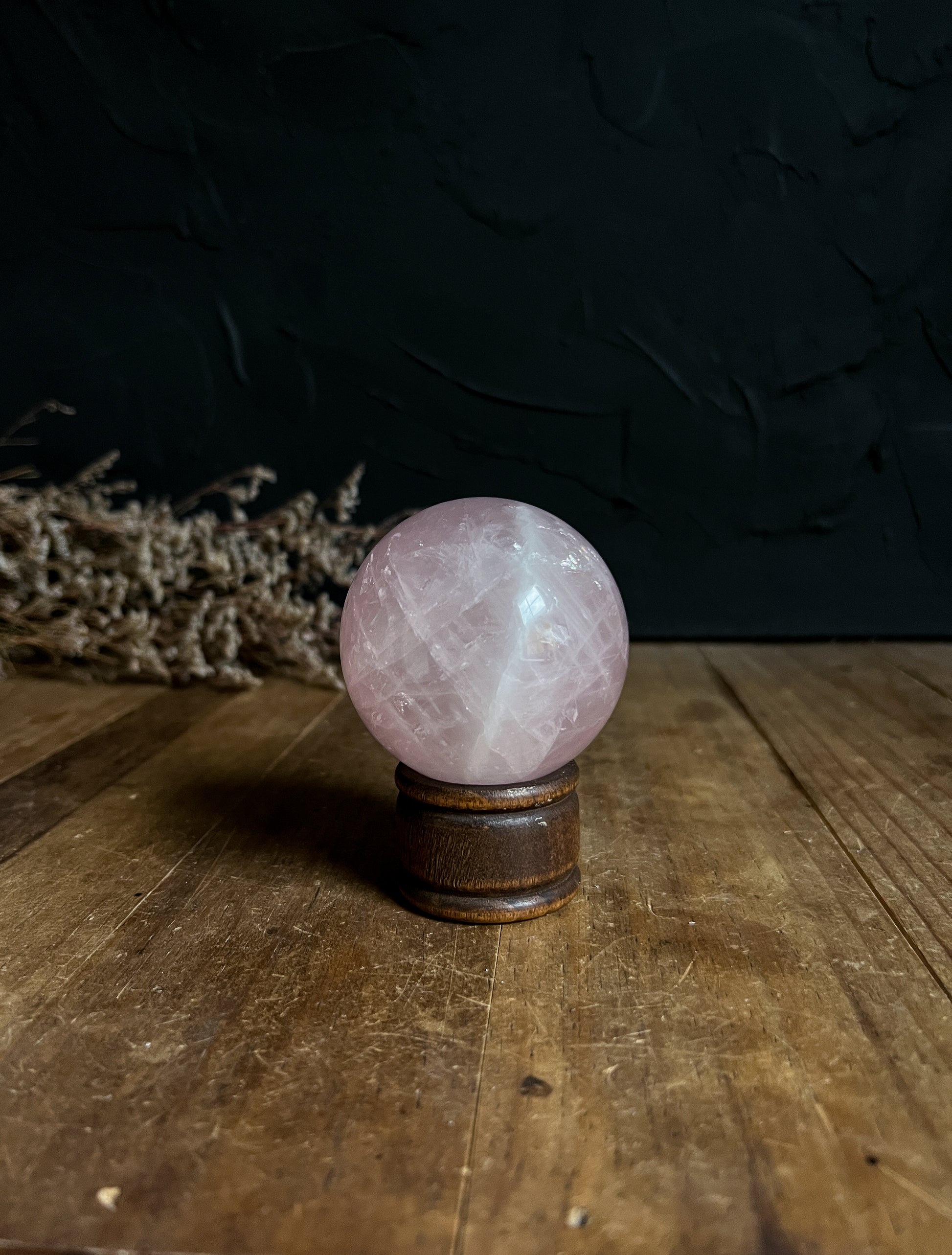 Beautiful little rainbows, shimmers and inclusions through out! This is one of our favourite Rose Quartz Spheres we've come across.
